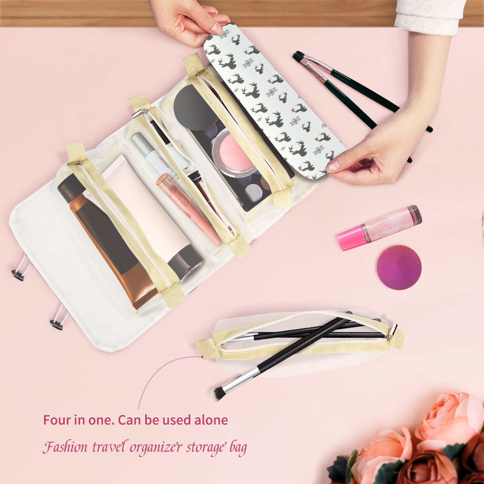 Makeup Bag Organizer Toiletry Bags for Traveling Travel Makeup Organizer Make Up Case Roll Up Toiletry Bag Makeup Bag Raindeer Pattern-01 Travel Cosmetic Bag