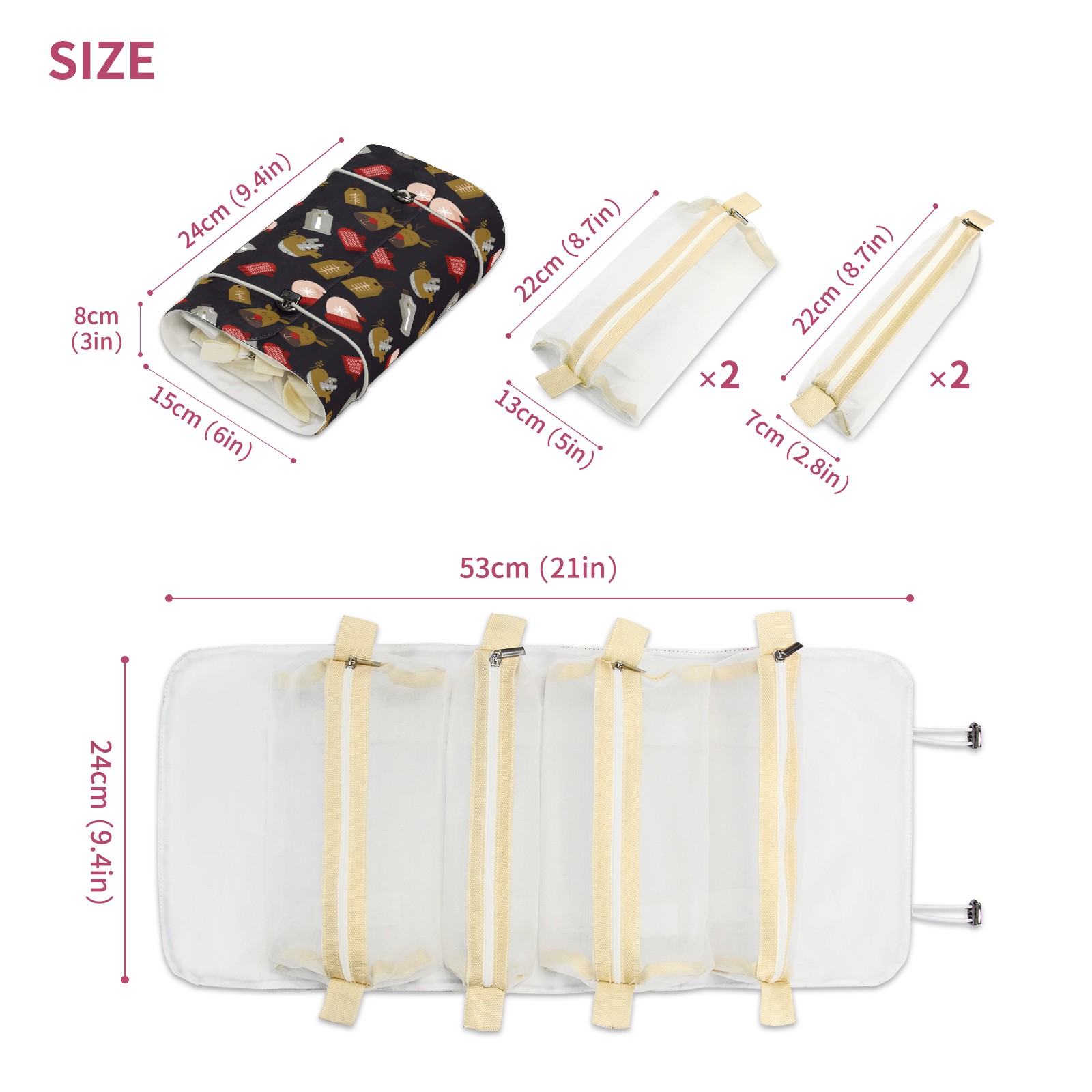 • <p> This is a nice and compact travel/ organizer bag. All the pouches are removable. This makes it very easy to use or pull out what you need in the moment, and not get stuck rummaging through a bag and not being able to find your items. It folds up nicely, and has 2 bungee straps that you can sinch tight to hold. It works great for traveling. </p> <p> </p> <p><b> Notes:&nbsp; </b></p> <p> 1.Due to the difference between different monitors,the picture may not reflect the actual color of the item. We guarantee the style is the same as shown in the pictures.&nbsp; </p> <p> 2.Due to the manual measurement and different measurement methods, please allow 1-3cm deviation.Thanks! </p>
