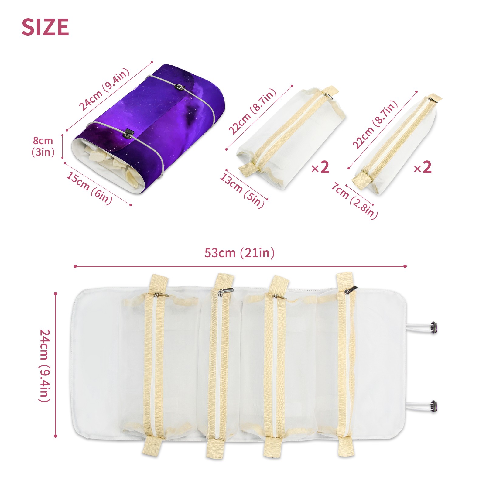 • <p> This is a nice and compact travel/ organizer bag. All the pouches are removable. This makes it very easy to use or pull out what you need in the moment, and not get stuck rummaging through a bag and not being able to find your items. It folds up nicely, and has 2 bungee straps that you can sinch tight to hold. It works great for traveling. </p> <p> </p> <p><b> Notes:&nbsp; </b></p> <p> 1.Due to the difference between different monitors,the picture may not reflect the actual color of the item. We guarantee the style is the same as shown in the pictures.&nbsp; </p> <p> 2.Due to the manual measurement and different measurement methods, please allow 1-3cm deviation.Thanks! </p>