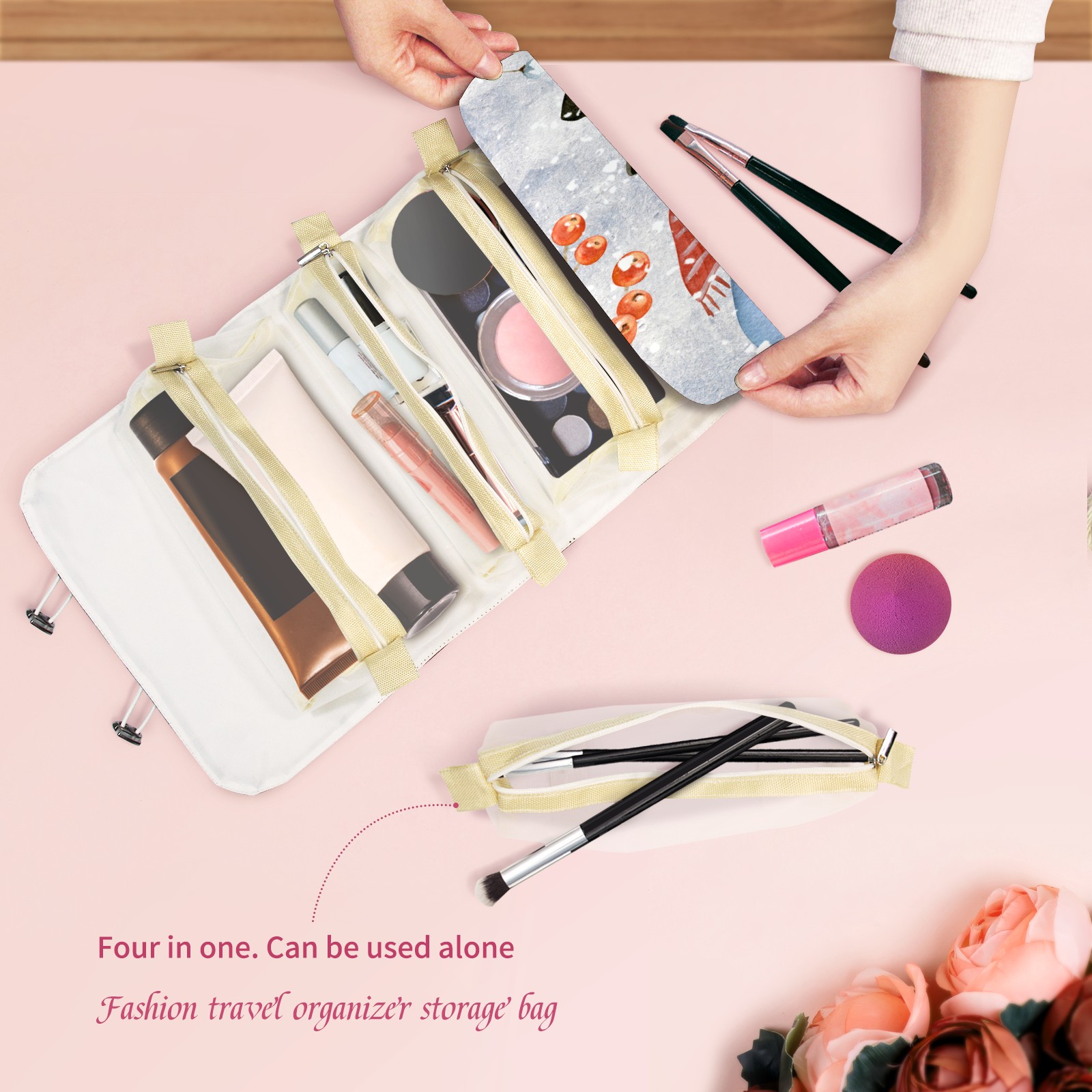 <p> This is a nice and compact travel/ organizer bag. All the pouches are removable. This makes it very easy to use or pull out what you need in the moment, and not get stuck rummaging through a bag and not being able to find your items. It folds up nicely, and has 2 bungee straps that you can sinch tight to hold. It works great for traveling. </p> <p> </p> <p><b> Notes:&nbsp; </b></p> <p> 1.Due to the difference between different monitors,the picture may not reflect the actual color of the item. We guarantee the style is the same as shown in the pictures.&nbsp; </p> <p> 2.Due to the manual measurement and different measurement methods, please allow 1-3cm deviation.Thanks! </p>