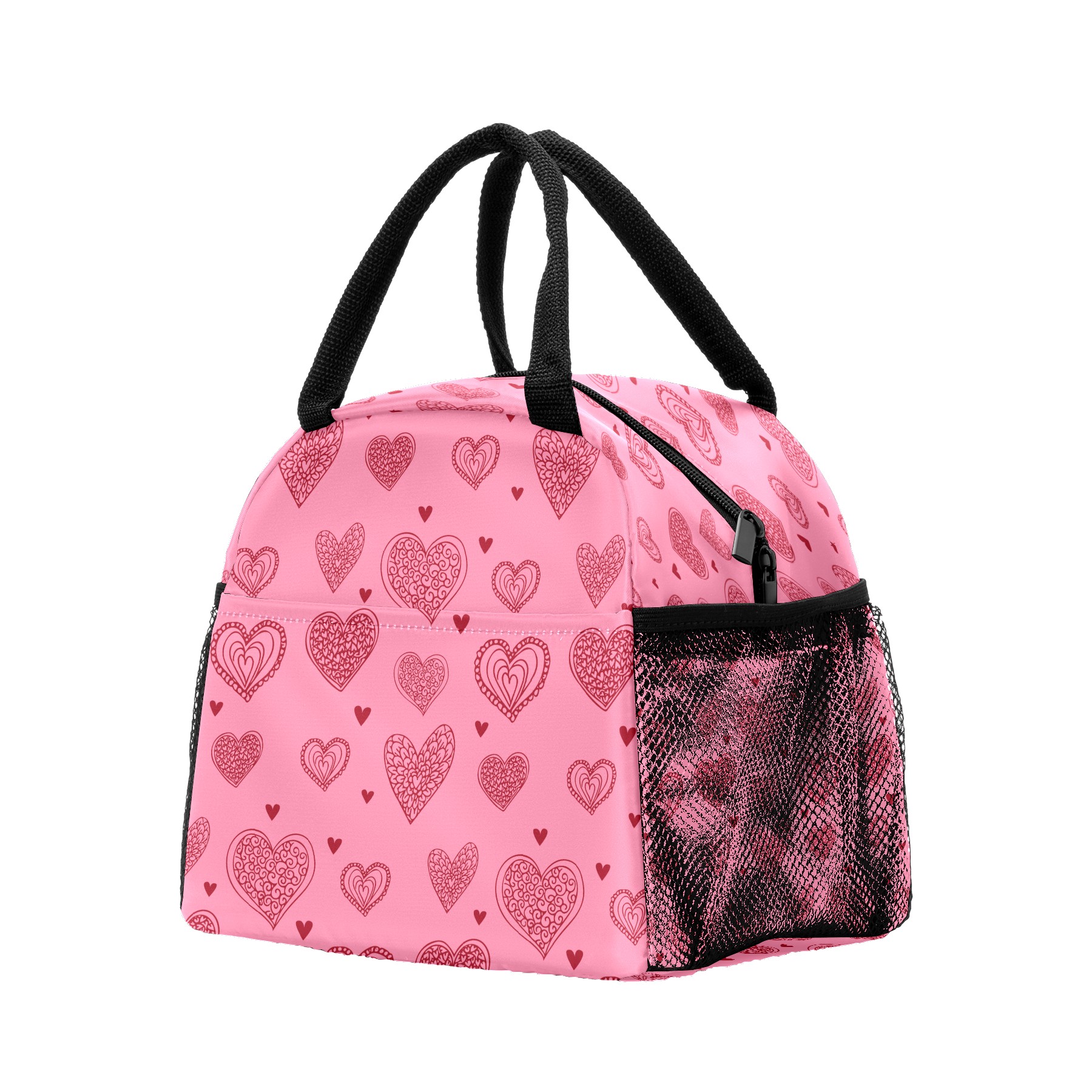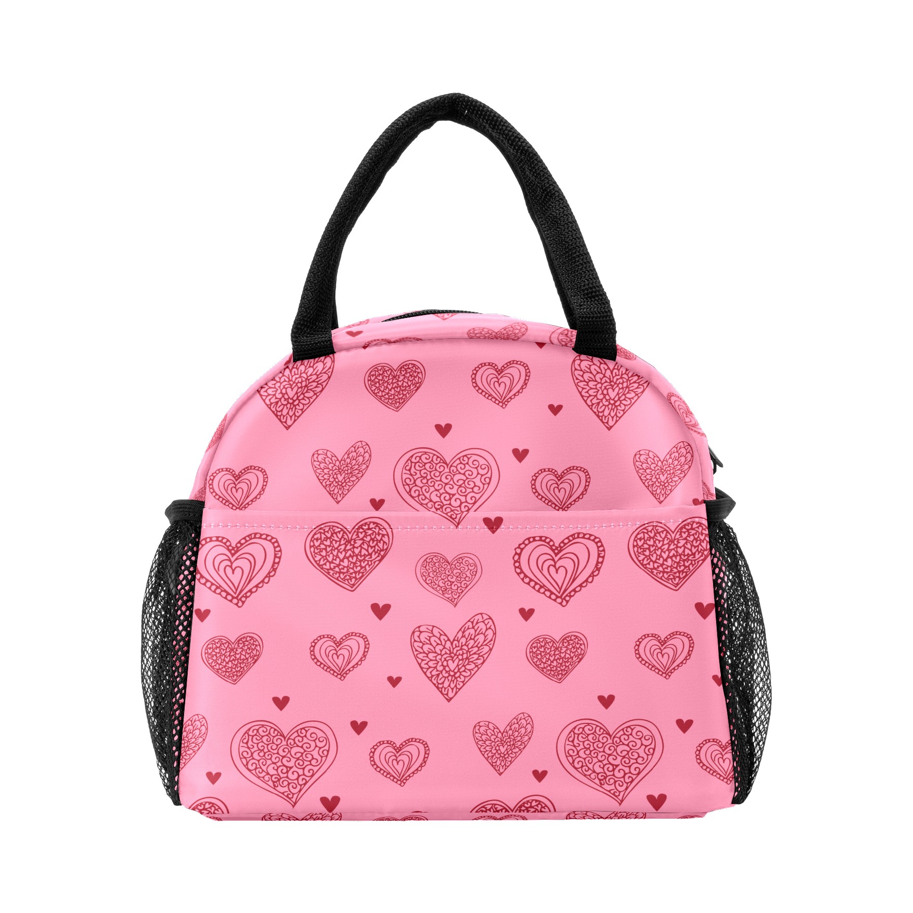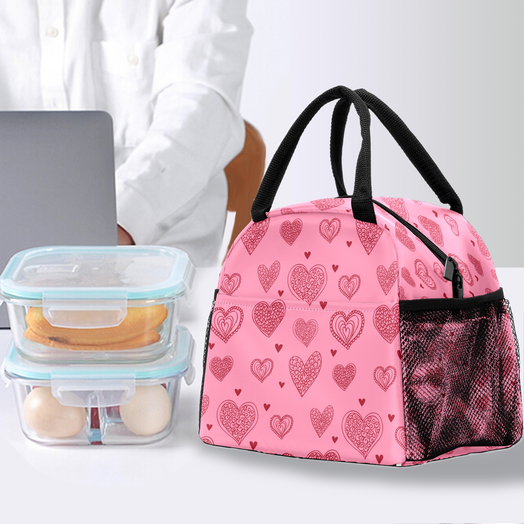 Lunch Bag for Women Men, Retro Pink Love Heart Pattern Insulated Reusable Lunch Box Thermal Cooler Tote Bag for Work Picnic Hiking Travel Beach