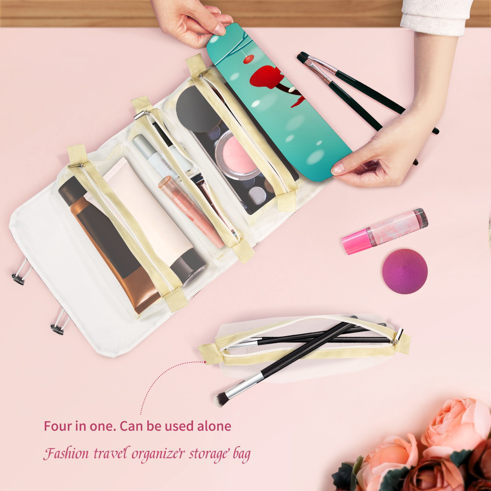 • <p> This is a nice and compact travel/ organizer bag. All the pouches are removable. This makes it very easy to use or pull out what you need in the moment, and not get stuck rummaging through a bag and not being able to find your items. It folds up nicely, and has 2 bungee straps that you can sinch tight to hold. It works great for traveling. </p> <p> </p> <p><b> Notes:&nbsp; </b></p> <p> 1.Due to the difference between different monitors,the picture may not reflect the actual color of the item. We guarantee the style is the same as shown in the pictures.&nbsp; </p> <p> 2.Due to the manual measurement and different measurement methods, please allow 1-3cm deviation.Thanks! </p>