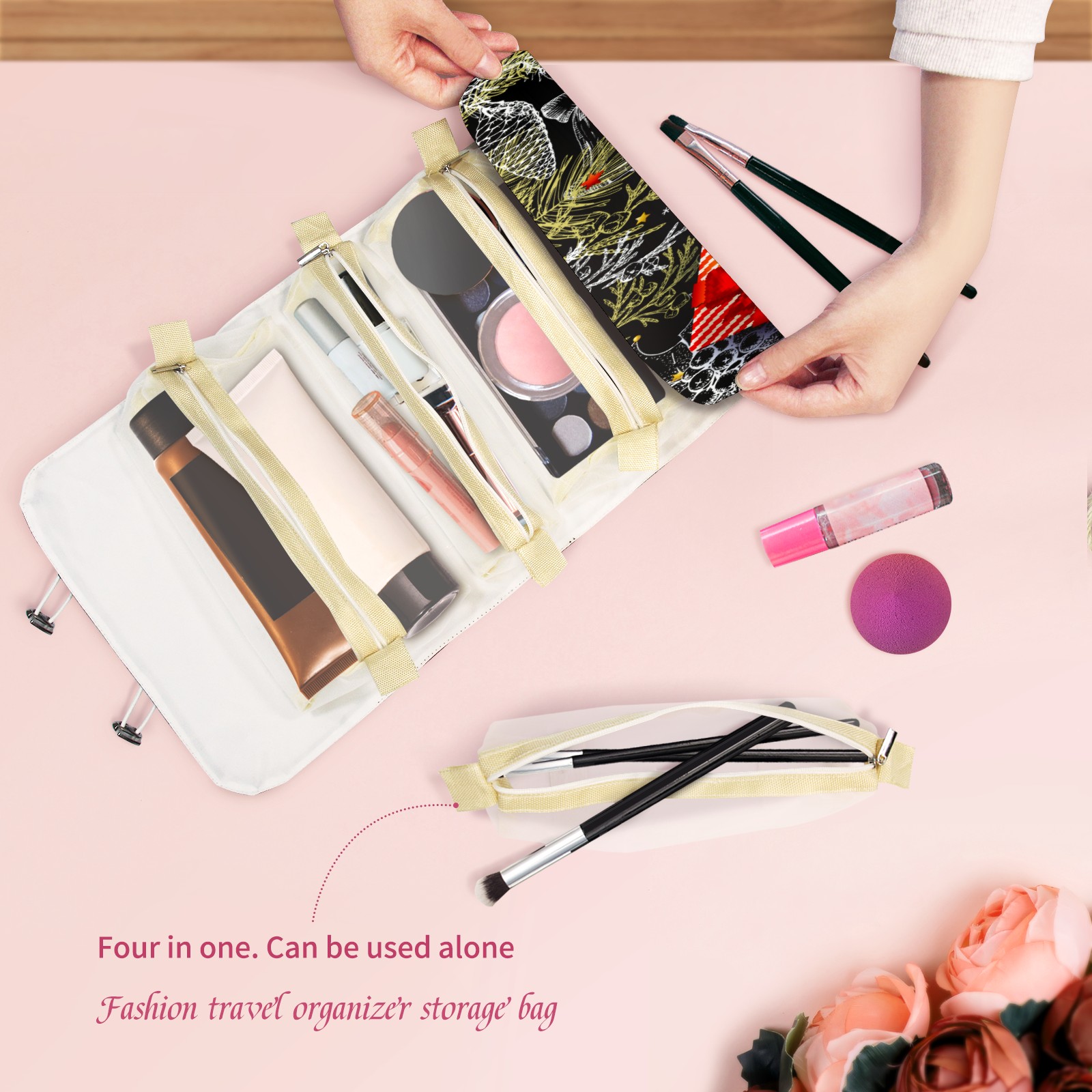 <p> This is a nice and compact travel/ organizer bag. All the pouches are removable. This makes it very easy to use or pull out what you need in the moment, and not get stuck rummaging through a bag and not being able to find your items. It folds up nicely, and has 2 bungee straps that you can sinch tight to hold. It works great for traveling. </p> <p> </p> <p><b> Notes:&nbsp; </b></p> <p> 1.Due to the difference between different monitors,the picture may not reflect the actual color of the item. We guarantee the style is the same as shown in the pictures.&nbsp; </p> <p> 2.Due to the manual measurement and different measurement methods, please allow 1-3cm deviation.Thanks! </p>