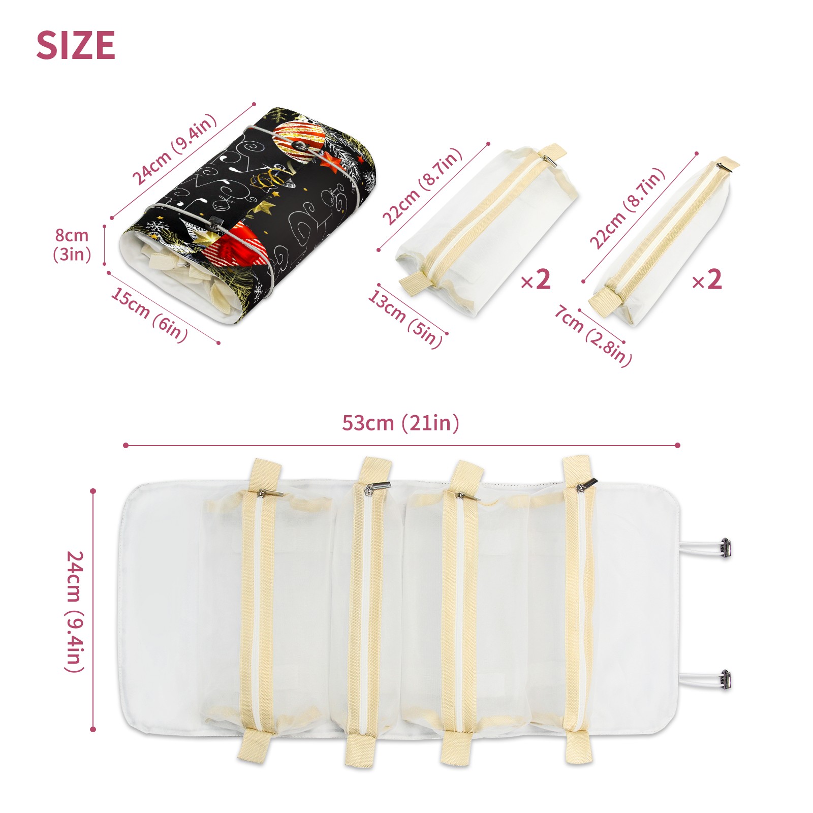 • <p> This is a nice and compact travel/ organizer bag. All the pouches are removable. This makes it very easy to use or pull out what you need in the moment, and not get stuck rummaging through a bag and not being able to find your items. It folds up nicely, and has 2 bungee straps that you can sinch tight to hold. It works great for traveling. </p> <p> </p> <p><b> Notes:&nbsp; </b></p> <p> 1.Due to the difference between different monitors,the picture may not reflect the actual color of the item. We guarantee the style is the same as shown in the pictures.&nbsp; </p> <p> 2.Due to the manual measurement and different measurement methods, please allow 1-3cm deviation.Thanks! </p>