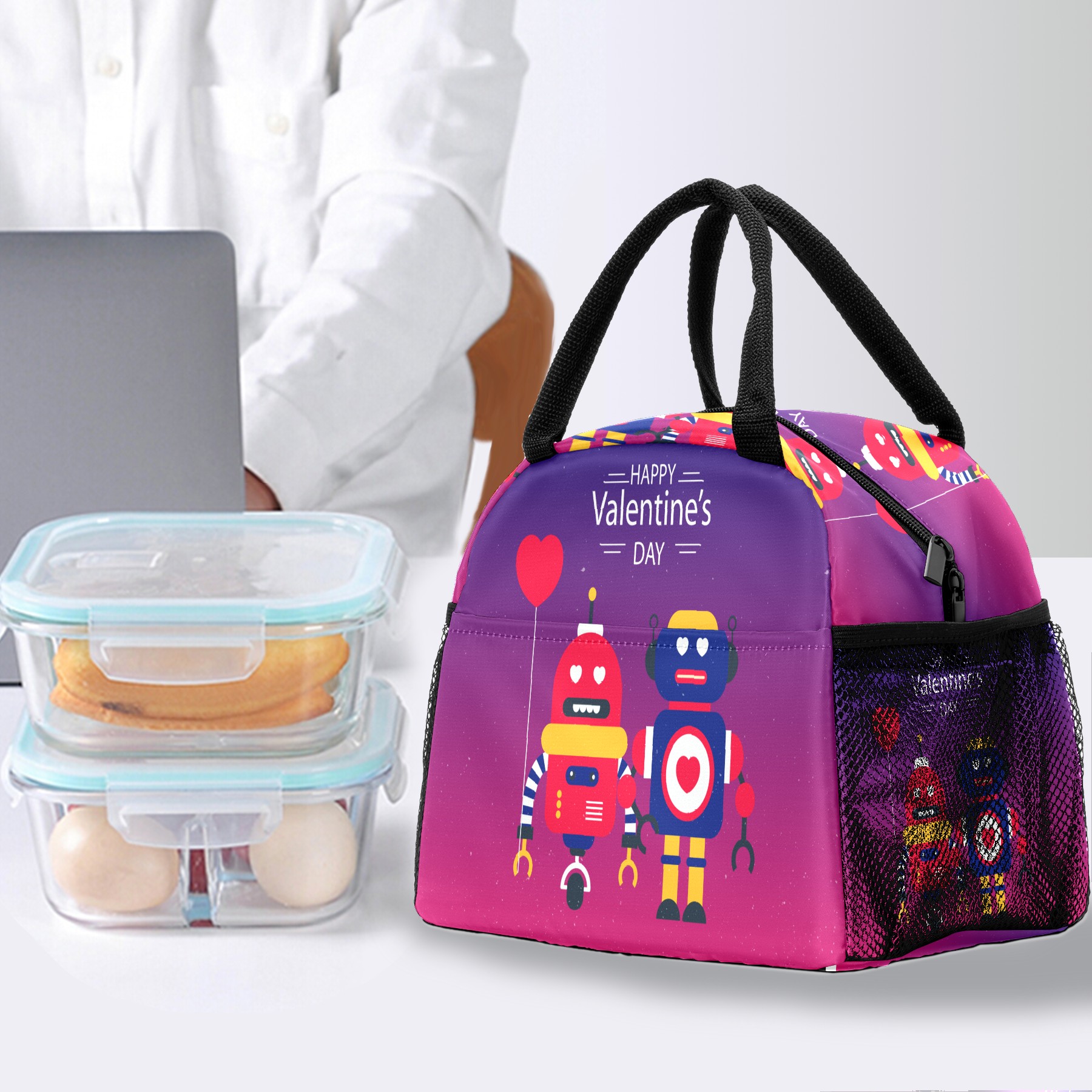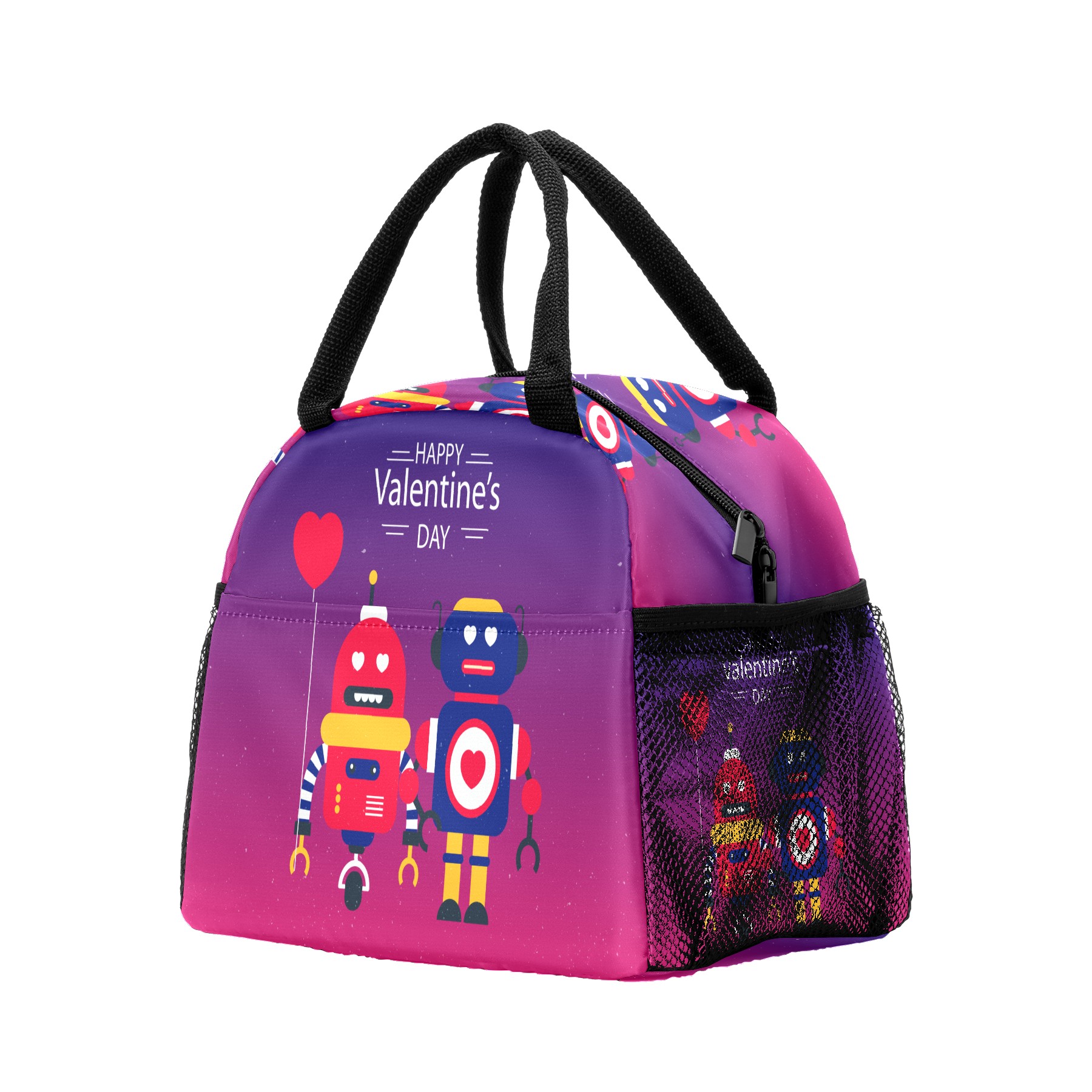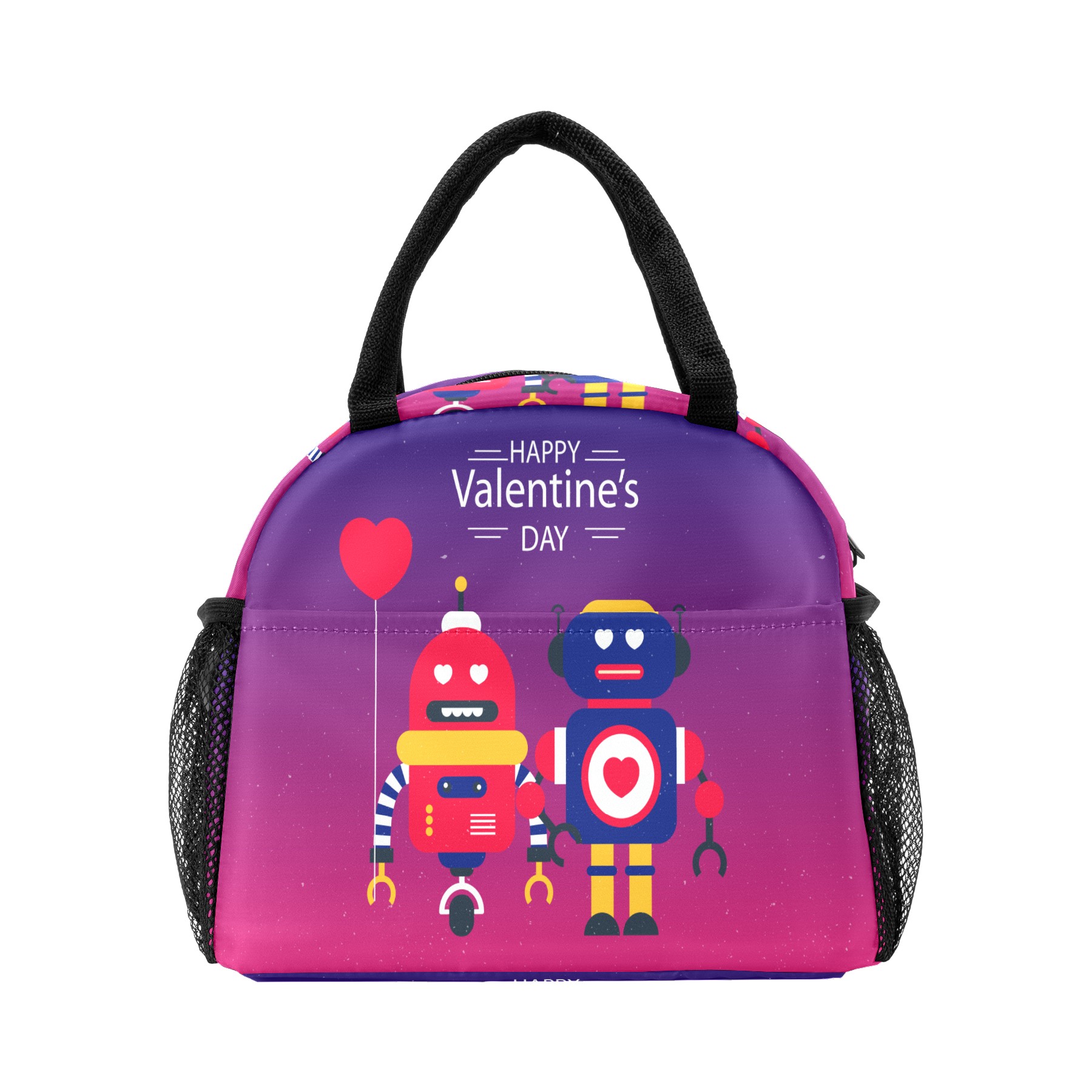Lunch Bag for Women Men, Happy Valentine's Day Robot Love Insulated Reusable Lunch Box Thermal Cooler Tote Bag for Work Picnic Hiking Travel Beach