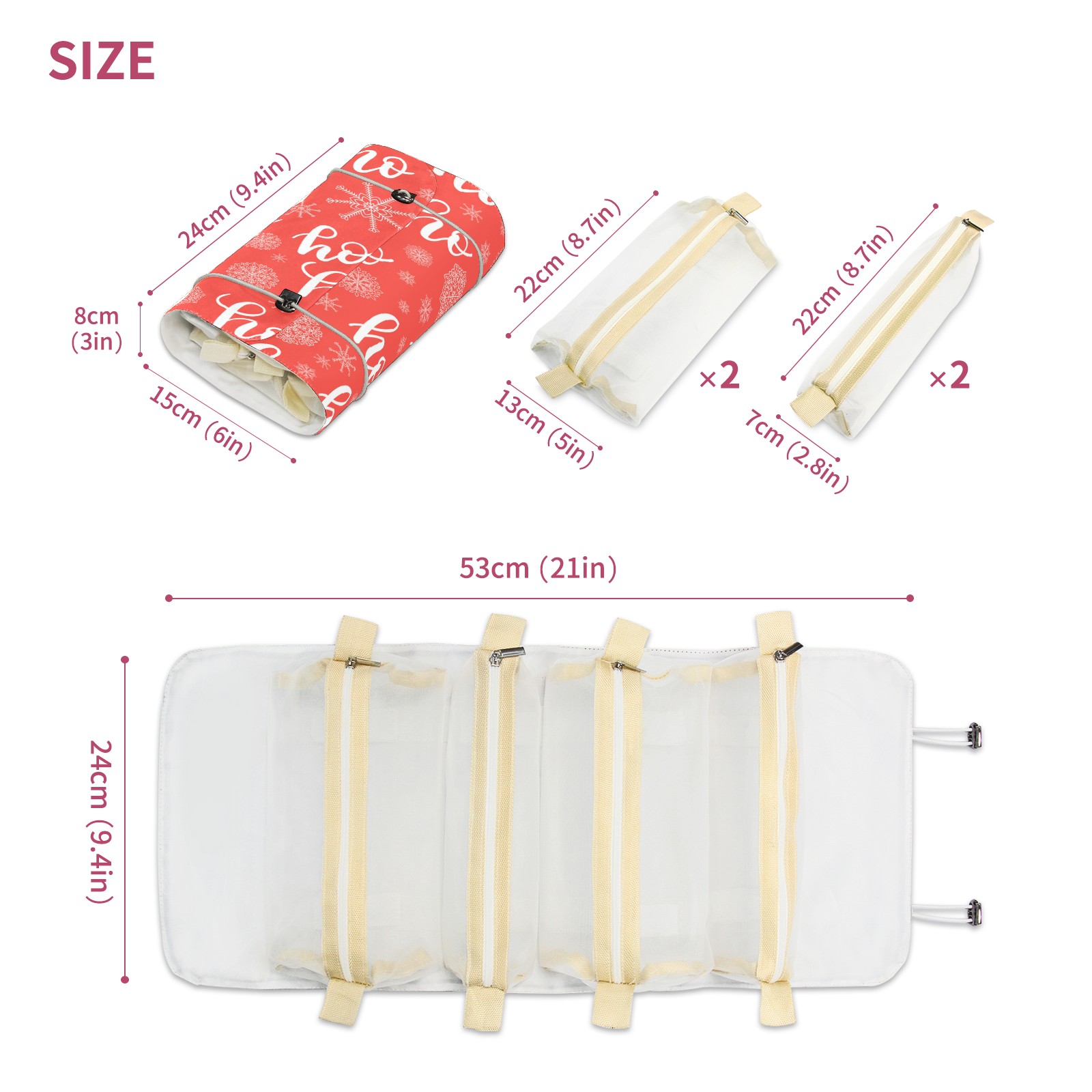 • <p> This is a nice and compact travel/ organizer bag. All the pouches are removable. This makes it very easy to use or pull out what you need in the moment, and not get stuck rummaging through a bag and not being able to find your items. It folds up nicely, and has 2 bungee straps that you can sinch tight to hold. It works great for traveling. </p> <p> </p> <p><b> Notes:&nbsp; </b></p> <p> 1.Due to the difference between different monitors,the picture may not reflect the actual color of the item. We guarantee the style is the same as shown in the pictures.&nbsp; </p> <p> 2.Due to the manual measurement and different measurement methods, please allow 1-3cm deviation.Thanks! </p>