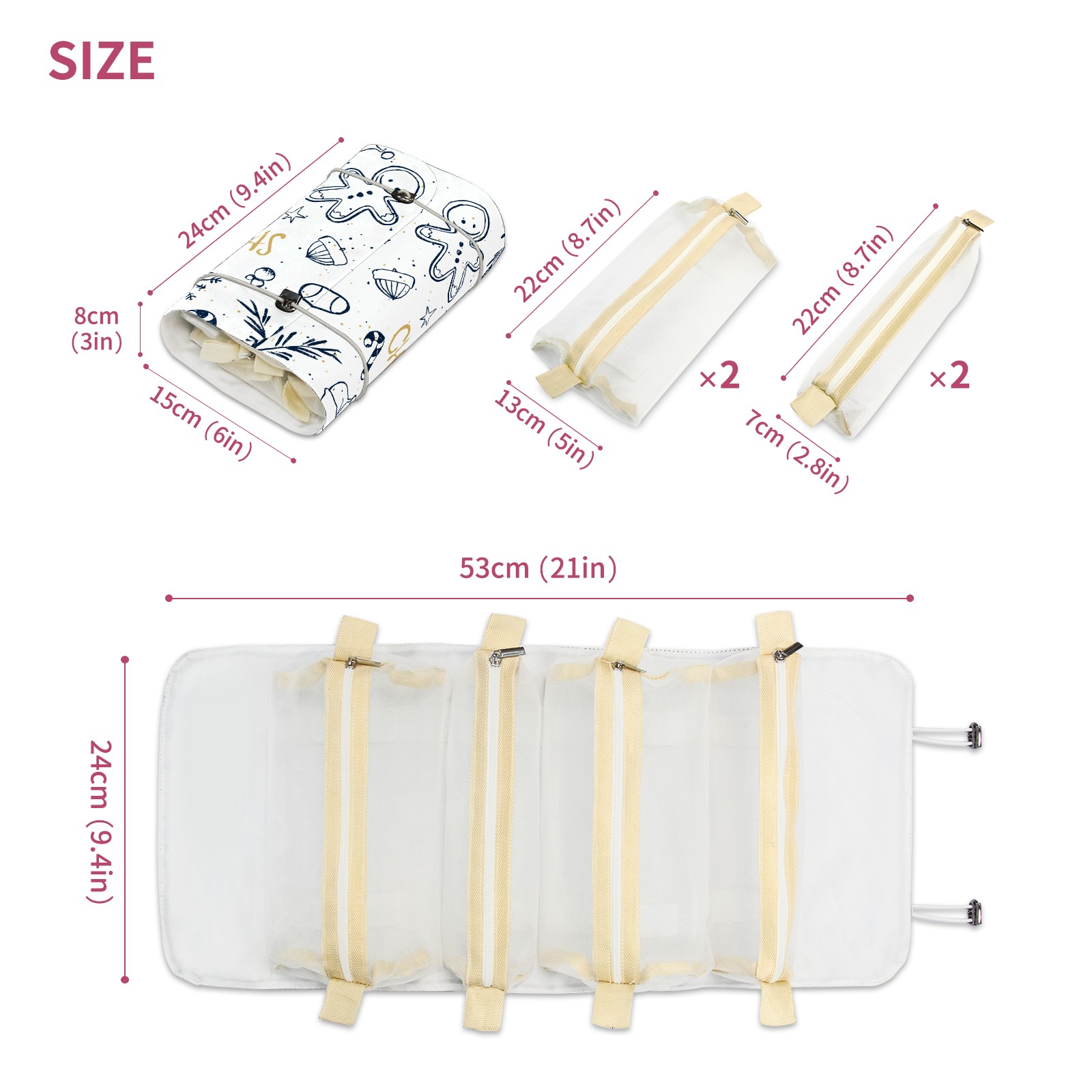 • <p> This is a nice and compact travel/ organizer bag. All the pouches are removable. This makes it very easy to use or pull out what you need in the moment, and not get stuck rummaging through a bag and not being able to find your items. It folds up nicely, and has 2 bungee straps that you can sinch tight to hold. It works great for traveling. </p> <p> </p> <p><b> Notes:&nbsp; </b></p> <p> 1.Due to the difference between different monitors,the picture may not reflect the actual color of the item. We guarantee the style is the same as shown in the pictures.&nbsp; </p> <p> 2.Due to the manual measurement and different measurement methods, please allow 1-3cm deviation.Thanks! </p>