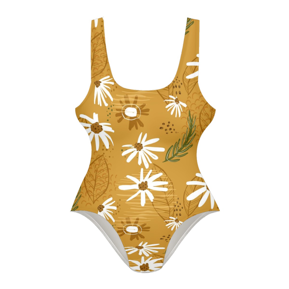 Women Swimsuit White Daisy Flowers Green Leaves Borwn Background One Piece Swimwear