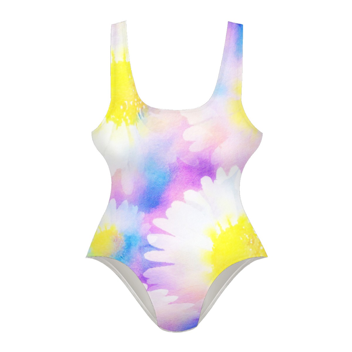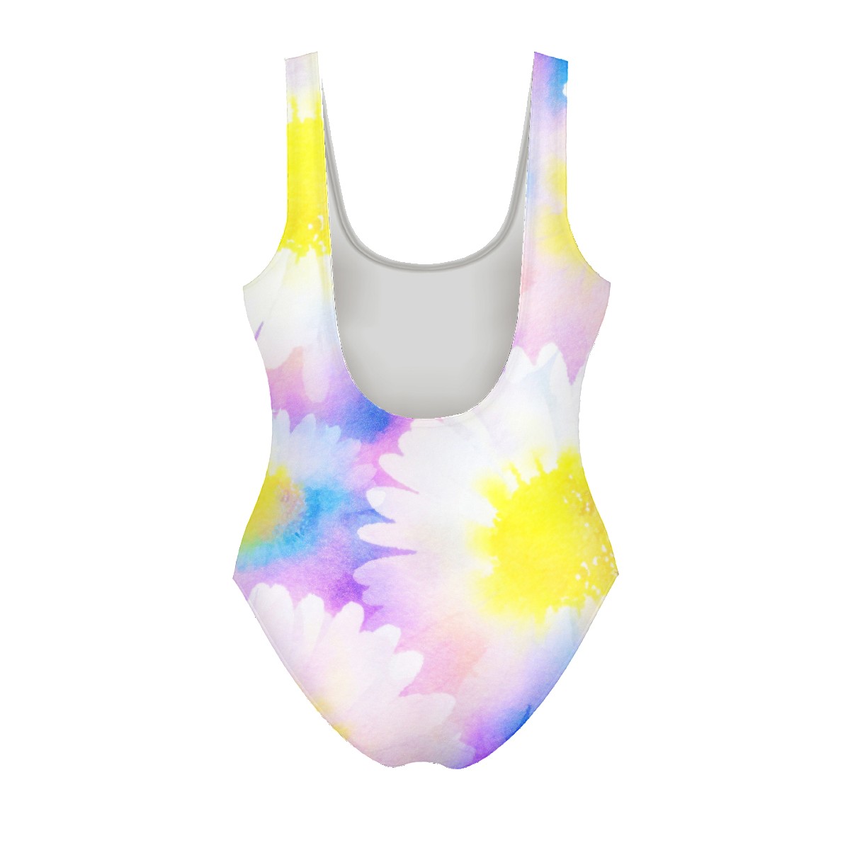 Women Swimsuit Watercolor Daisy Flowers Yellow White Pink One Piece Swimwear