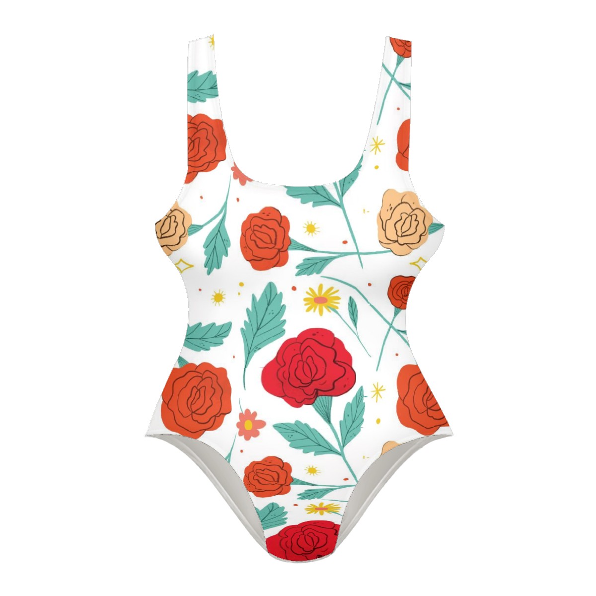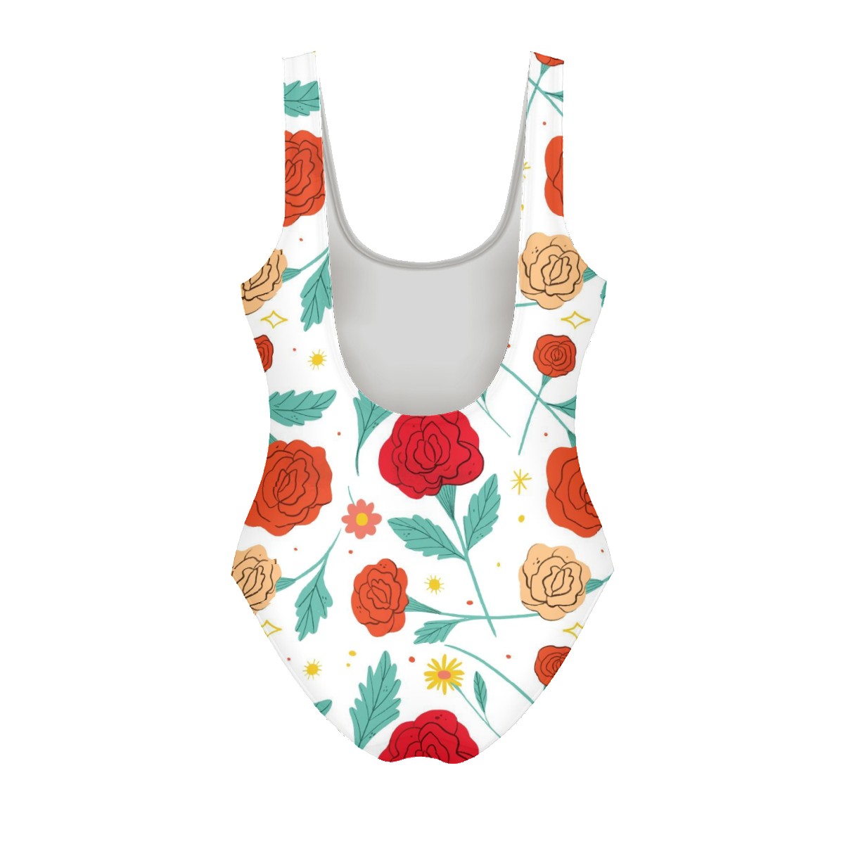 Women Swimsuit Red Orange Flowers Green Leaves Rose One Piece Swimwear