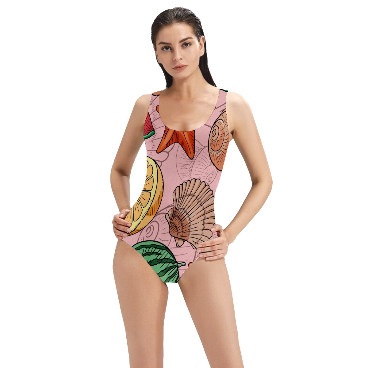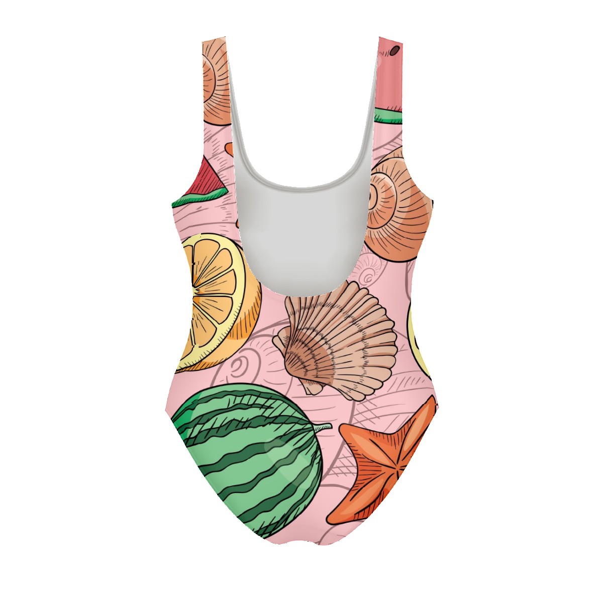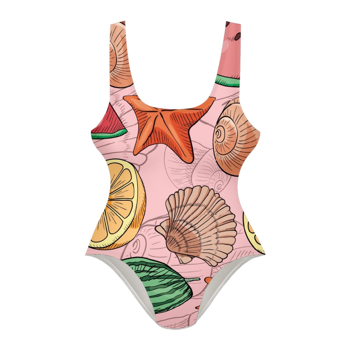 Women Swimsuit Hand Drawn Watermelon Conch Starfish Lemon Sea Shell One Piece Swimwear