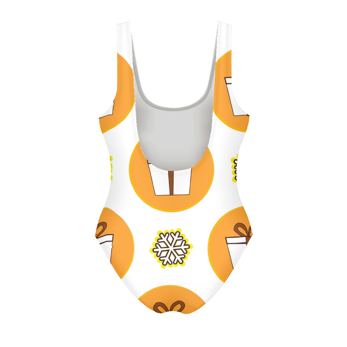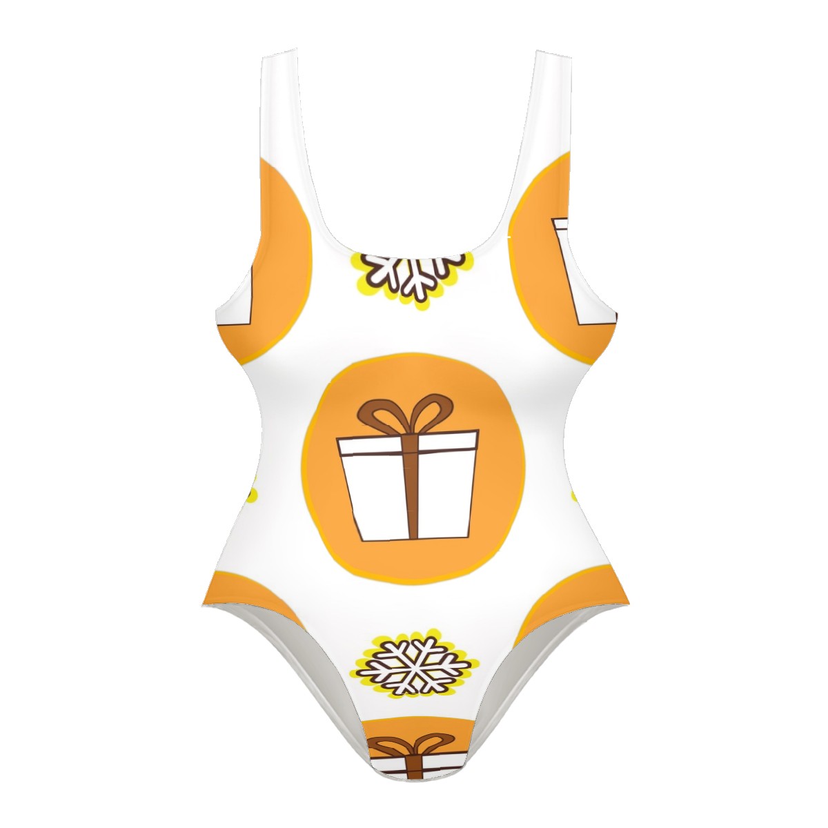Women Swimsuit Gift Boxes Snowflakes Orange Pattern One Piece Swimwear