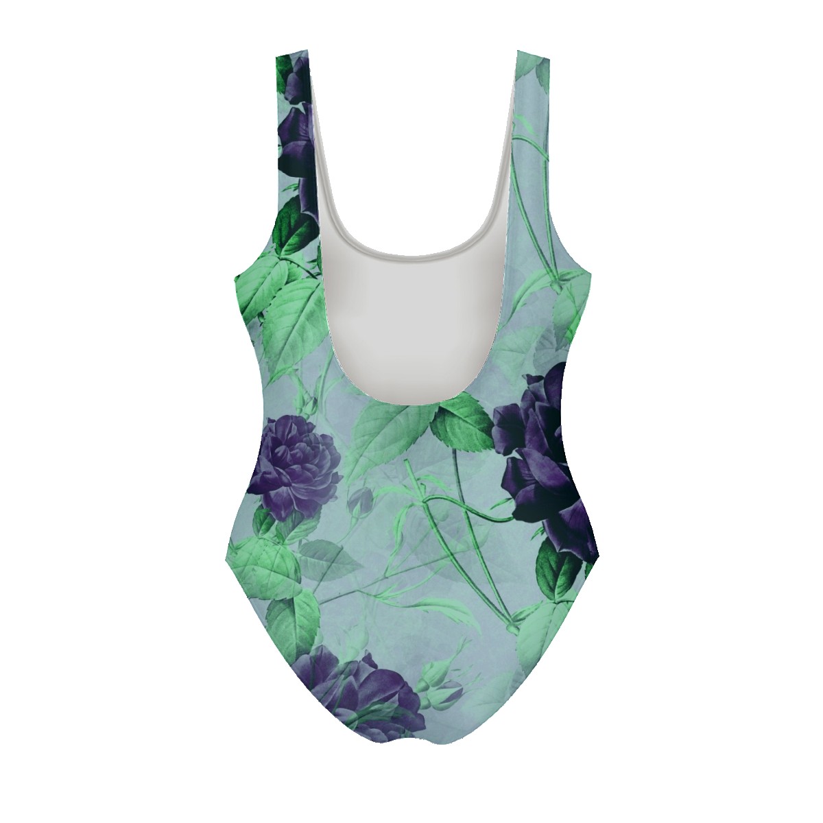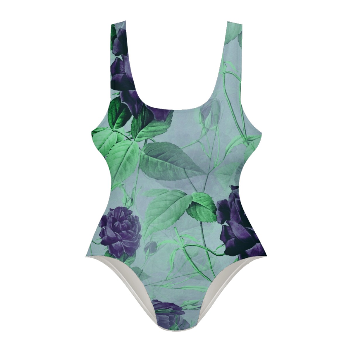 Women Swimsuit Dark Purple Flowers Green Leaves Foggy One Piece Swimwear
