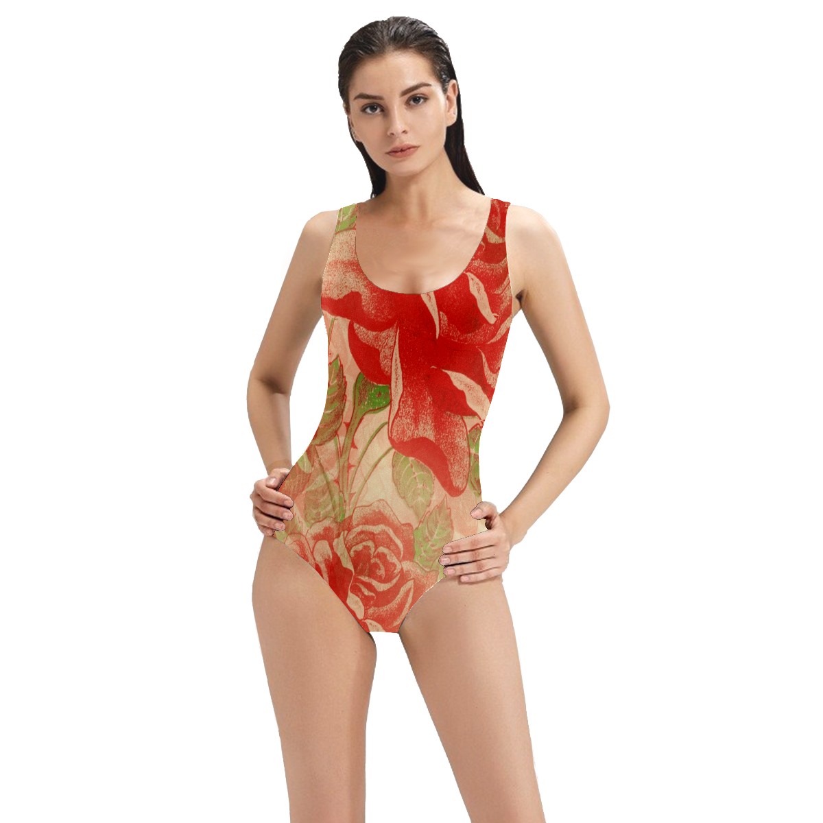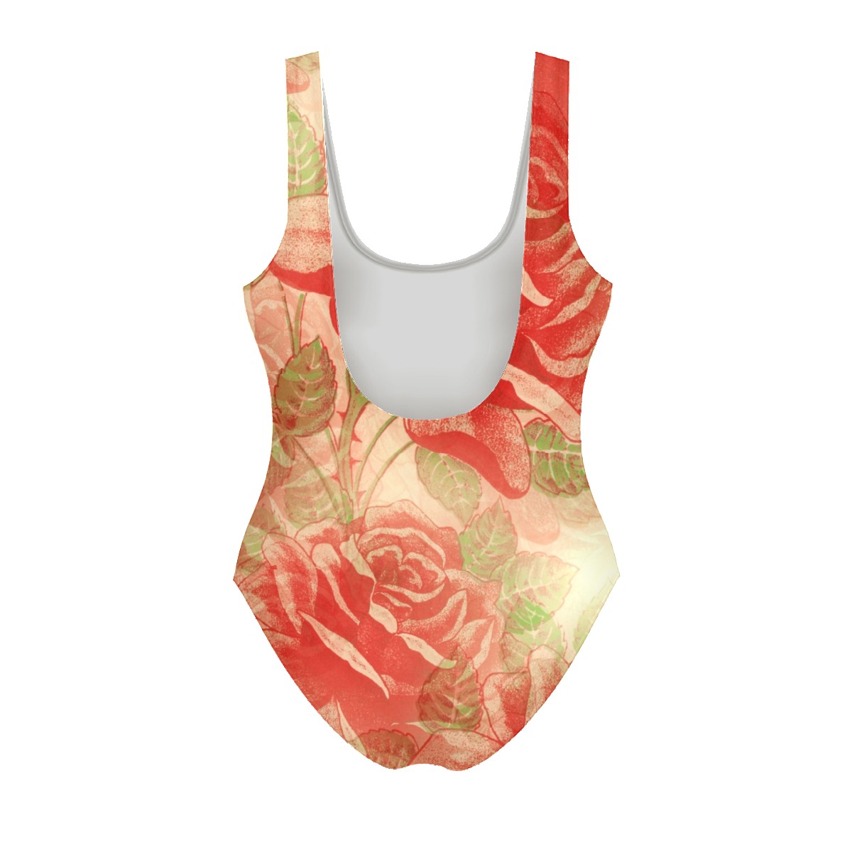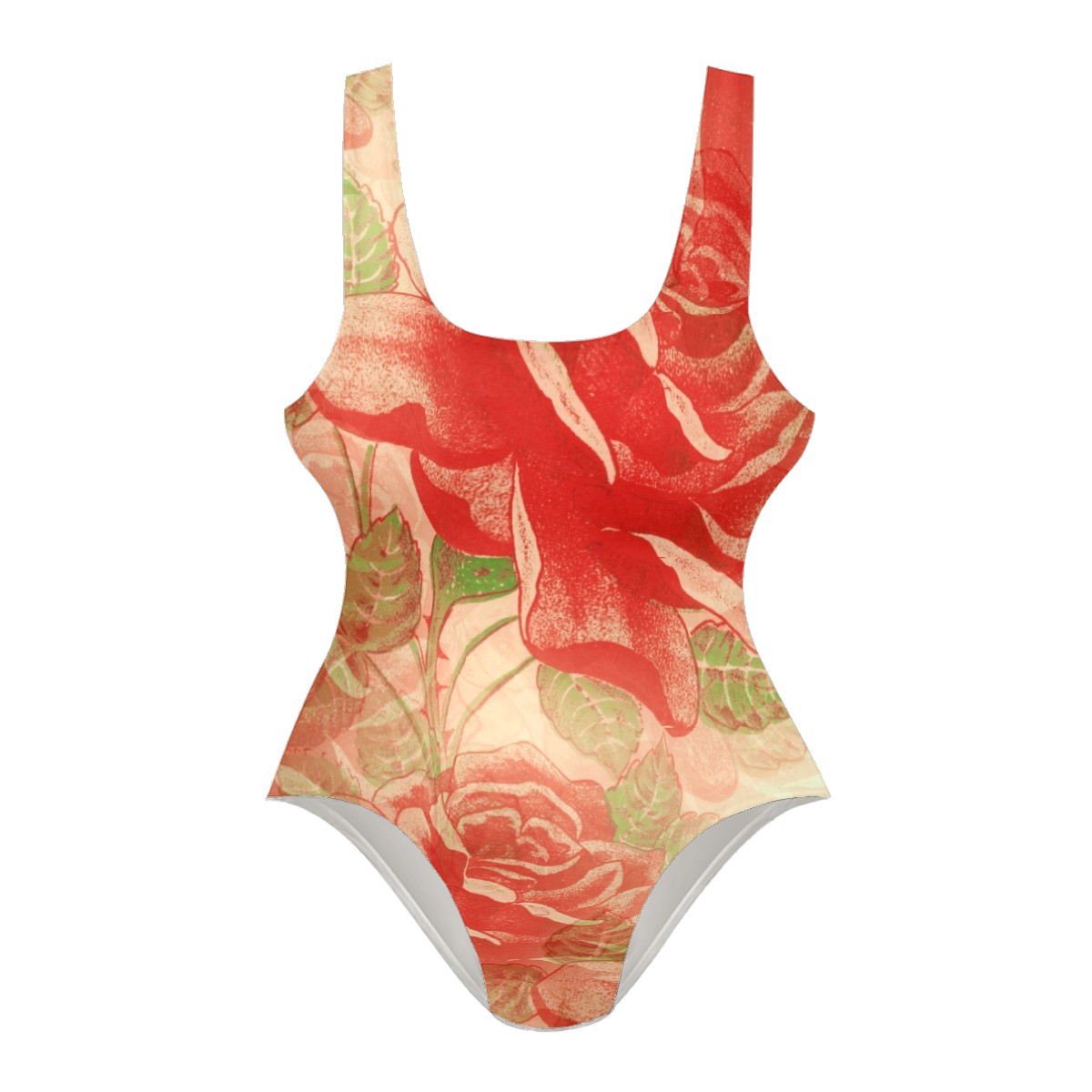 Women Swimsuit Art Red Peony Flowers Blooming One Piece Swimwear