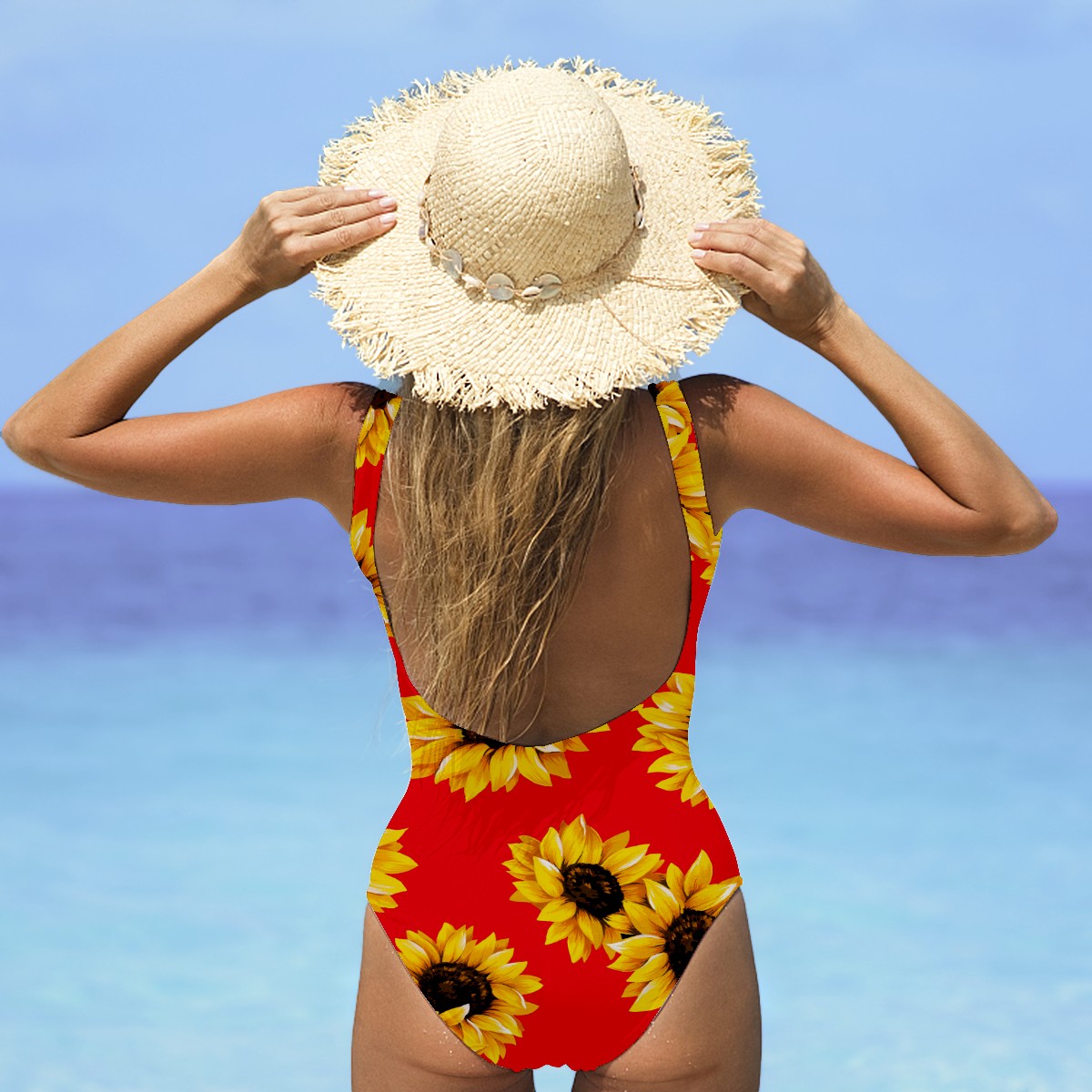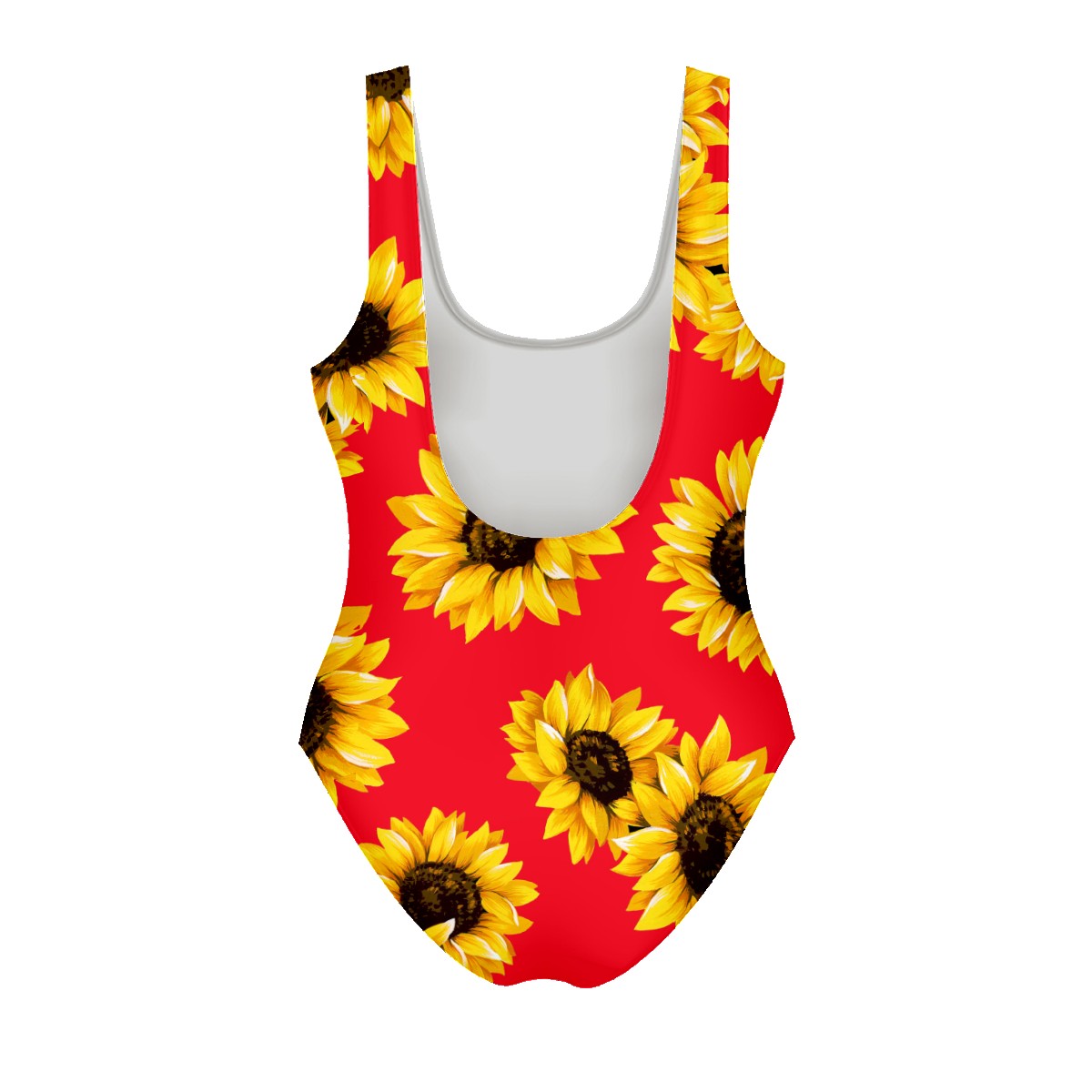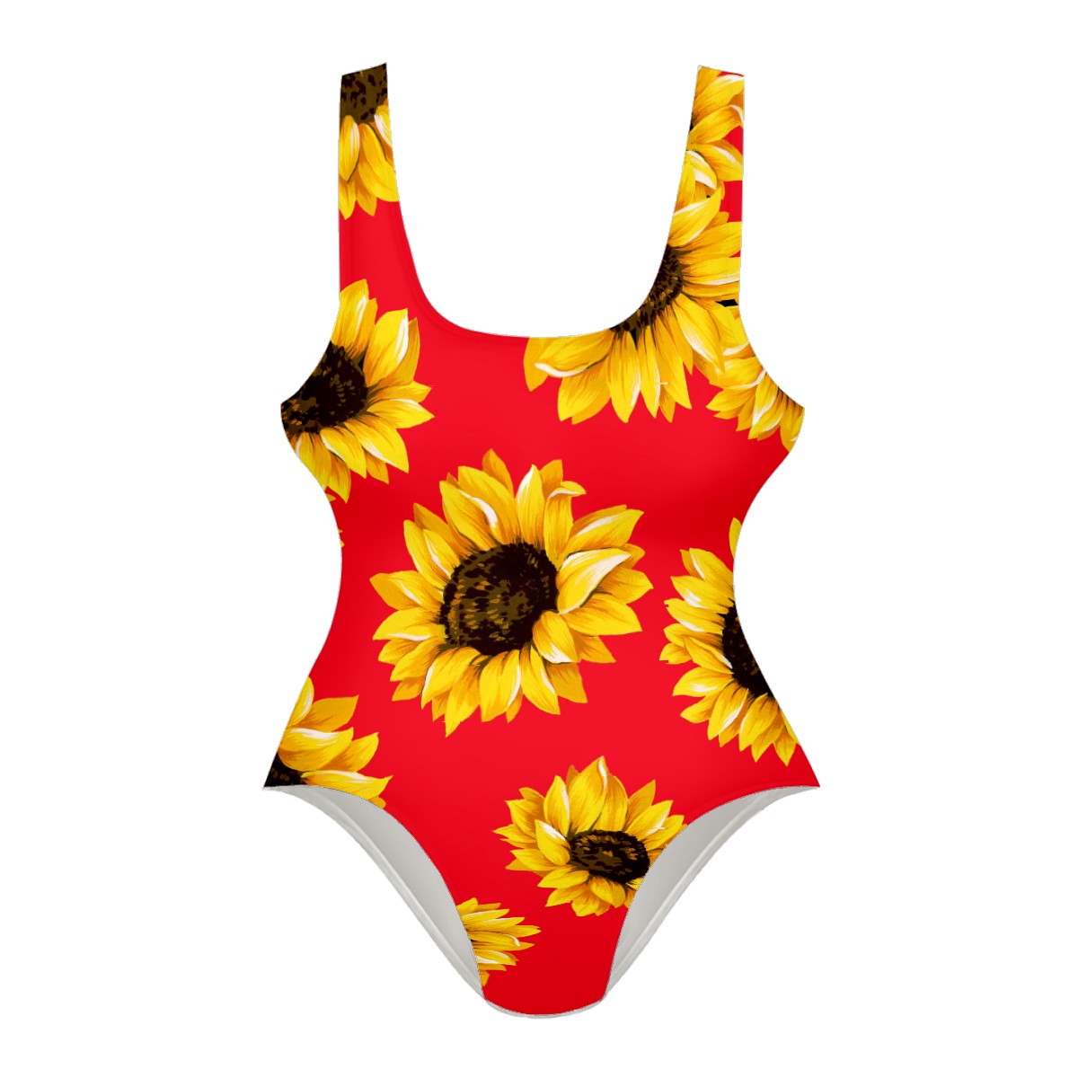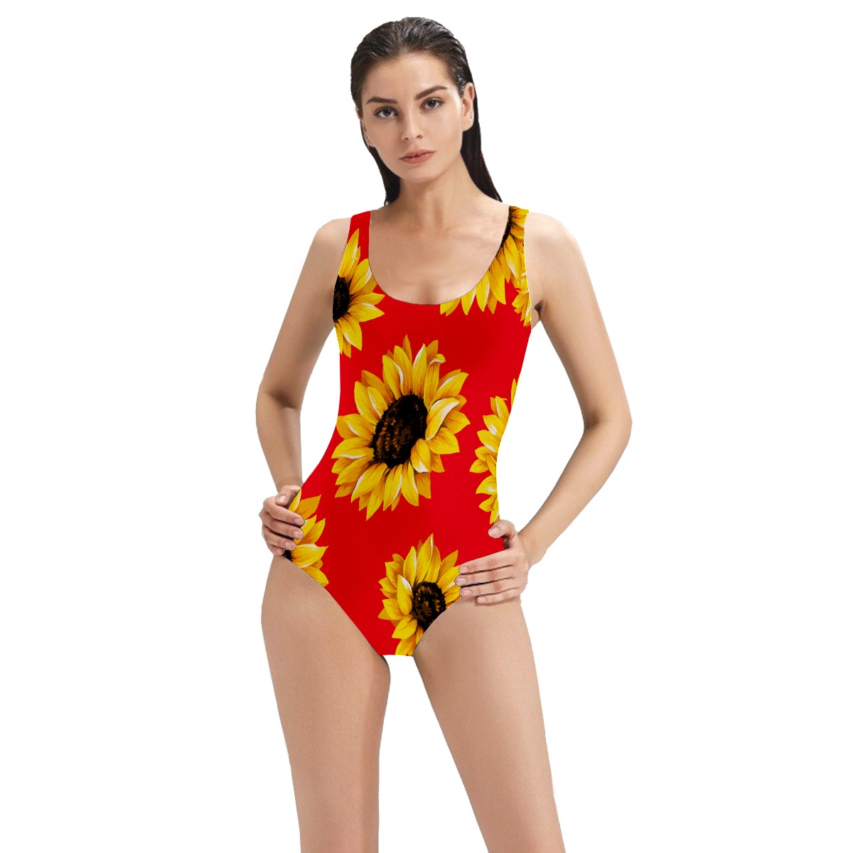 Women Swimsuit Red Background Yellow Sunflowers One Piece Swimwear