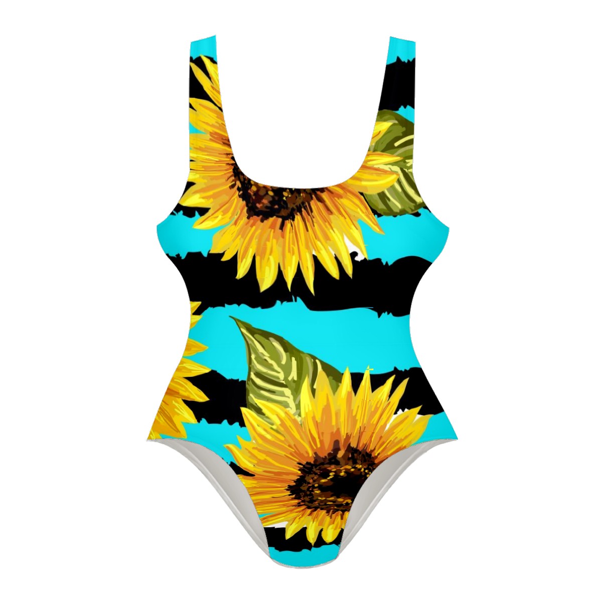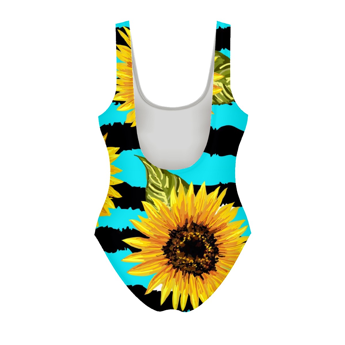Women Swimsuit Plant Sunflower Blue Black Stripes One Piece Swimwear