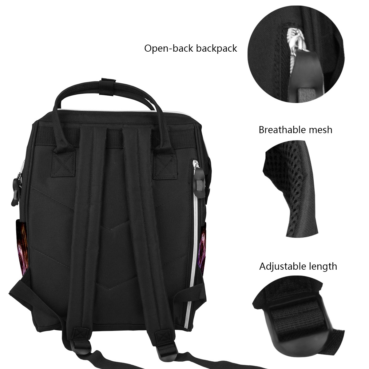 <p><b>Practical and Durable Diaper Bag Backpack </b></p><p><b>Spacious Diaper Backpack for Mom and Dad</b></p><p>Great organizer baby bag for all sorts of baby stuff. You get well-layered compartments to keep separated wet and dry nappies, bottles, diaper cloths;side pockets for baby wipes, umbrella, drinking bottle or more; Super easy glance-and-reach via wide open mouth and zipper on the back.</p><p><b>Lightweight and Comfortable</b></p><p>Premium canvas&nbsp;fabric weight less than 1.3&nbsp;pounds, you get a lightweight diaper backpack that can be packed with loads of things. We also widen the shoulder straps to&nbsp;add soft padding to reduce fatigue and take care of your spine.</p><p><b>Water resistant and clean easily</b></p><p>The outside coating are water resistant and the spills could be wiped off easily.&nbsp;For period cleaning we suggest hands wash not machine, no worry about fading and crumple.</p><p><b>Sturdy and Lasts Long</b></p><p>Premium canvas&nbsp;and nylon fabric, reinforced stitches, sturdy zipper, our mummy backpack can hold sunlight, dragging, tossing and even more.</p>