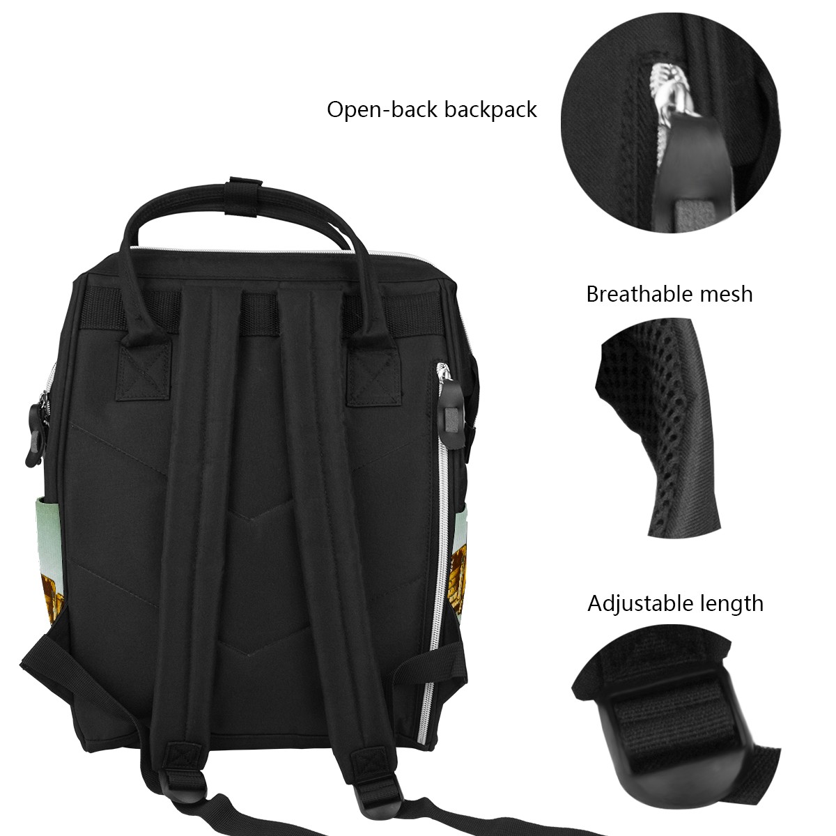 <p><b>Practical and Durable Diaper Bag Backpack </b></p><p><b>Spacious Diaper Backpack for Mom and Dad</b></p><p>Great organizer baby bag for all sorts of baby stuff. You get well-layered compartments to keep separated wet and dry nappies, bottles, diaper cloths;side pockets for baby wipes, umbrella, drinking bottle or more; Super easy glance-and-reach via wide open mouth and zipper on the back.</p><p><b>Lightweight and Comfortable</b></p><p>Premium canvas&nbsp;fabric weight less than 1.3&nbsp;pounds, you get a lightweight diaper backpack that can be packed with loads of things. We also widen the shoulder straps to&nbsp;add soft padding to reduce fatigue and take care of your spine.</p><p><b>Water resistant and clean easily</b></p><p>The outside coating are water resistant and the spills could be wiped off easily.&nbsp;For period cleaning we suggest hands wash not machine, no worry about fading and crumple.</p><p><b>Sturdy and Lasts Long</b></p><p>Premium canvas&nbsp;and nylon fabric, reinforced stitches, sturdy zipper, our mummy backpack can hold sunlight, dragging, tossing and even more.</p>