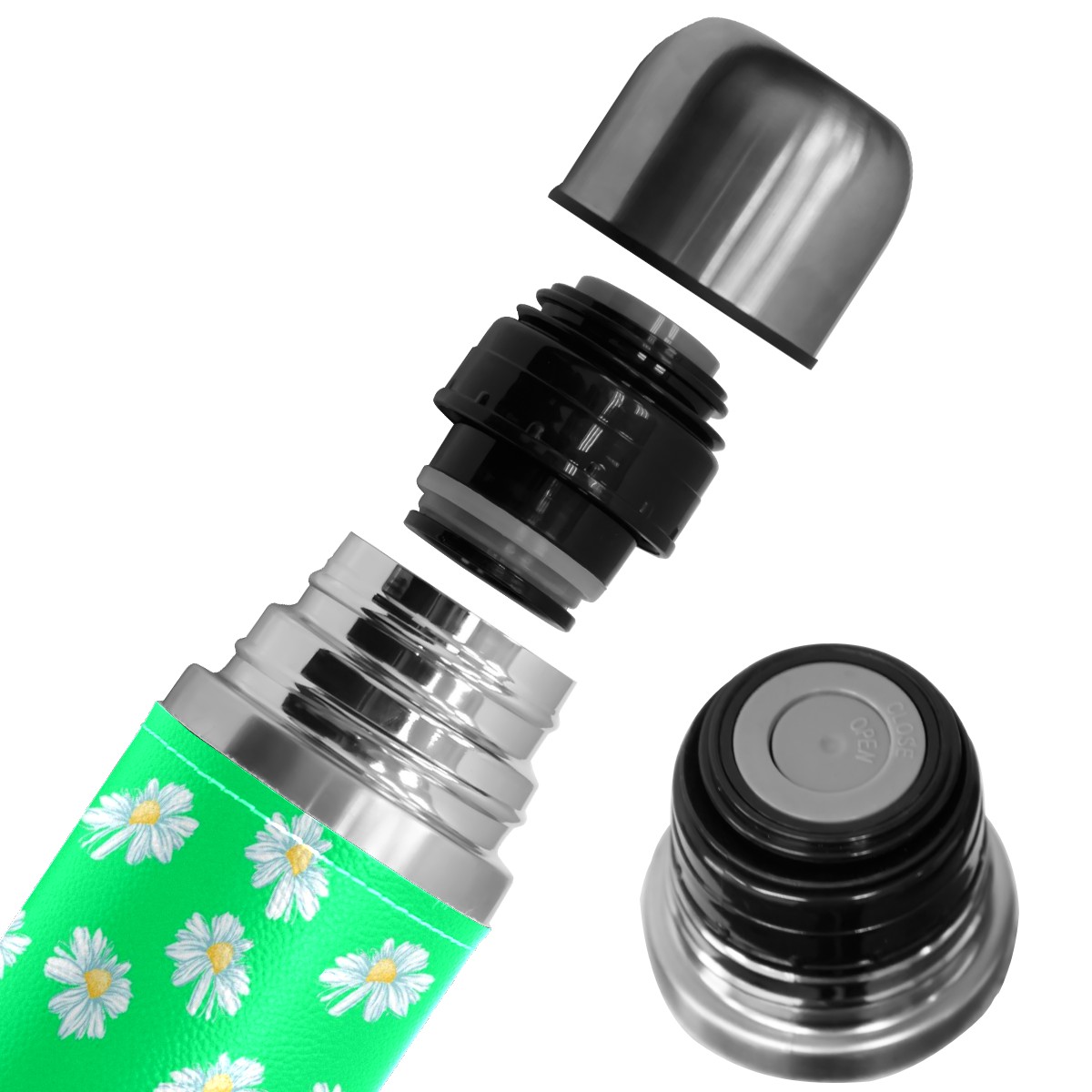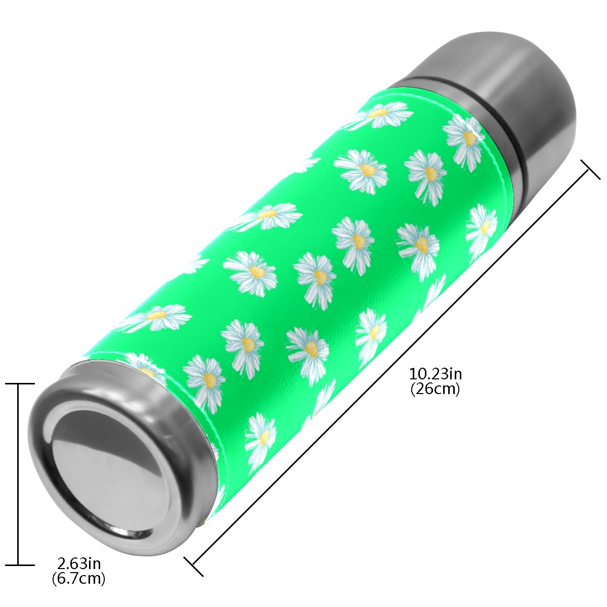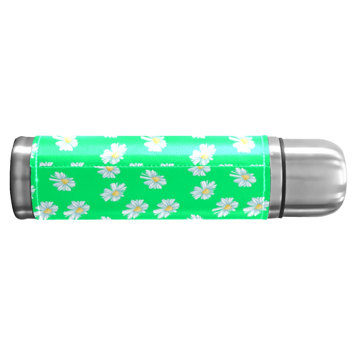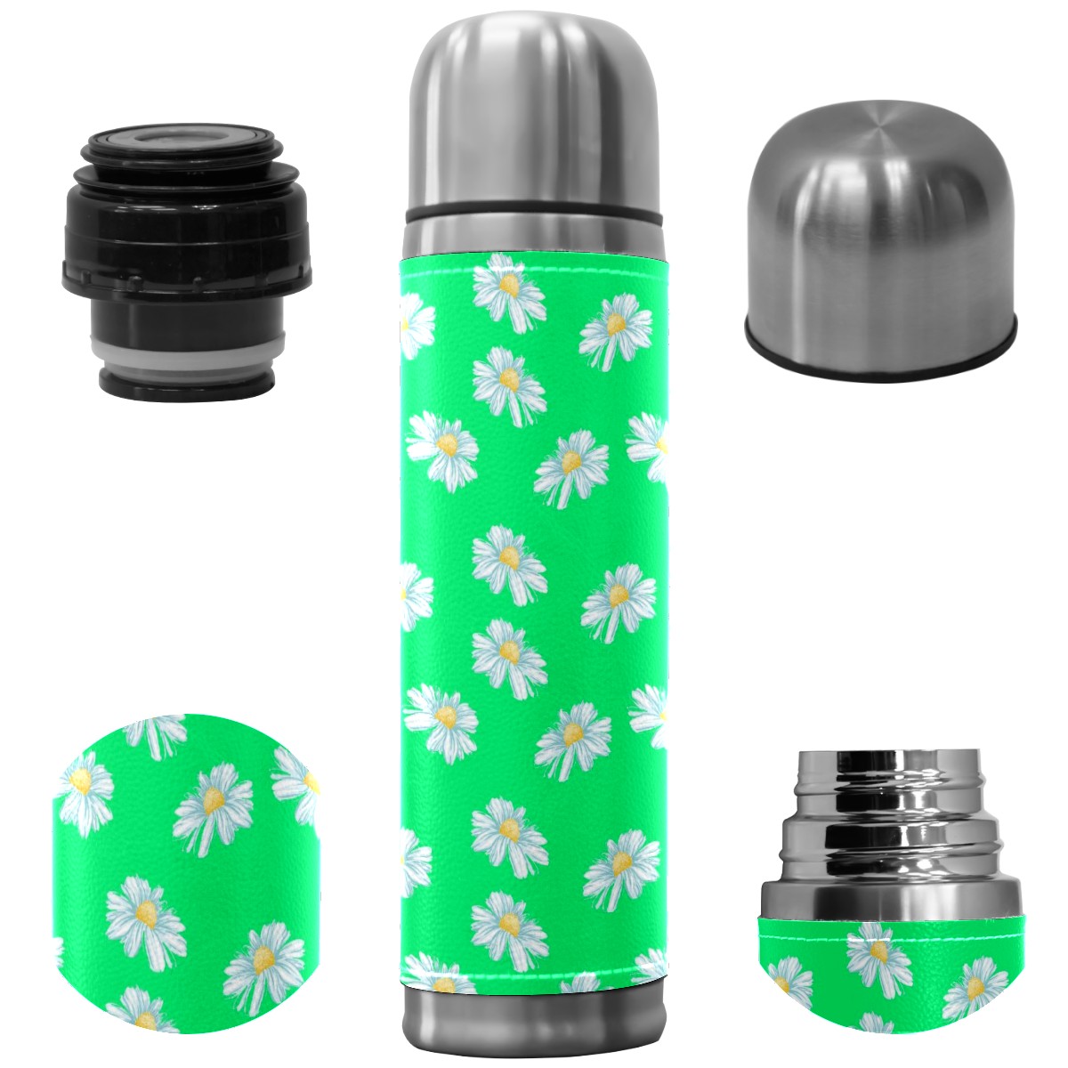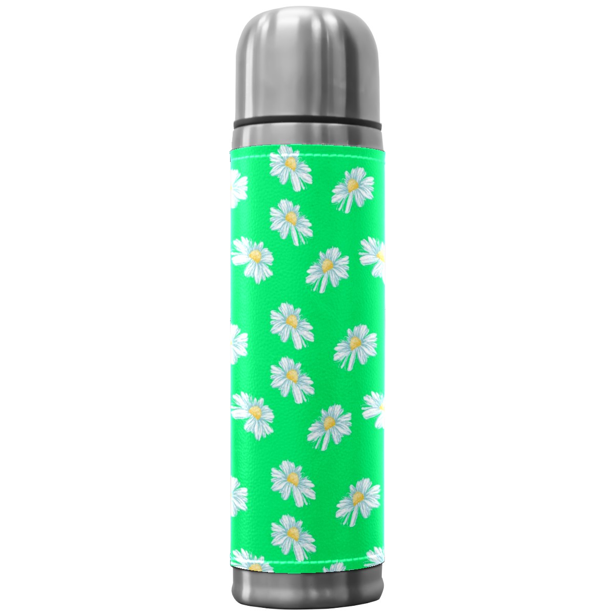 Water Bottle White Little Daisy Pattern Green Stainless Steel PU Leather Vacuum Insulated Travel Mug 17OZ Double Walled Coffee Cup Flask