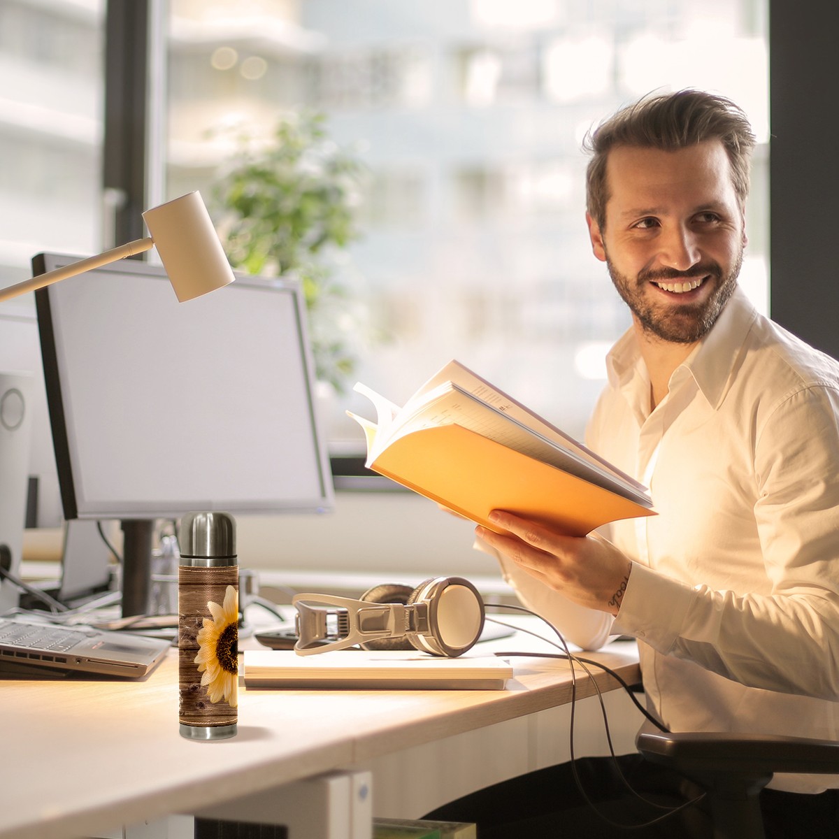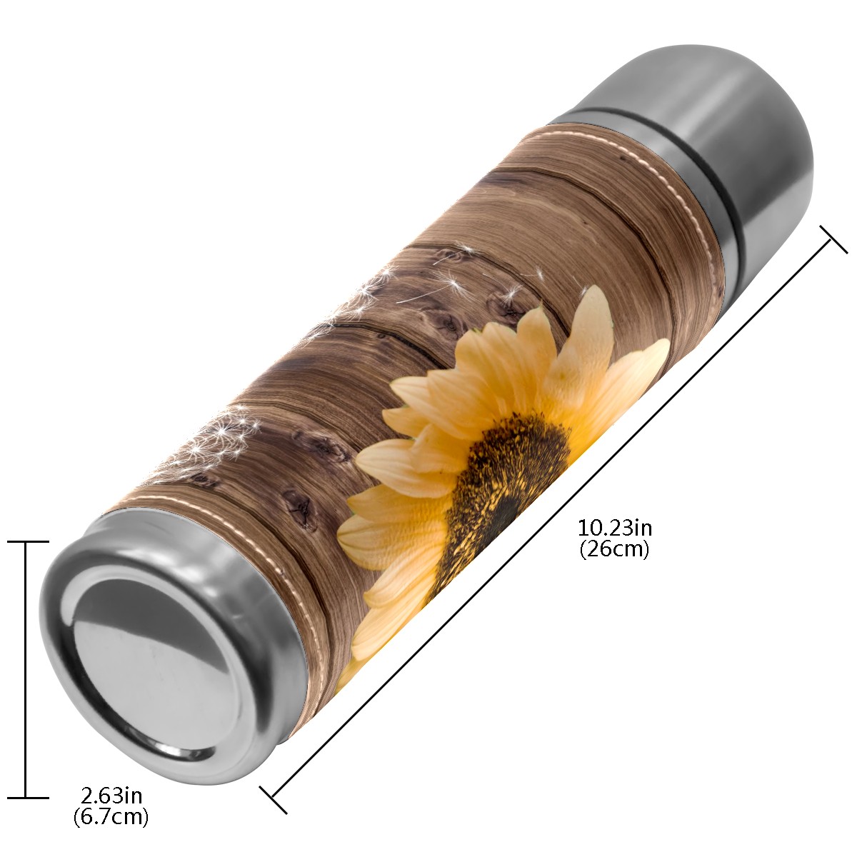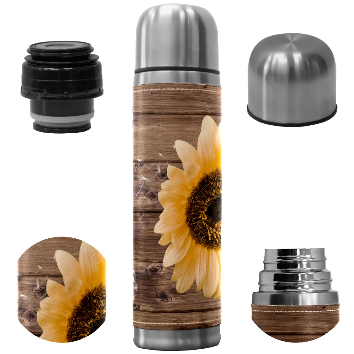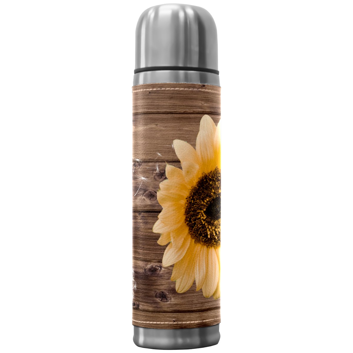 Water Bottle Wood Dandelions Yellow Sunflower Stainless Steel PU Leather Vacuum Insulated Travel Mug 17OZ Double Walled Coffee Cup Flask