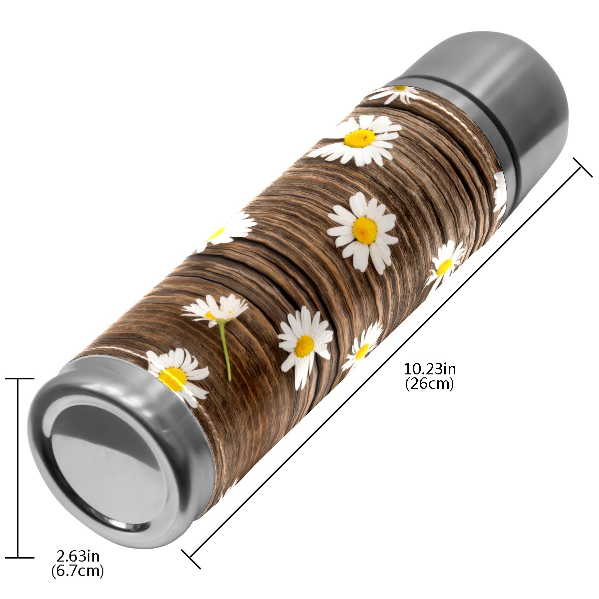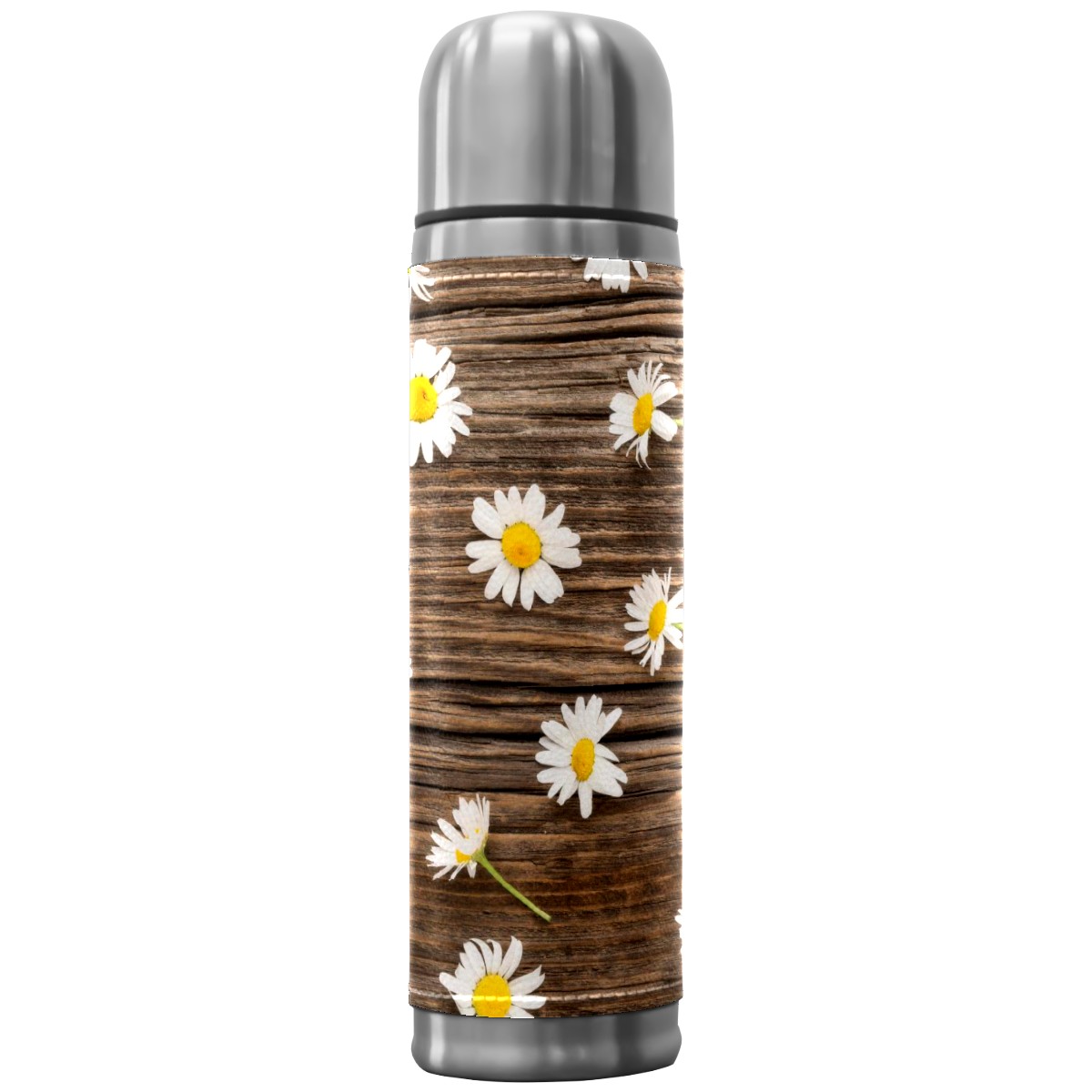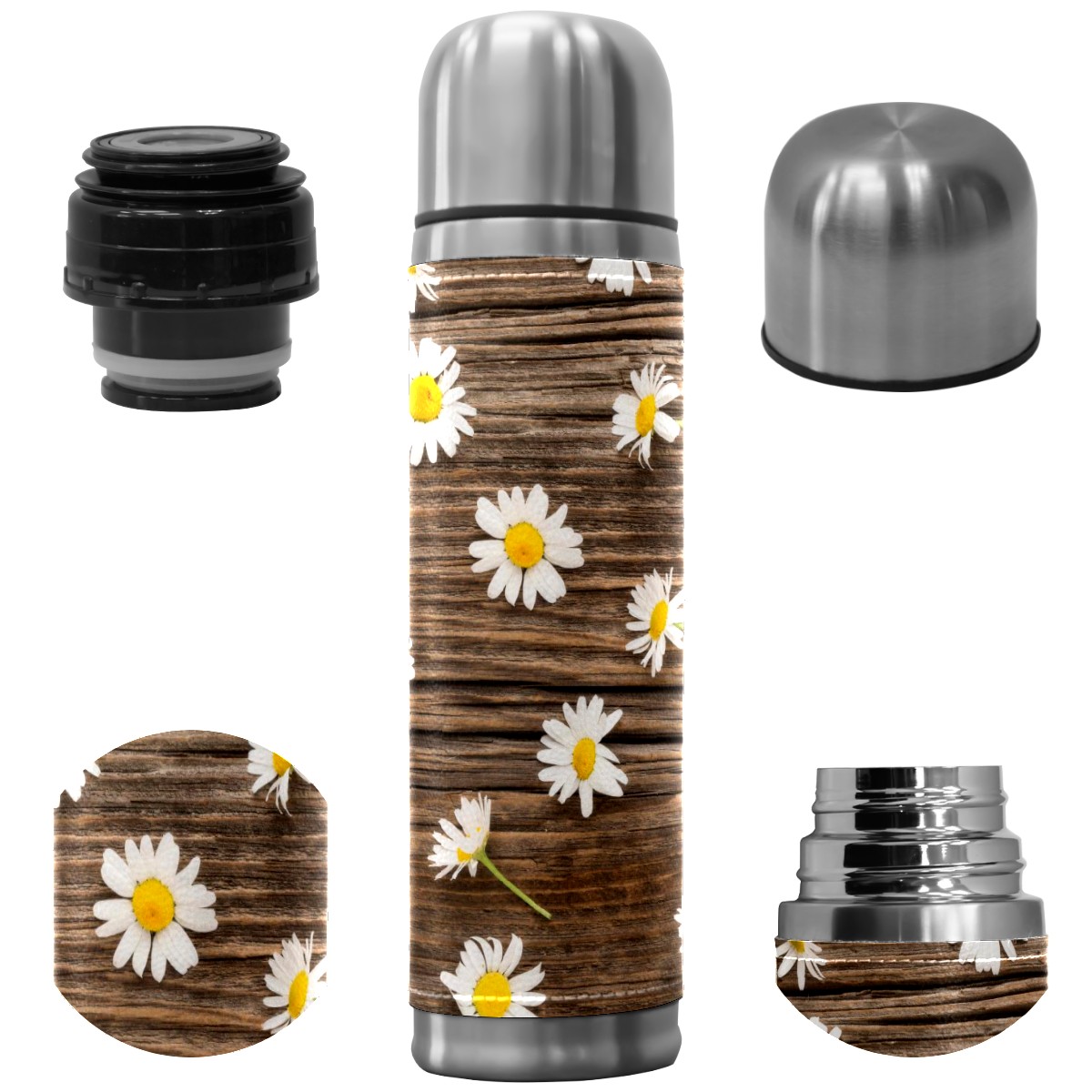 Water Bottle White Little Daisy Brown Wood Board Stainless Steel PU Leather Vacuum Insulated Travel Mug 17OZ Double Walled Coffee Cup Flask