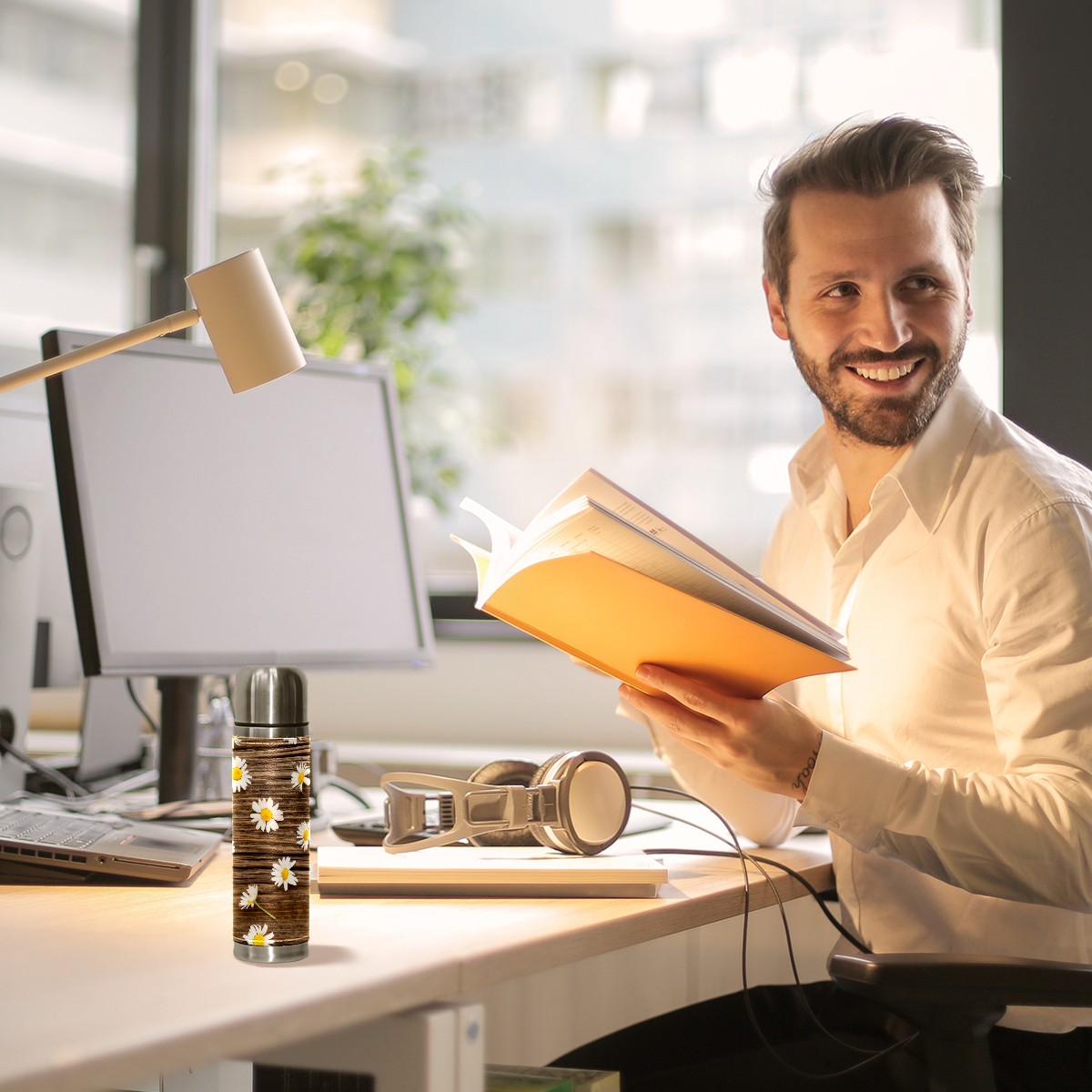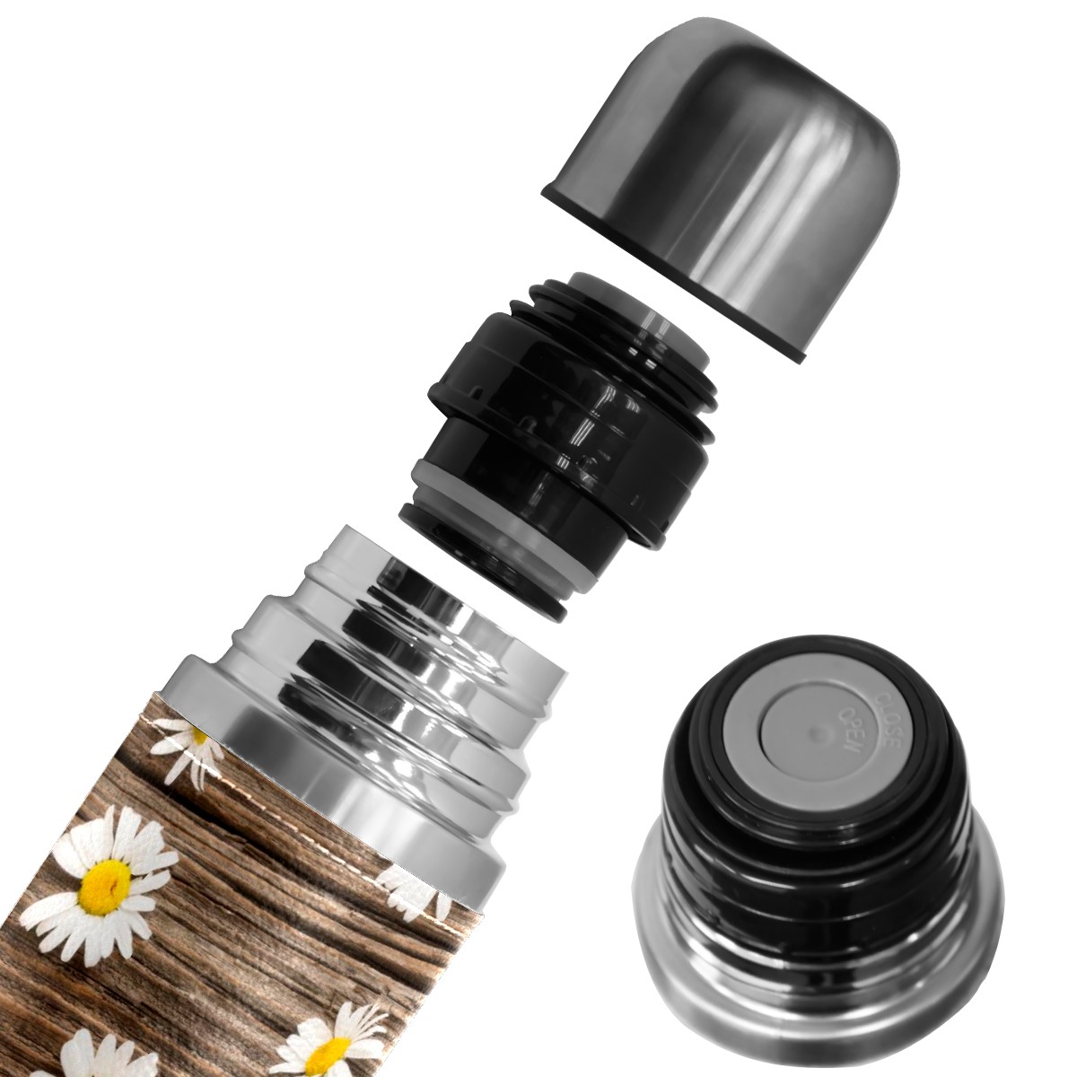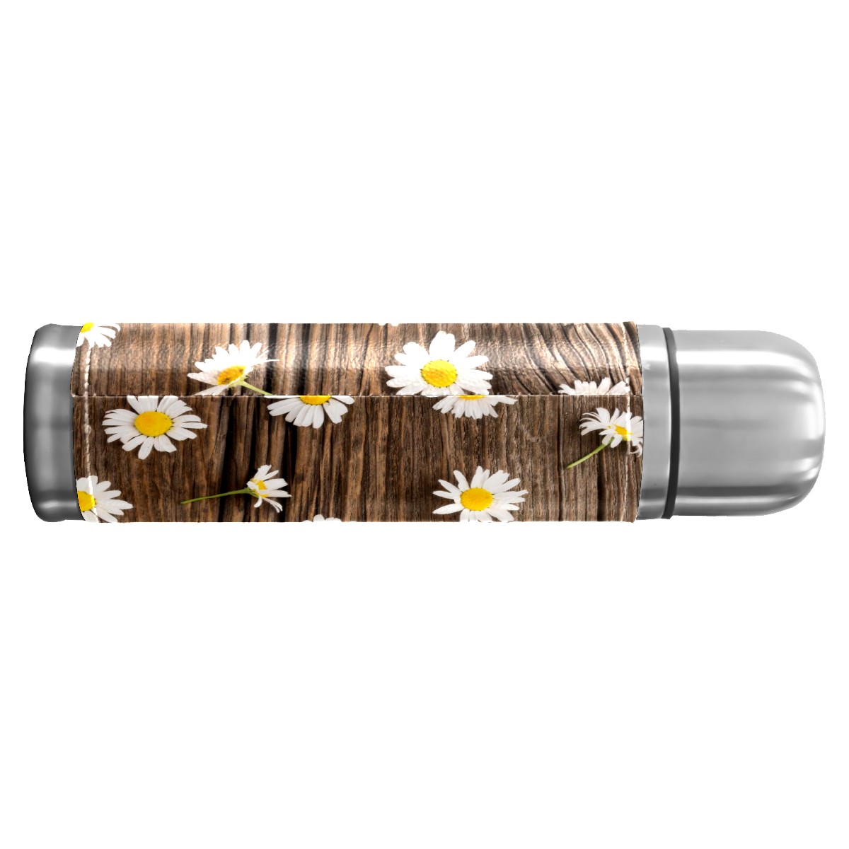 Water Bottle White Little Daisy Brown Wood Board Stainless Steel PU Leather Vacuum Insulated Travel Mug 17OZ Double Walled Coffee Cup Flask