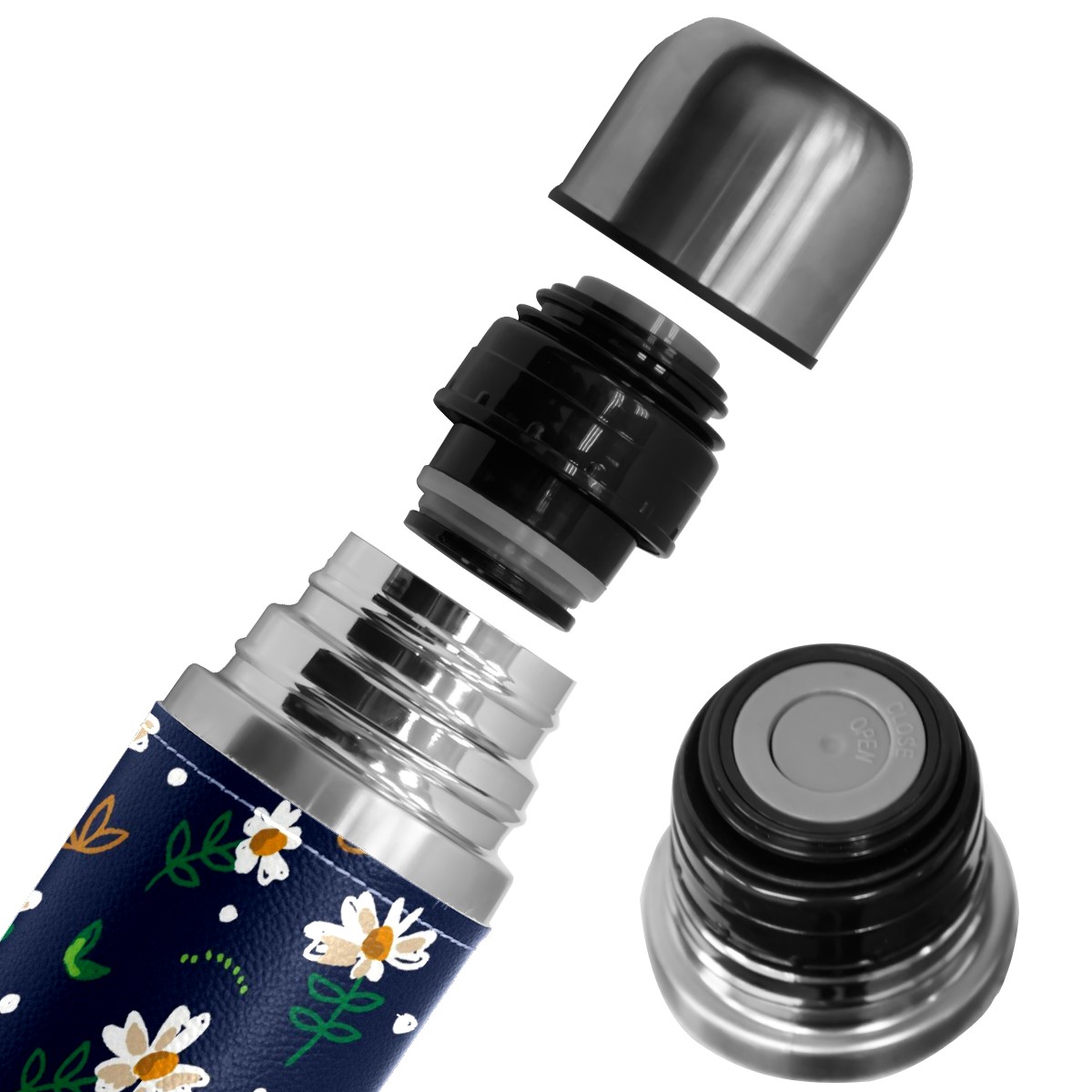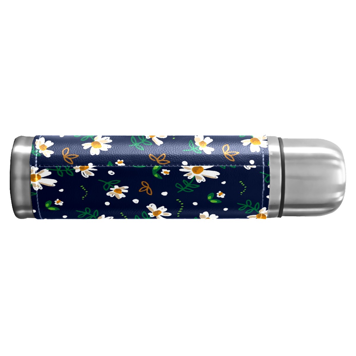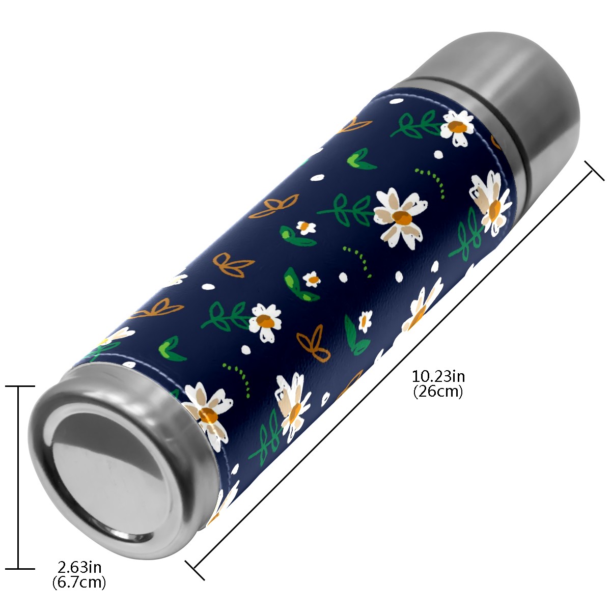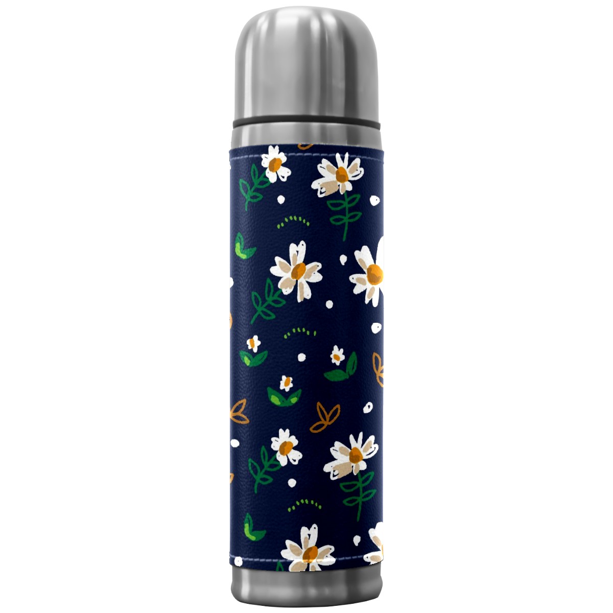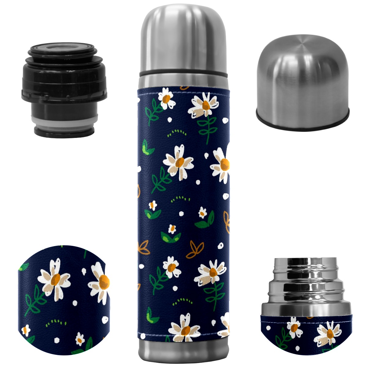 Water Bottle White Daisy Green Leaves Dark Blue Stainless Steel PU Leather Vacuum Insulated Travel Mug 17OZ Double Walled Coffee Cup Flask