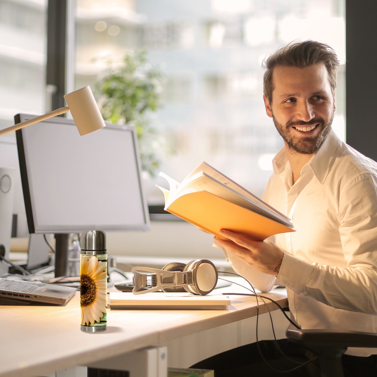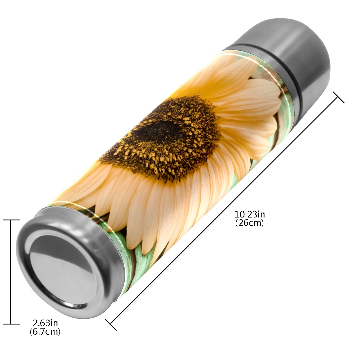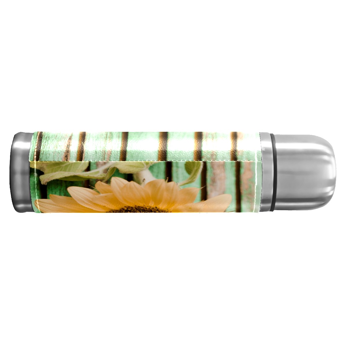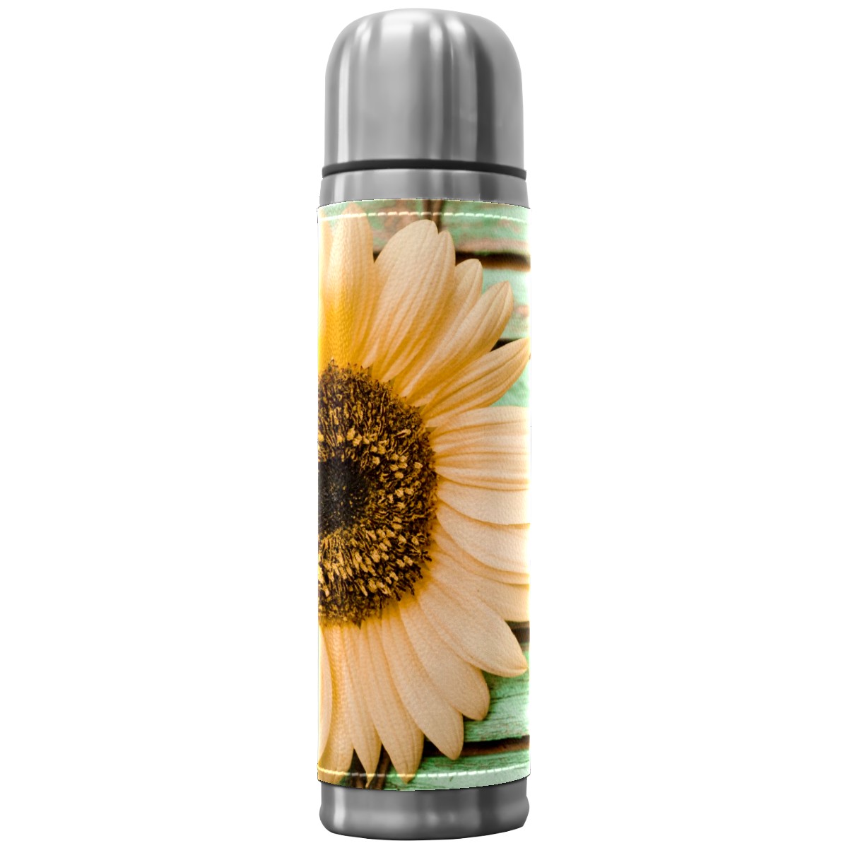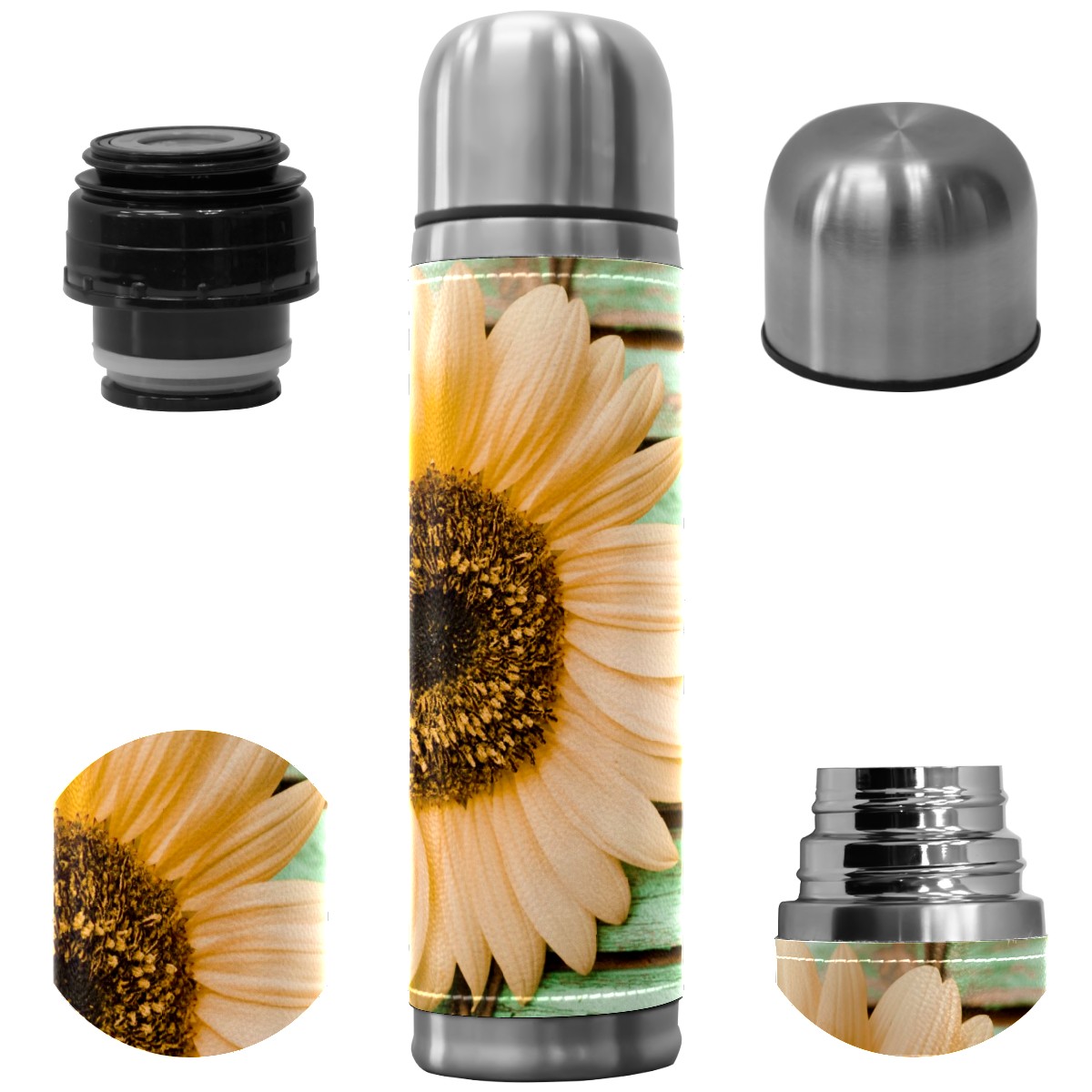 Water Bottle Sunflower Blue Wooden Board Stainless Steel PU Leather Vacuum Insulated Travel Mug 17OZ Double Walled Coffee Cup Flask