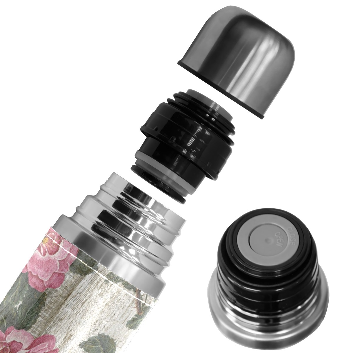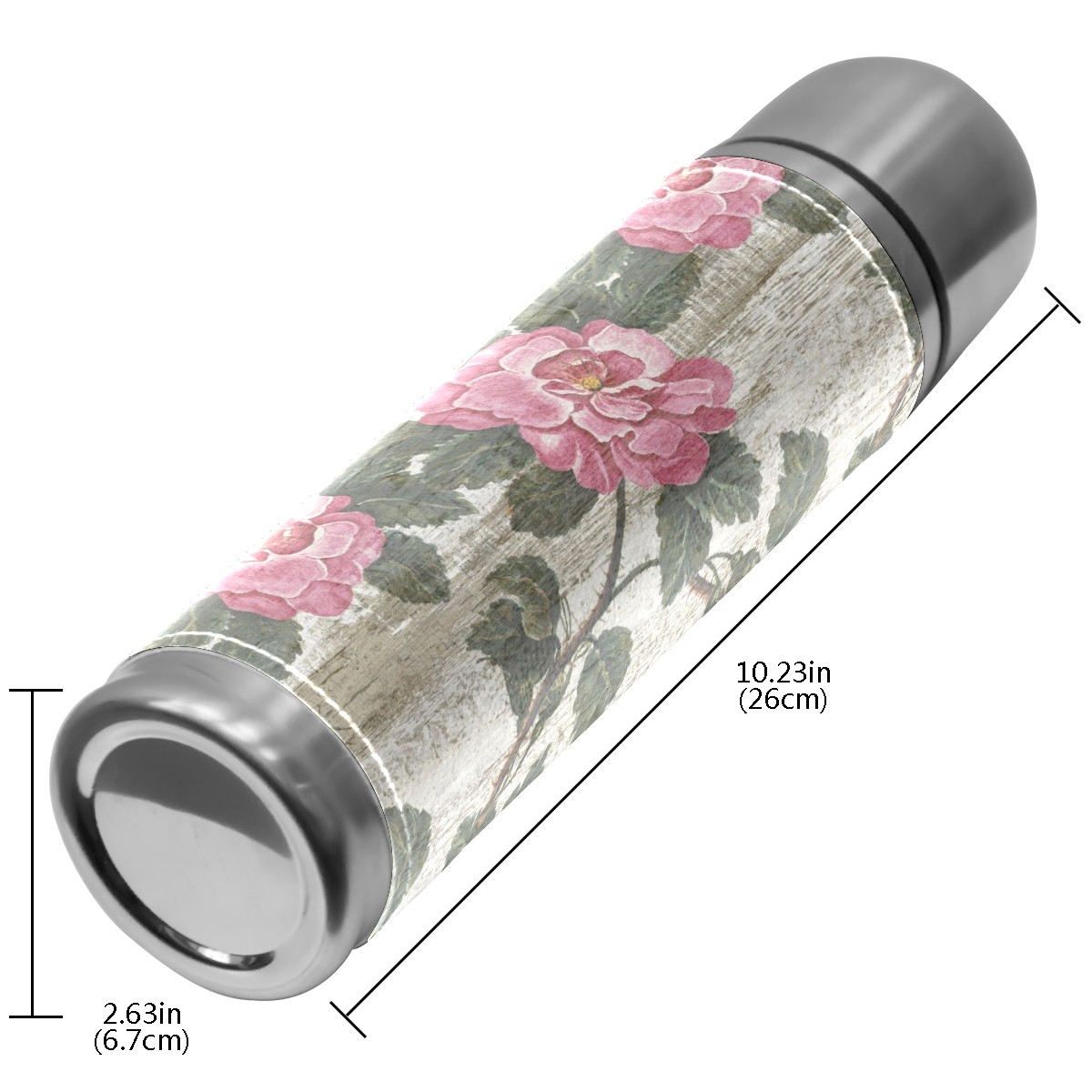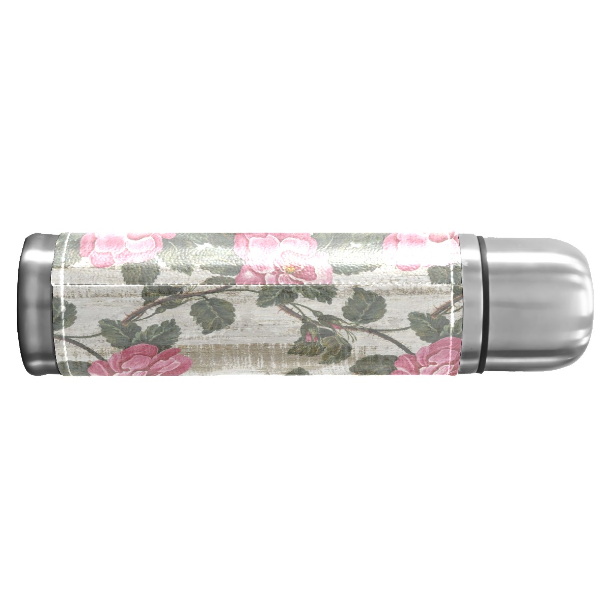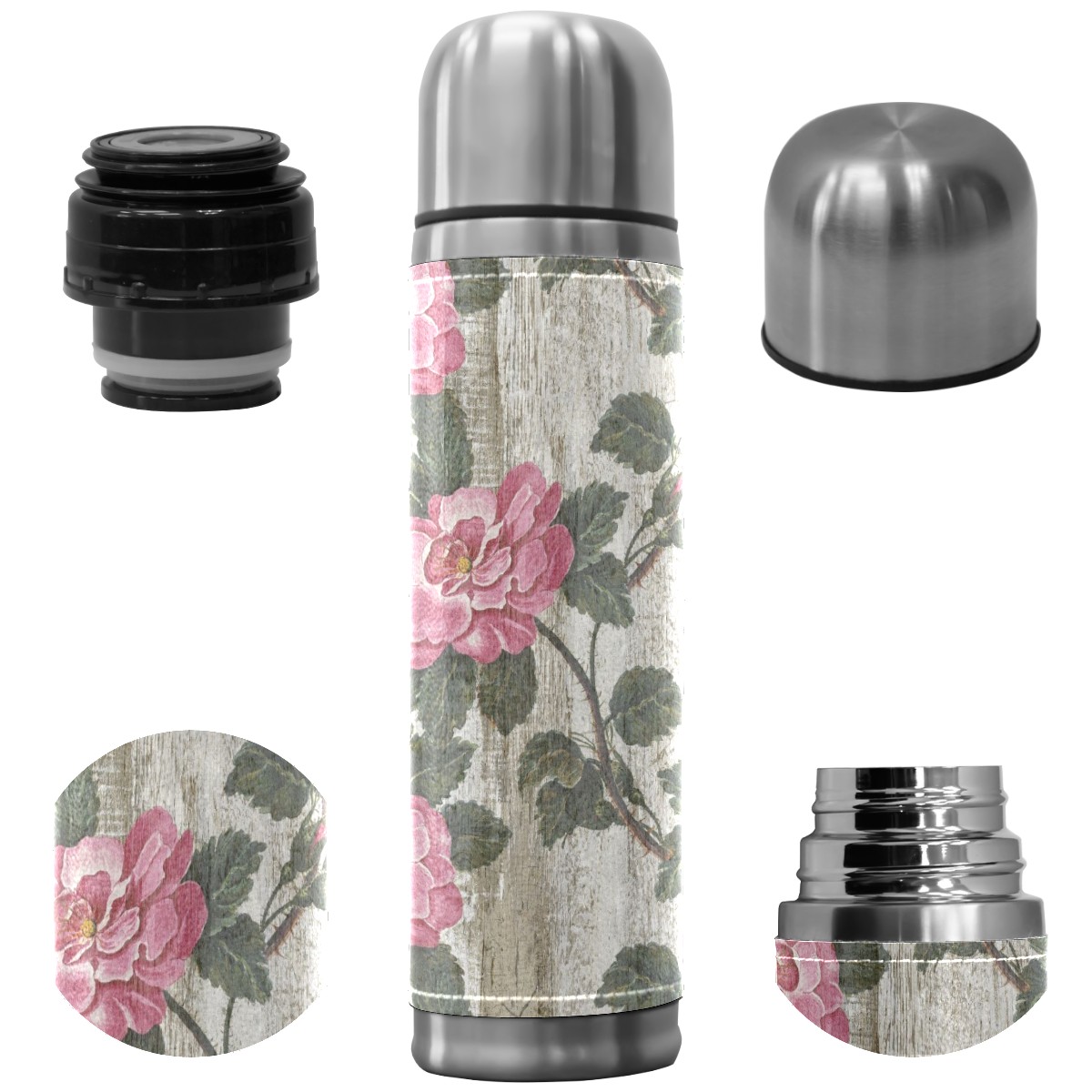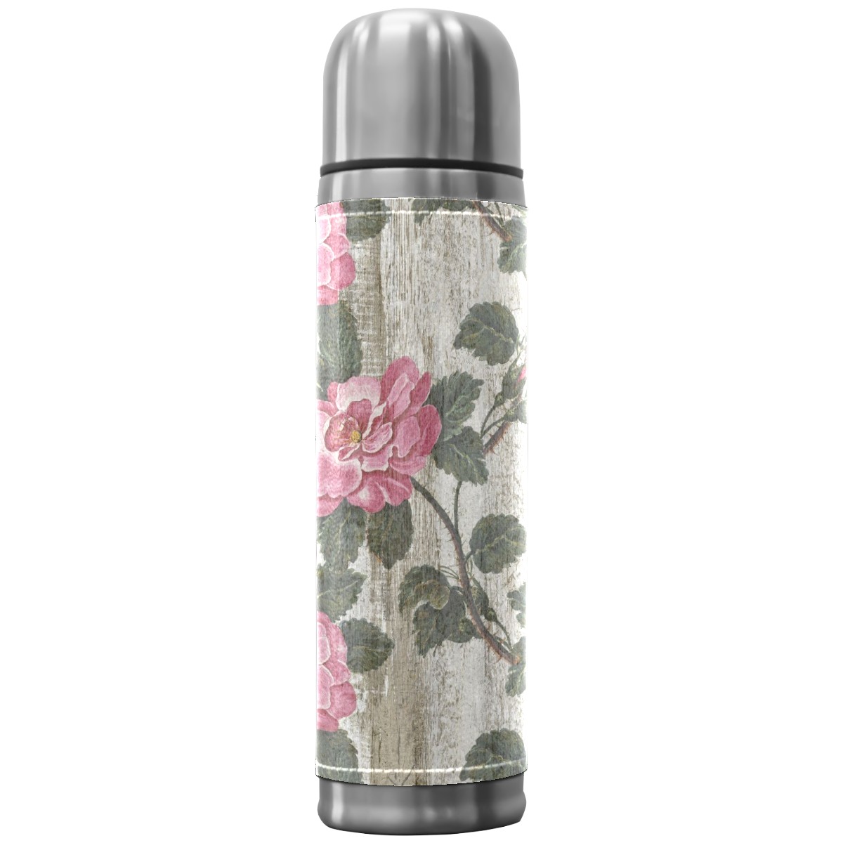 Water Bottle Pink Roses Grey Wooden Rustic Barn Stainless Steel PU Leather Vacuum Insulated Travel Mug 17OZ Double Walled Coffee Cup Flask
