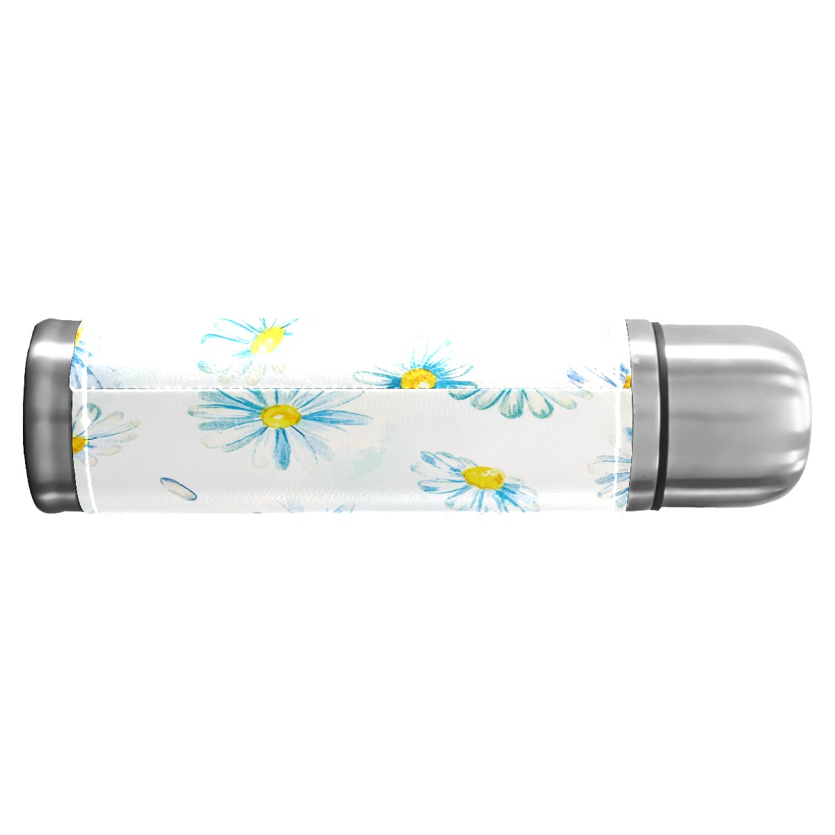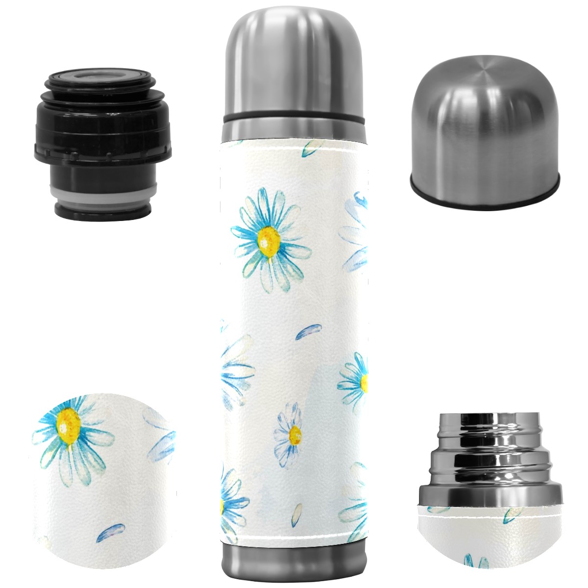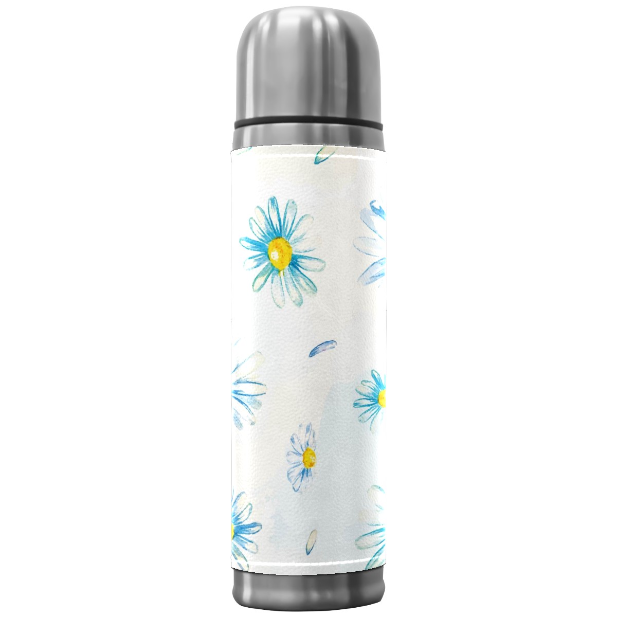 Water Bottle Painted Blue Daisy Flower Watercolor Stainless Steel PU Leather Vacuum Insulated Travel Mug 17OZ Double Walled Coffee Cup Flask