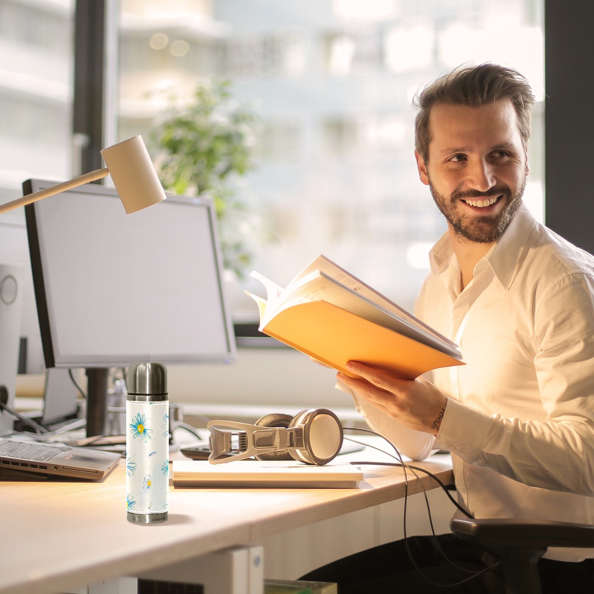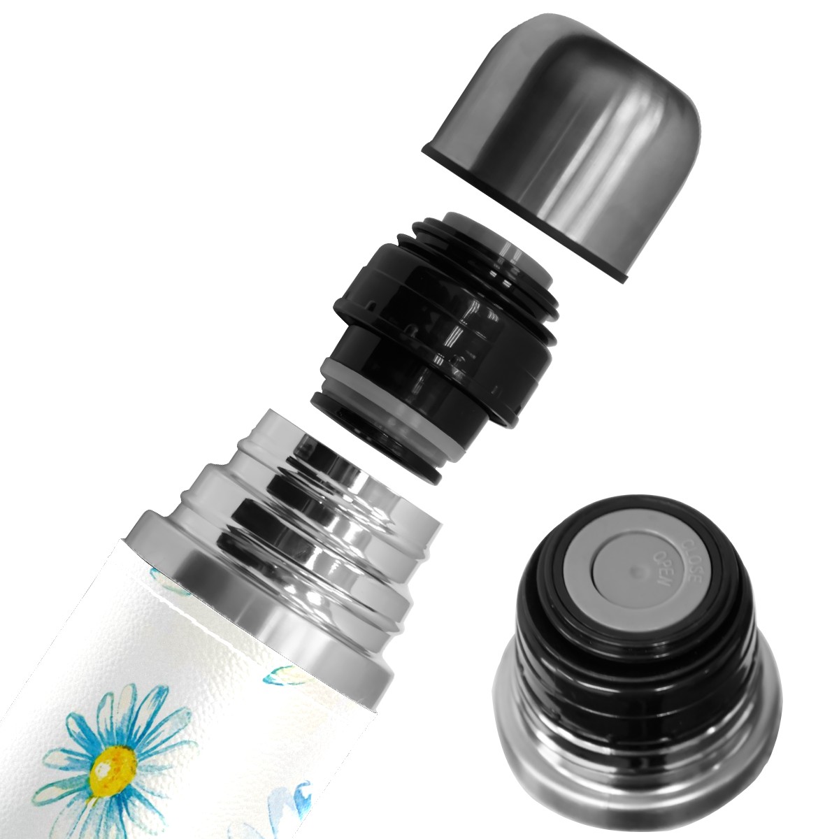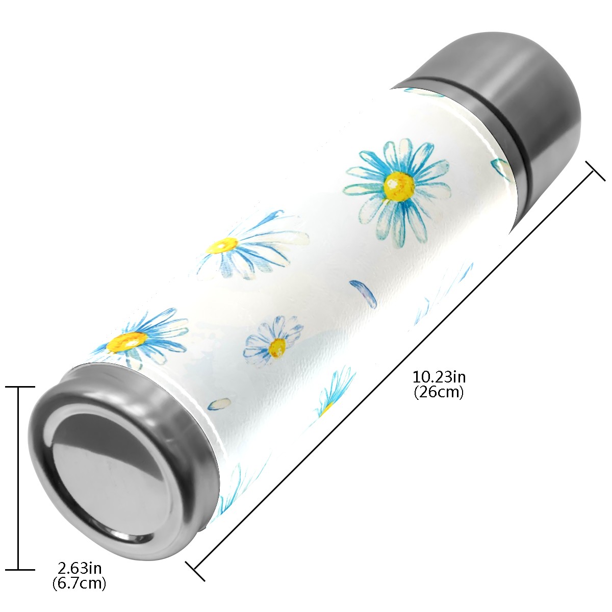 Water Bottle Painted Blue Daisy Flower Watercolor Stainless Steel PU Leather Vacuum Insulated Travel Mug 17OZ Double Walled Coffee Cup Flask