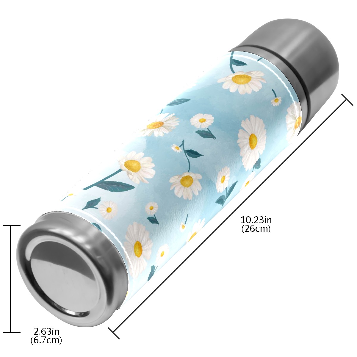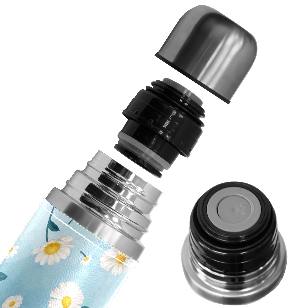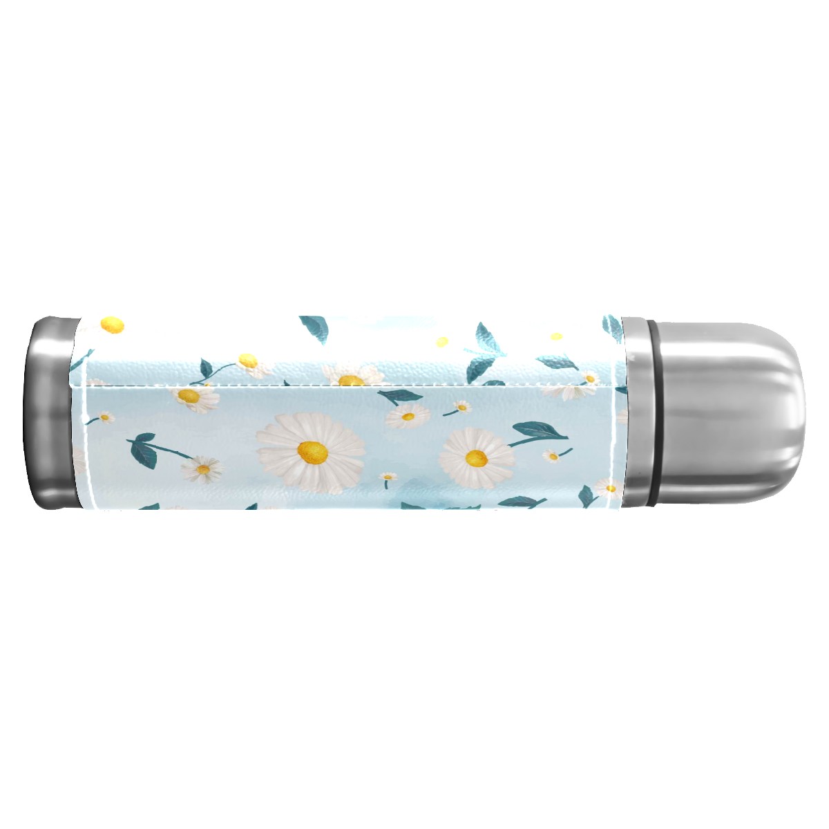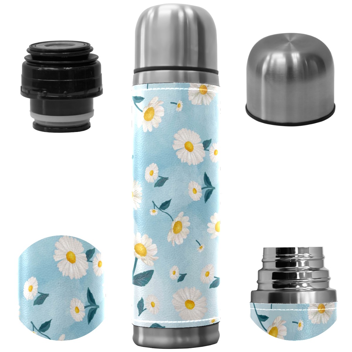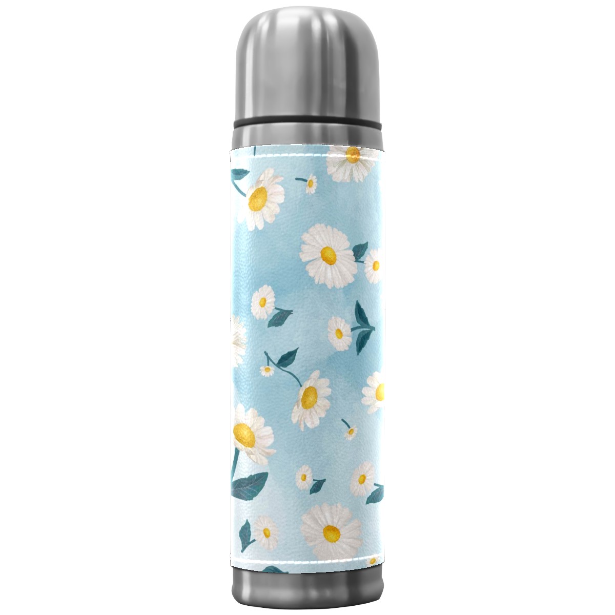 Water Bottle Little Daisy Flower Light Blue Background Stainless Steel PU Leather Vacuum Insulated Travel Mug 17OZ Double Walled Coffee Cup Flask