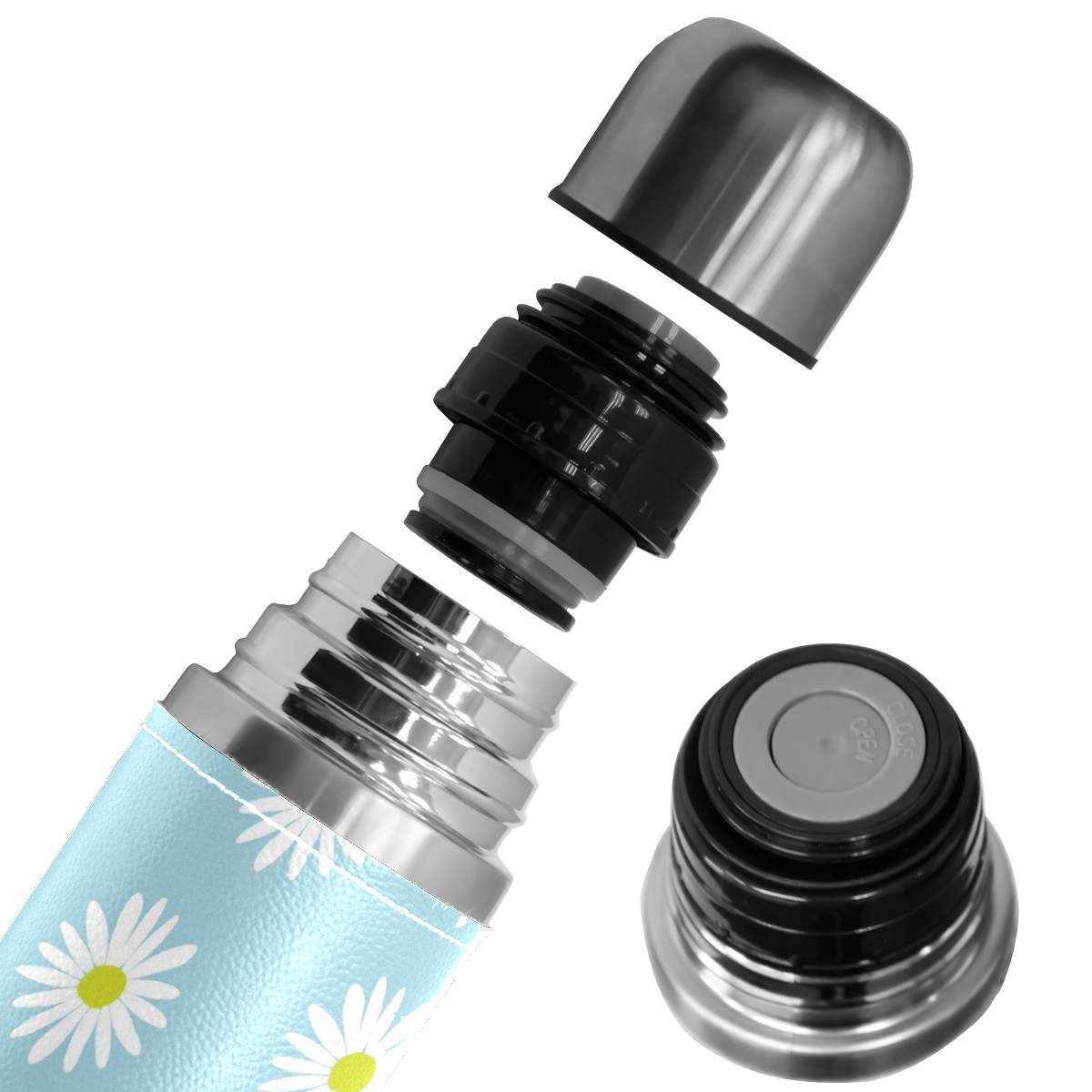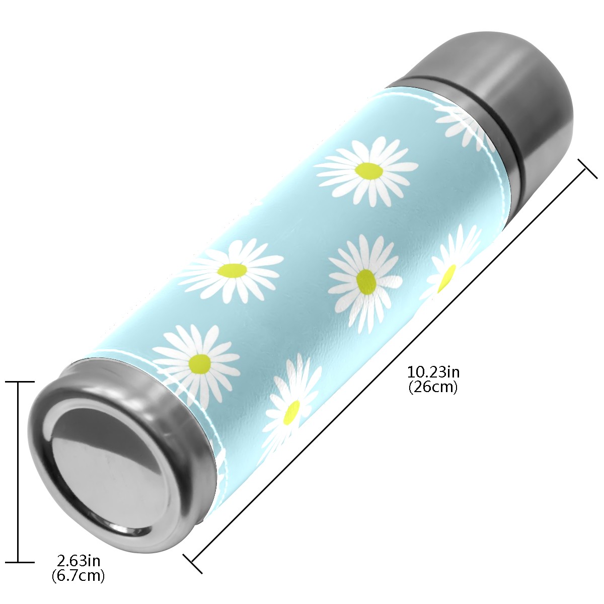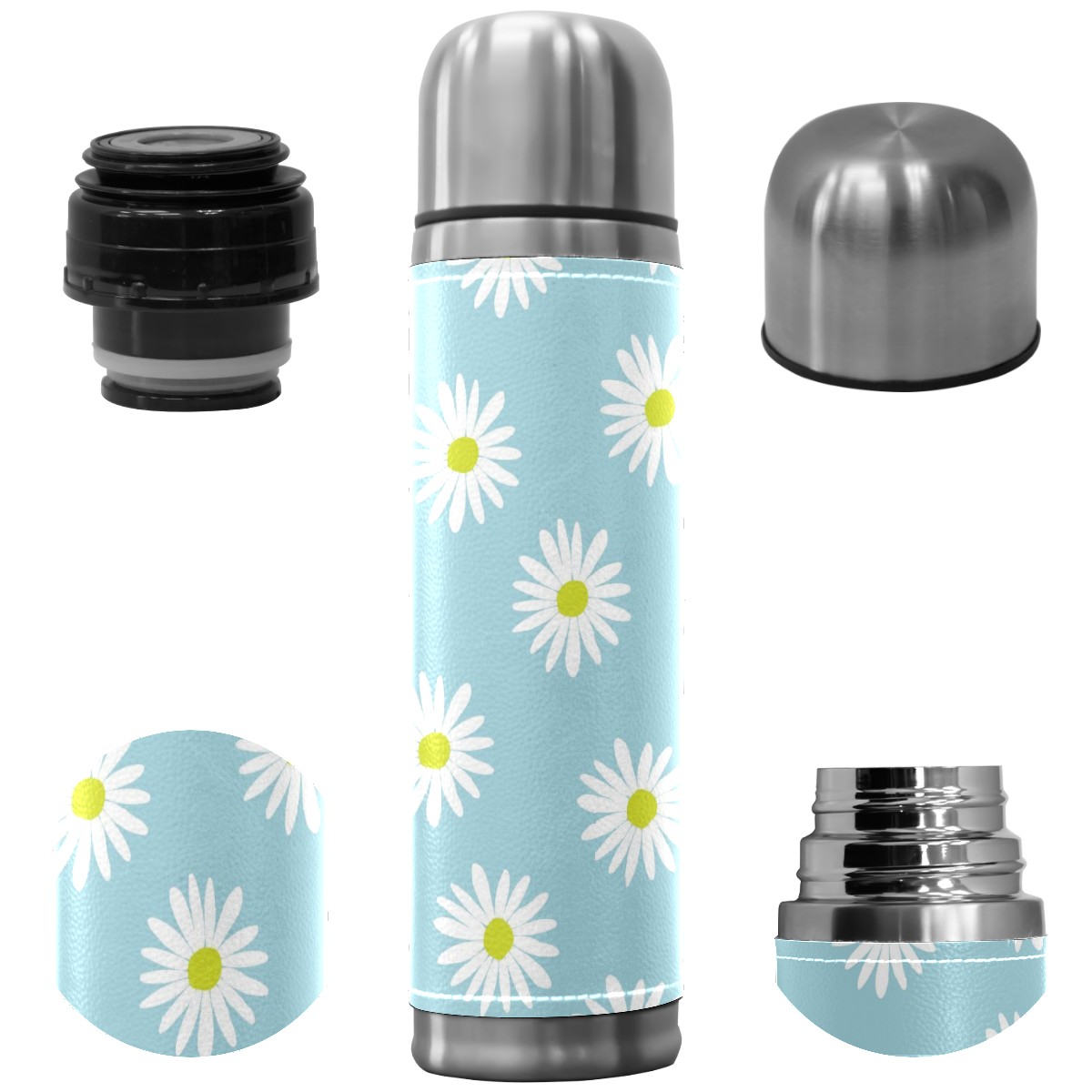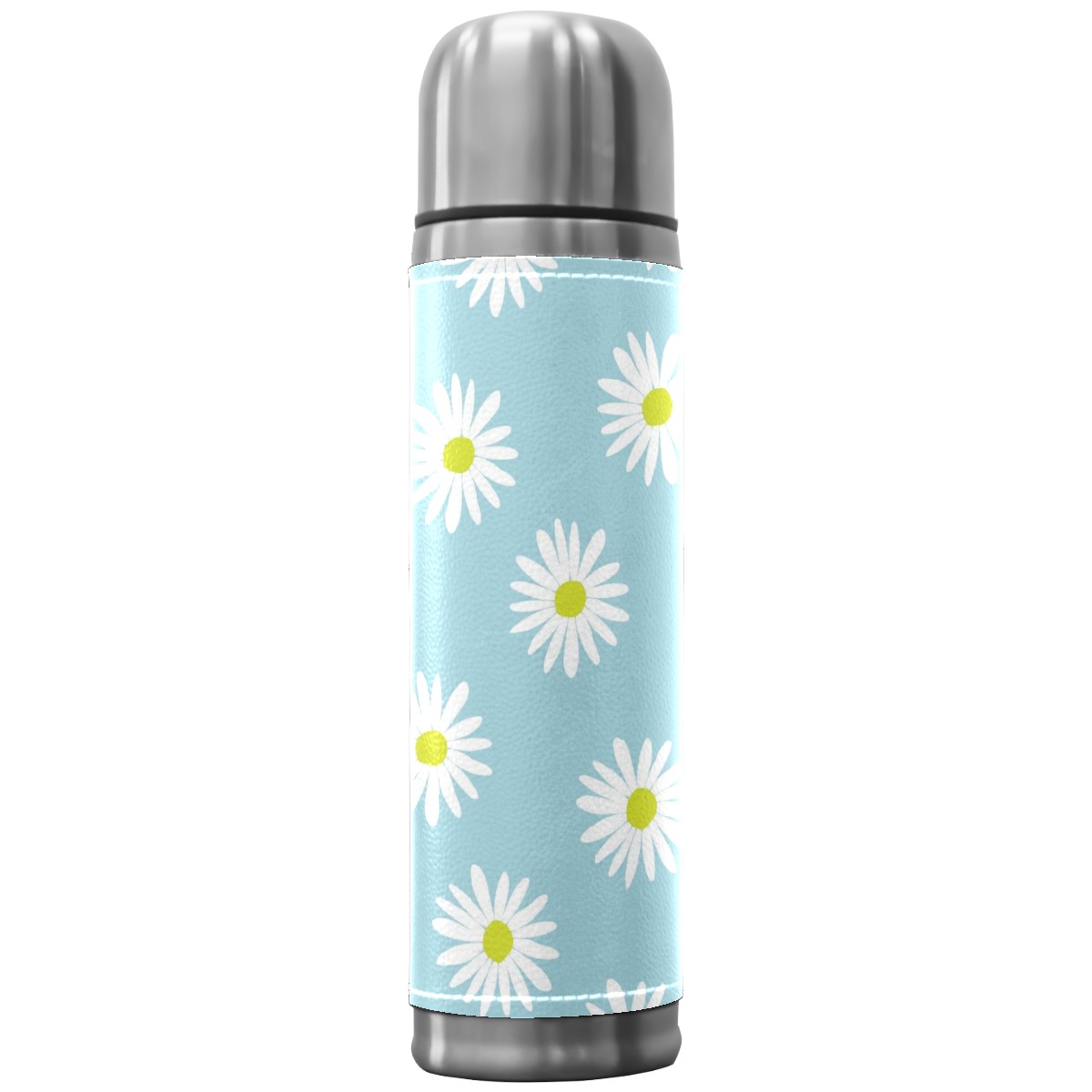 Water Bottle Light Blue White Daisies Flower Pattern Stainless Steel PU Leather Vacuum Insulated Travel Mug 17OZ Double Walled Coffee Cup Flask