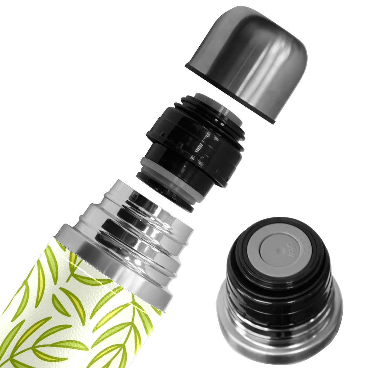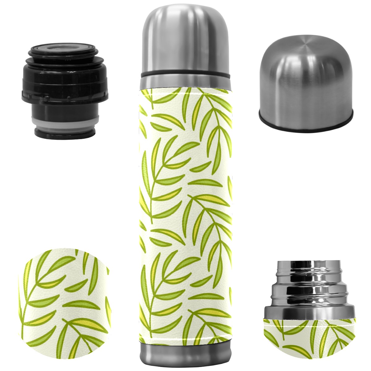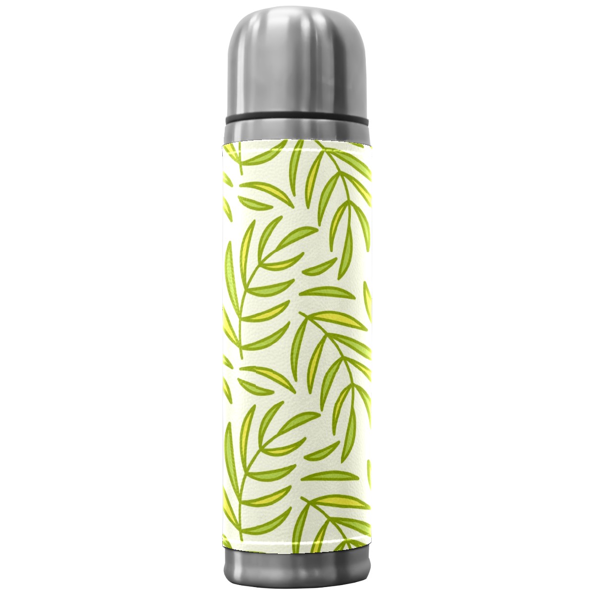 Water Bottle Green Leaves Pattern Seamless Stainless Steel PU Leather Vacuum Insulated Travel Mug 17OZ Double Walled Coffee Cup Flask