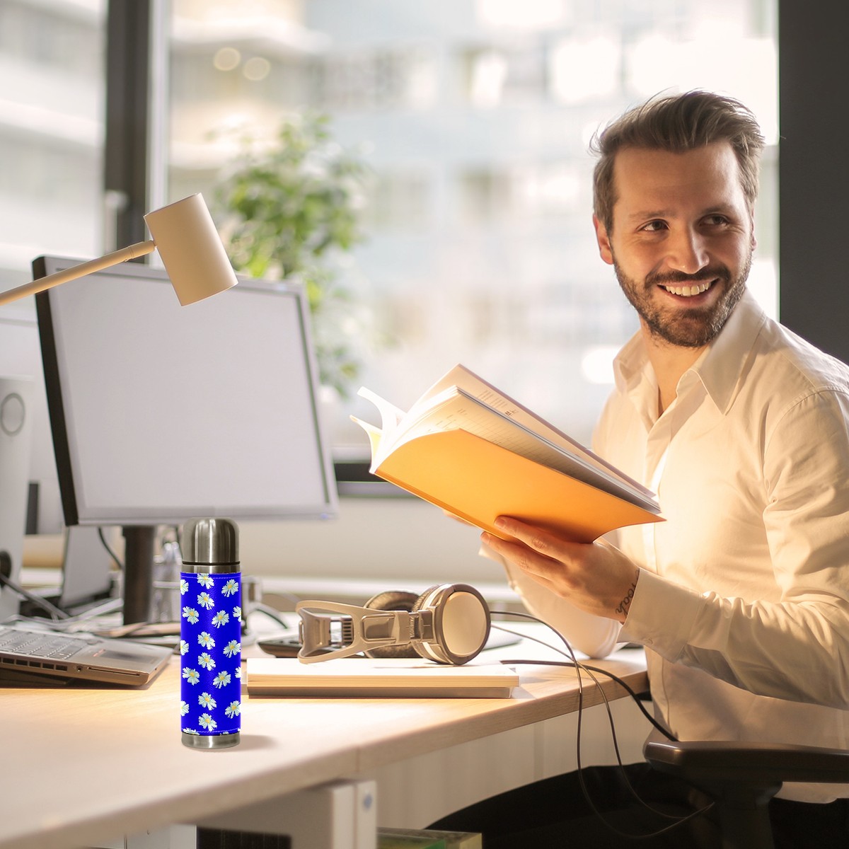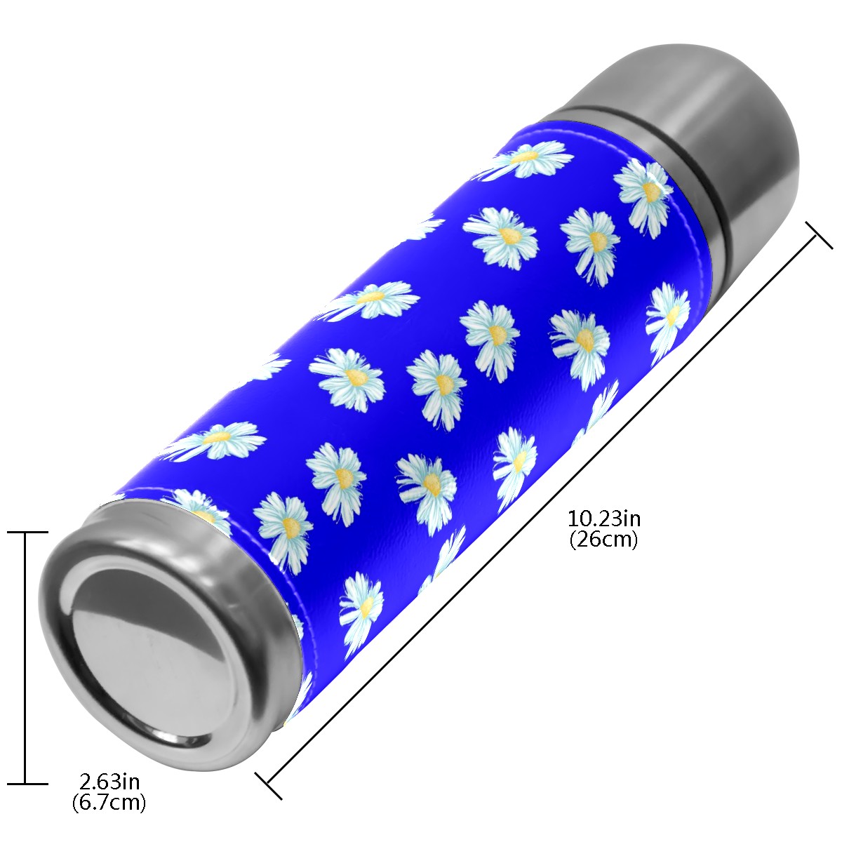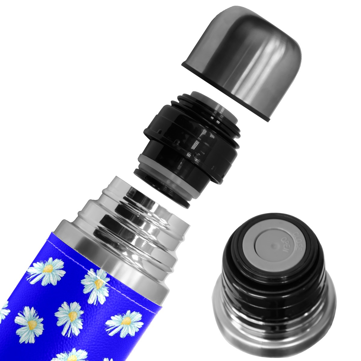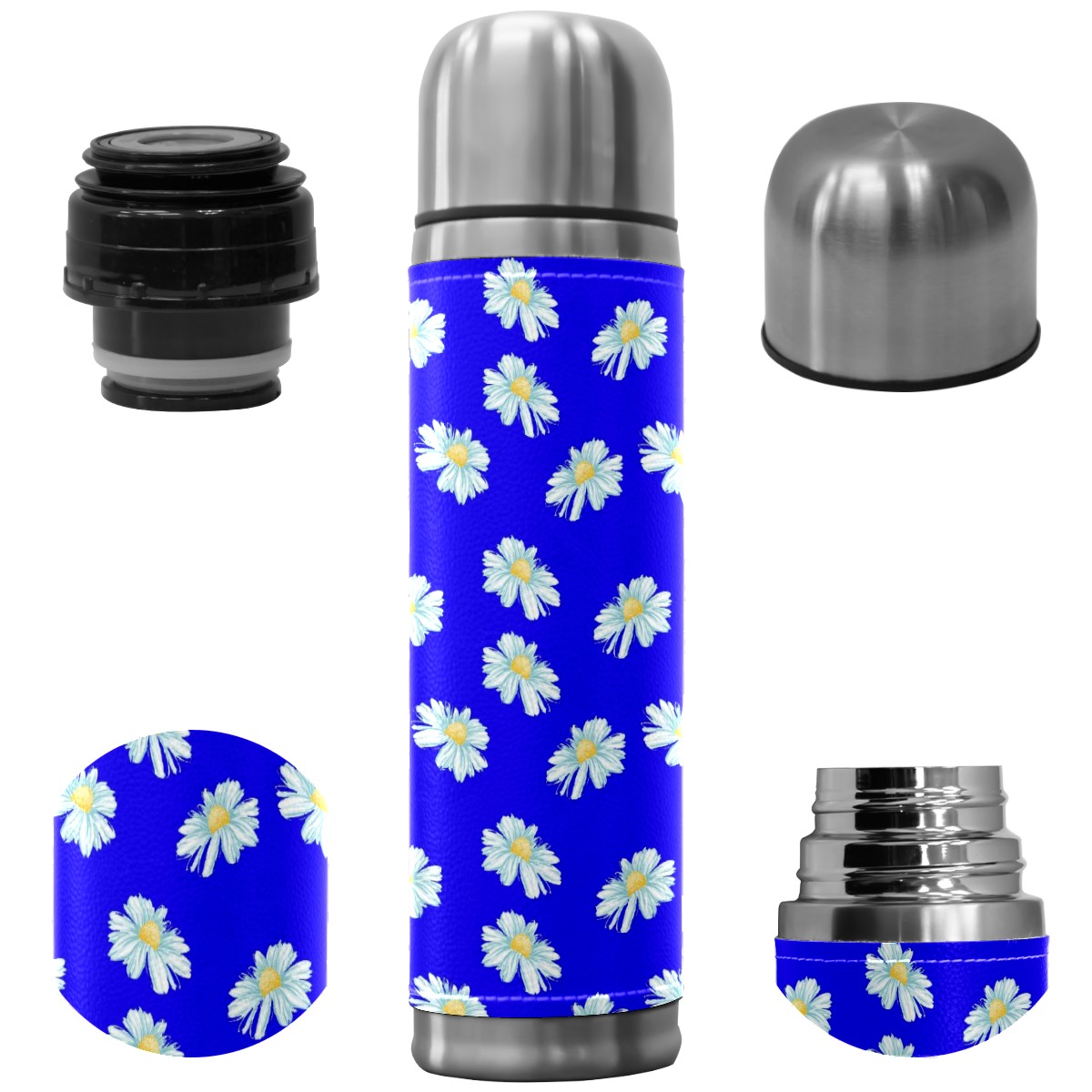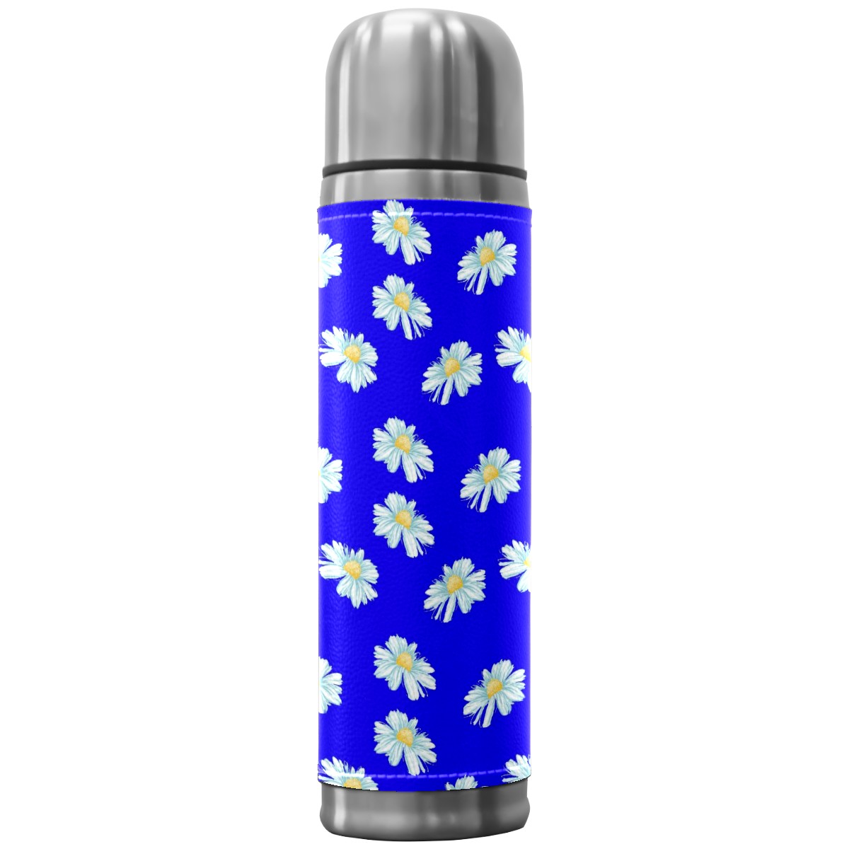 Water Bottle Chamomile Daisy Pattern Royal Blue Stainless Steel PU Leather Vacuum Insulated Travel Mug 17OZ Double Walled Coffee Cup Flask