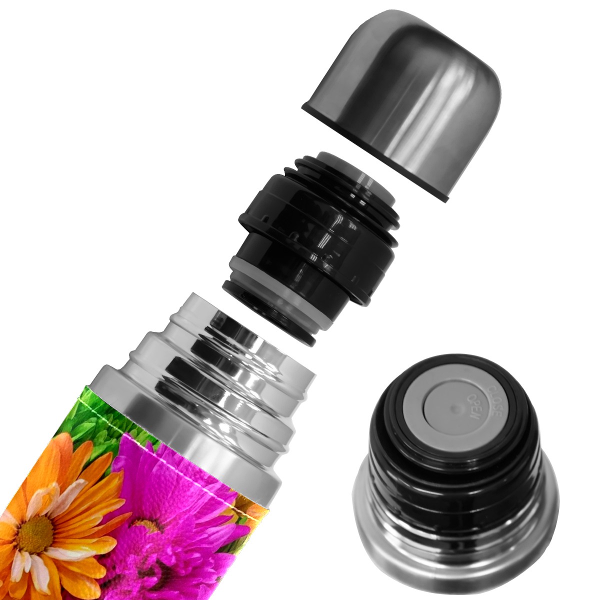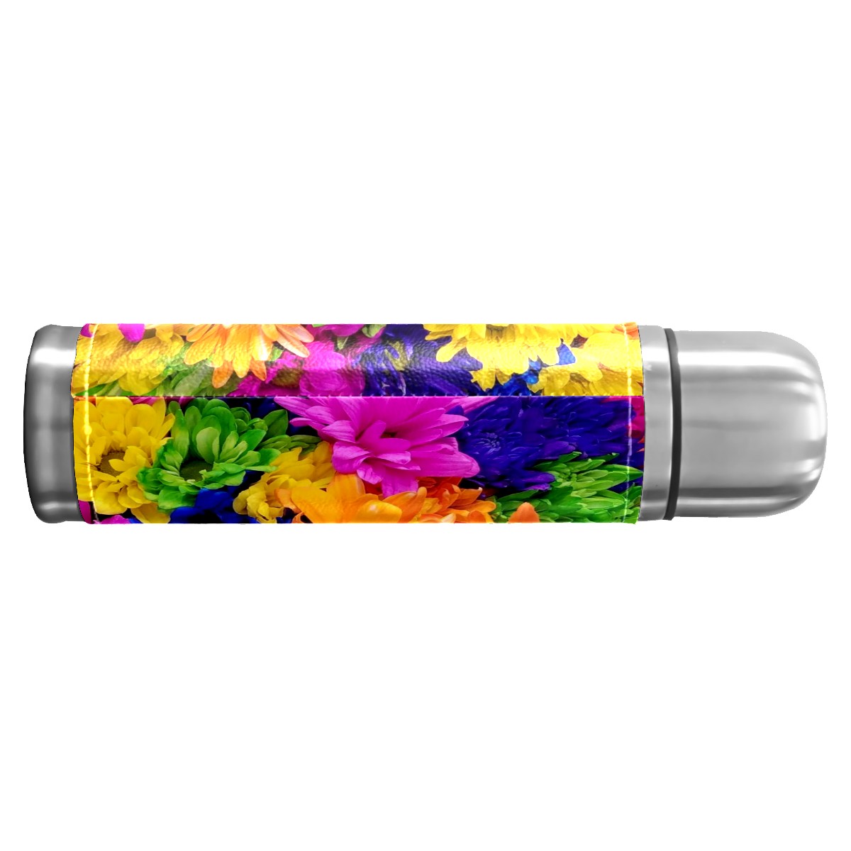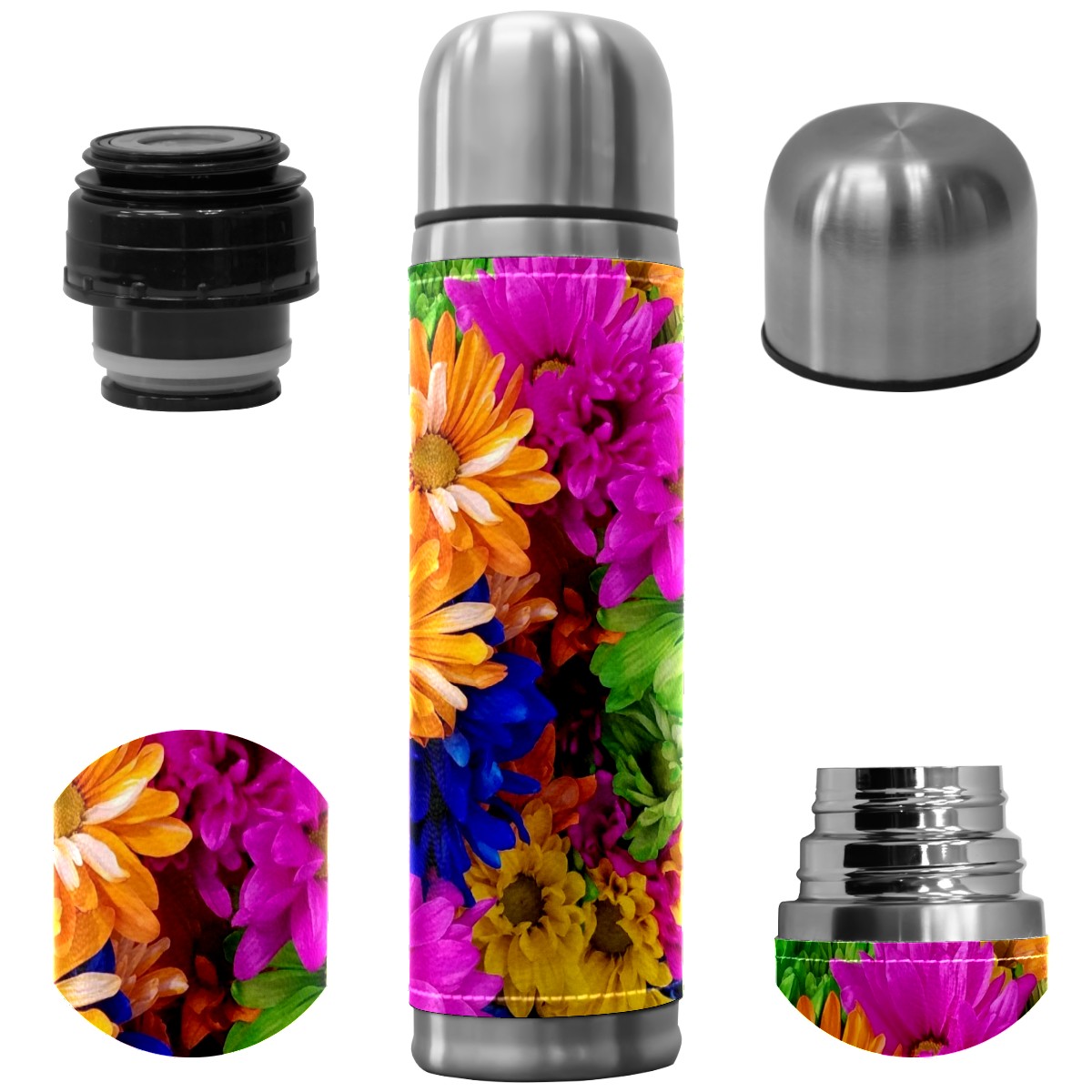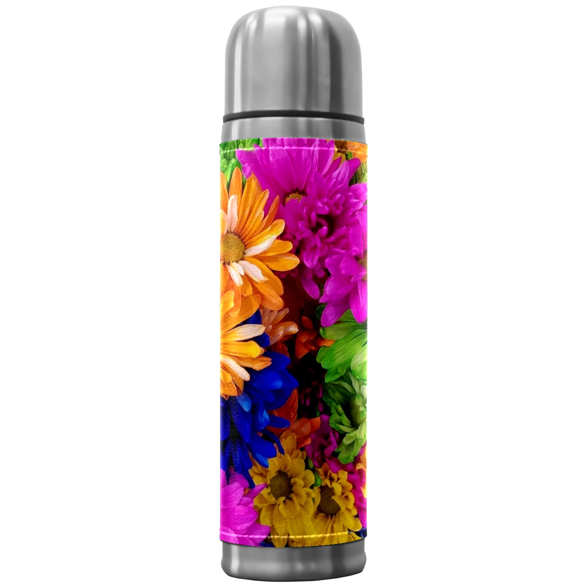 Water Bottle Colorful Chrysanthemums Flowers Pink Yellow Green Stainless Steel PU Leather Vacuum Insulated Travel Mug 17OZ Double Walled Coffee Cup Flask