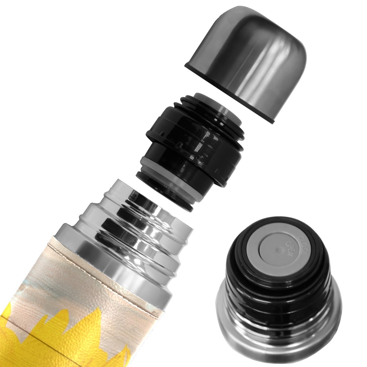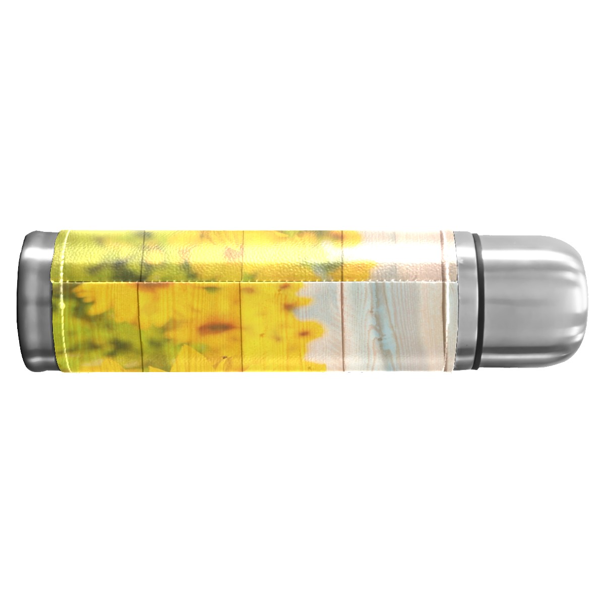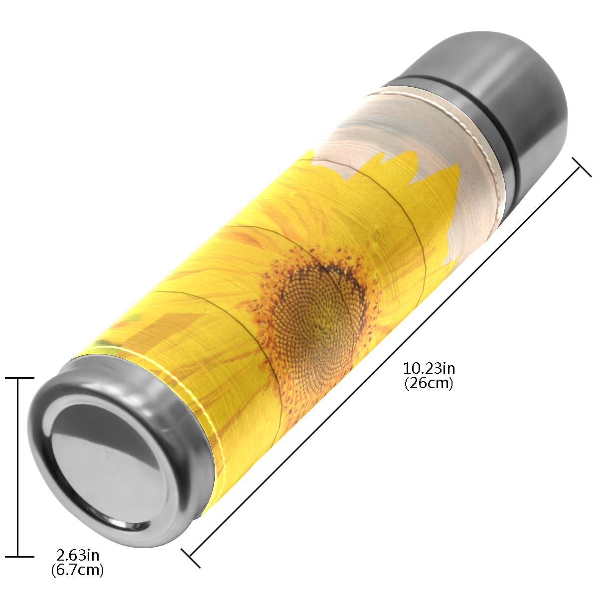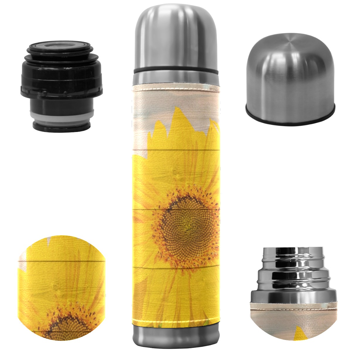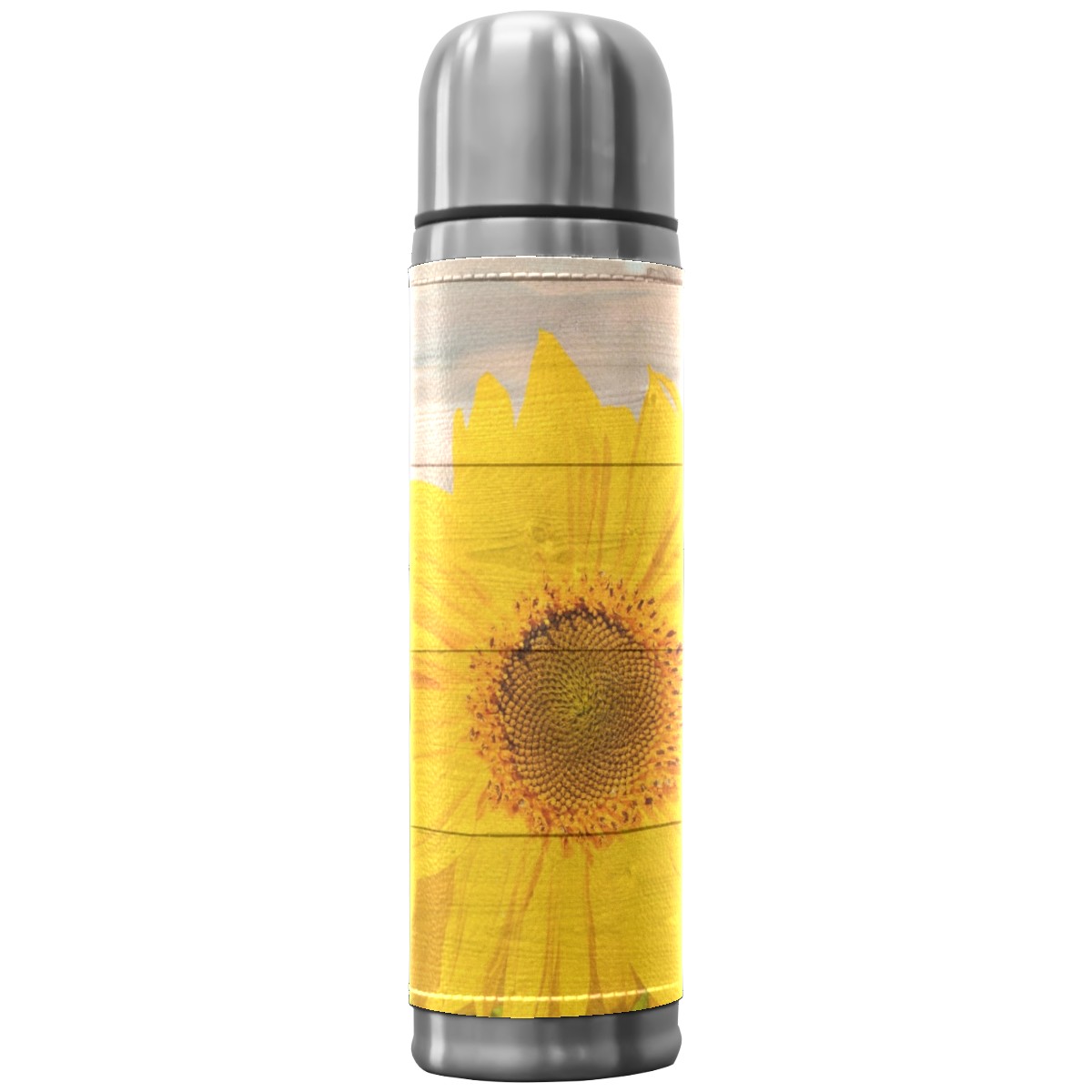 Water Bottle Blooming Yellow Sunflower Grey Wood Stainless Steel PU Leather Vacuum Insulated Travel Mug 17OZ Double Walled Coffee Cup Flask