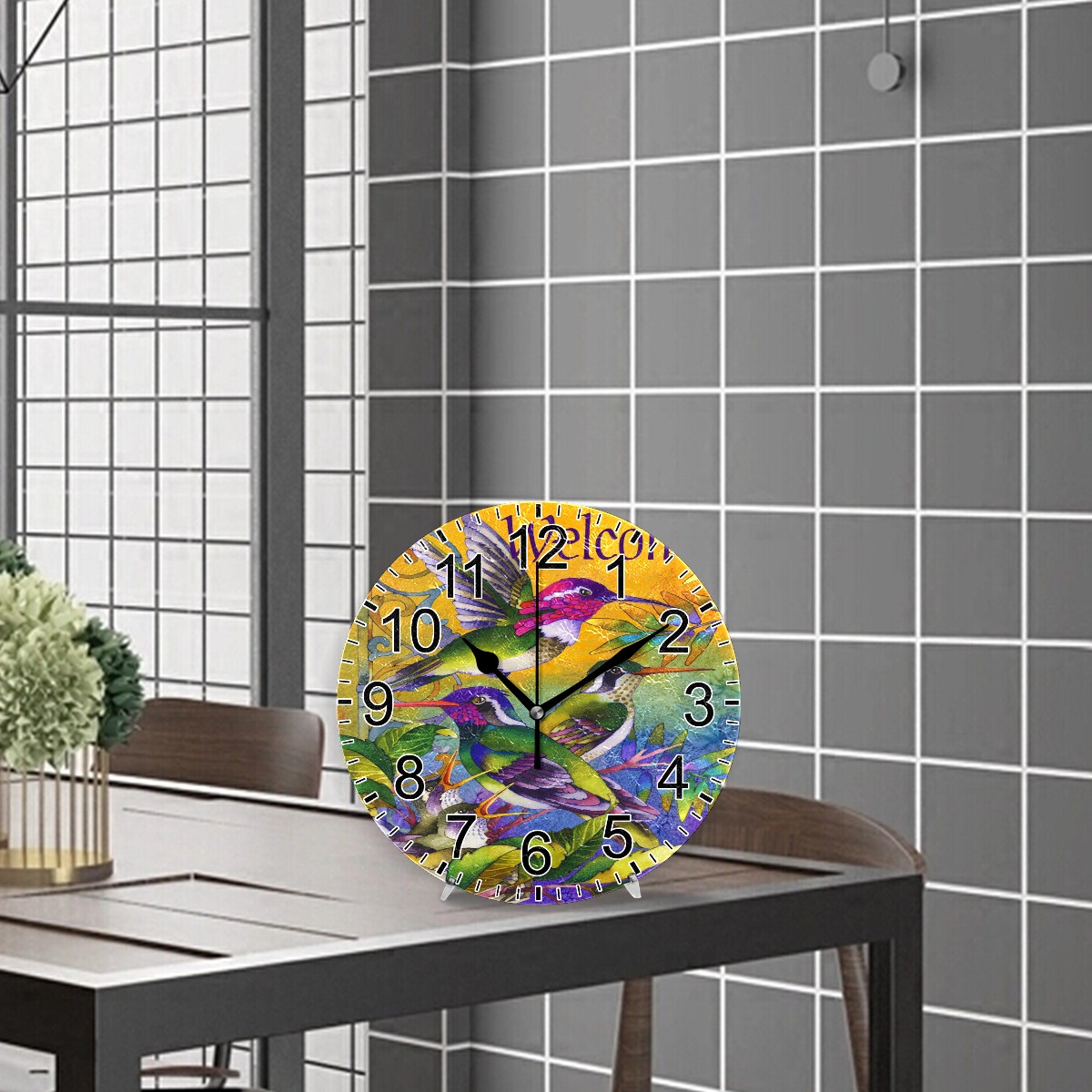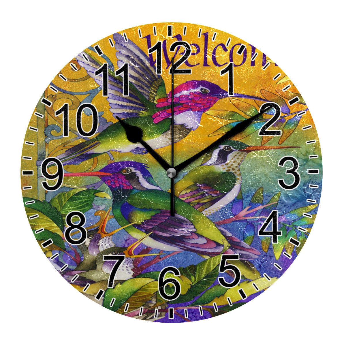 Wall Clock Home Decorative Welcome Colorful Hummingbird Silent Non Ticking Acrylic 10 Inch Office School Round Clock Art