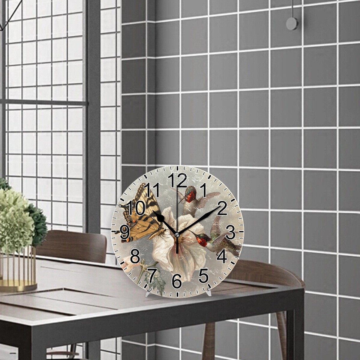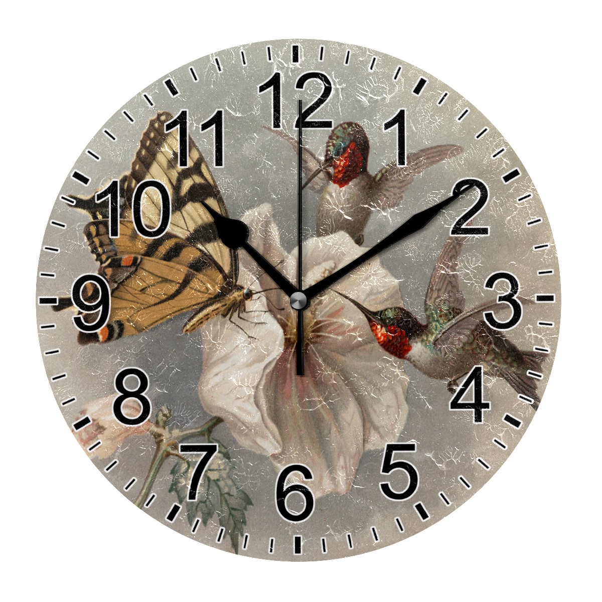 Wall Clock Home Decorative Retro Hummingbirds Lilacs Flower Butterfly Silent Non Ticking Acrylic 10 Inch Office School Round Clock Art