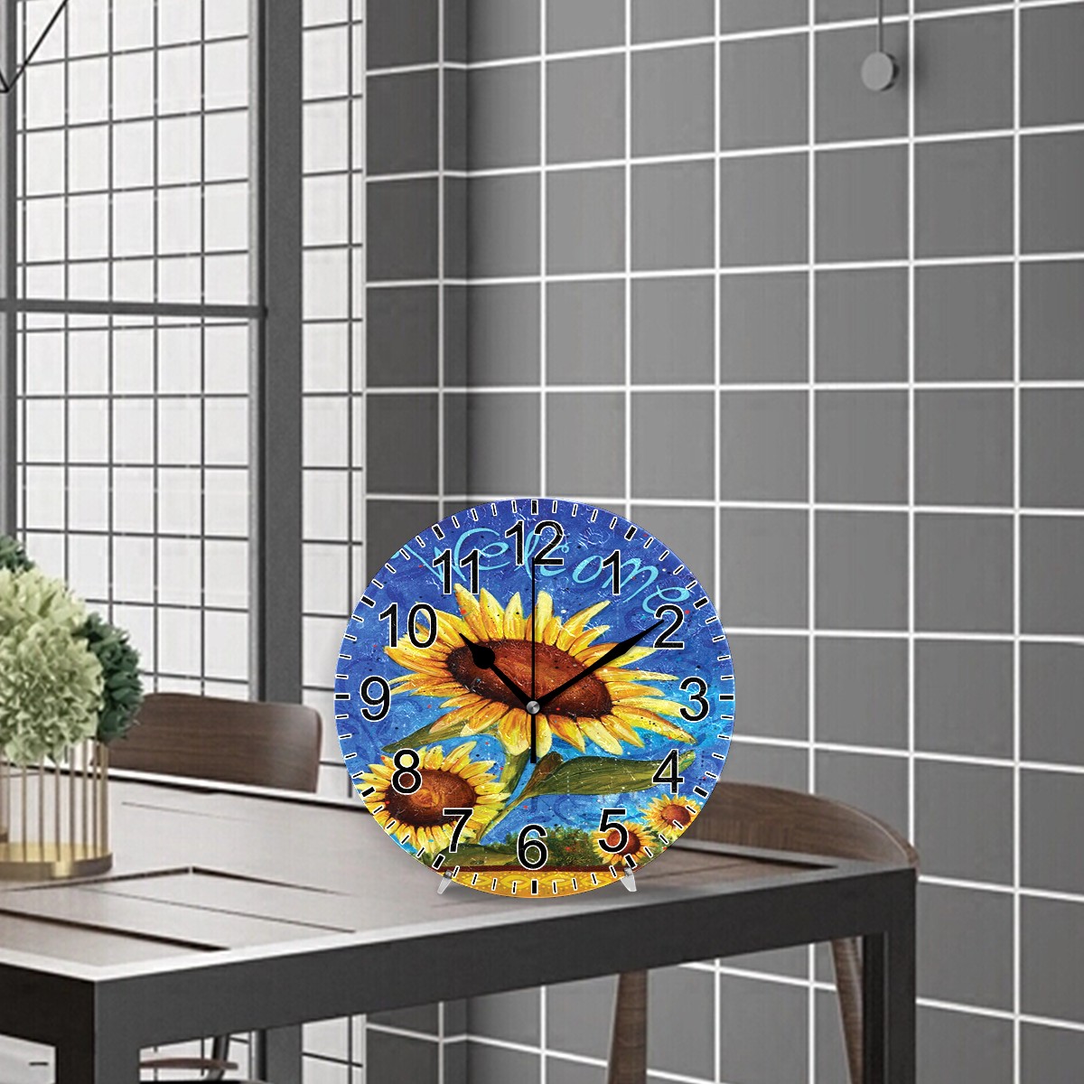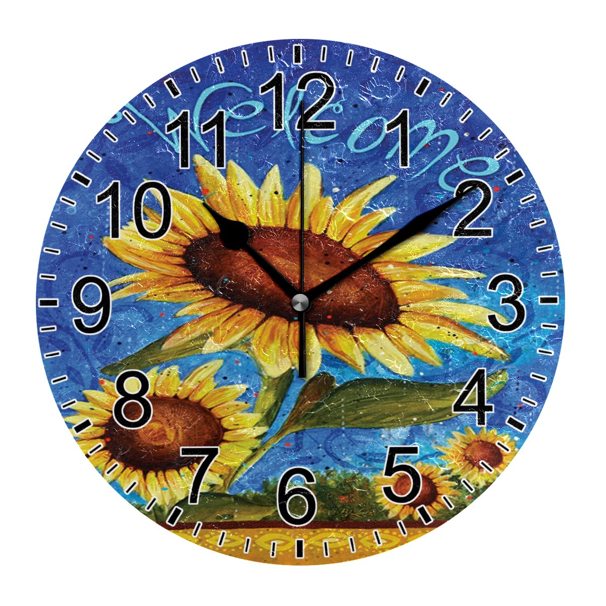 Wall Clock Home Decorative Oil Painting Sunflower Welcome Silent Non Ticking Acrylic 10 Inch Office School Round Clock Art