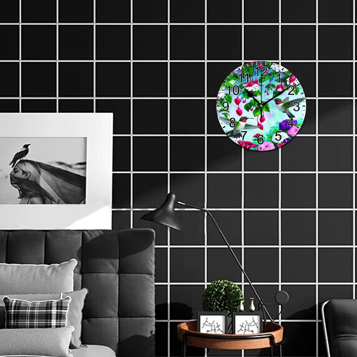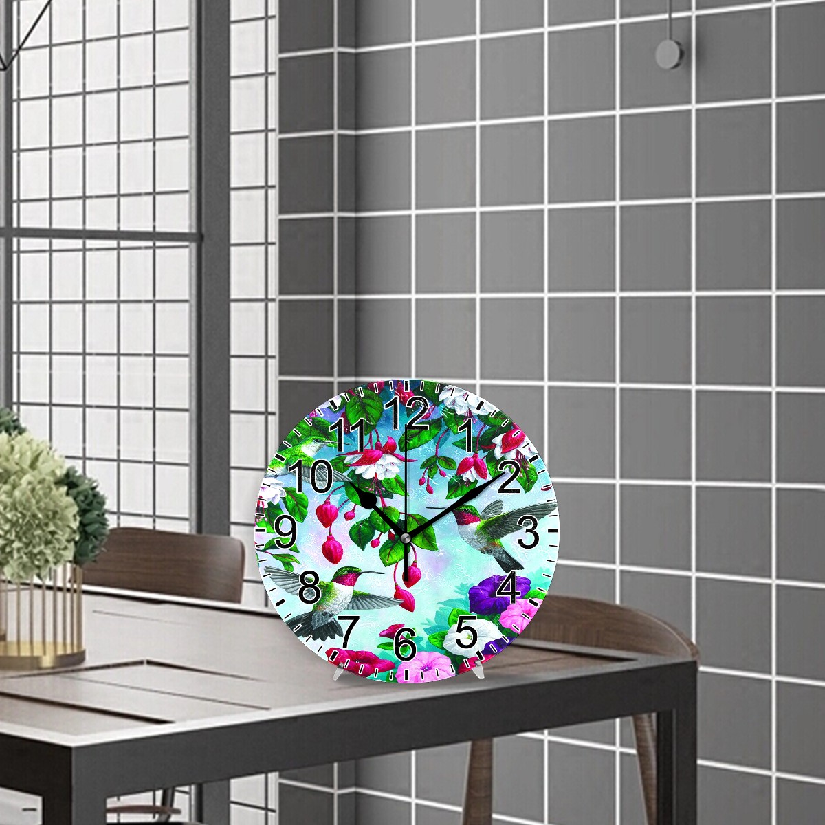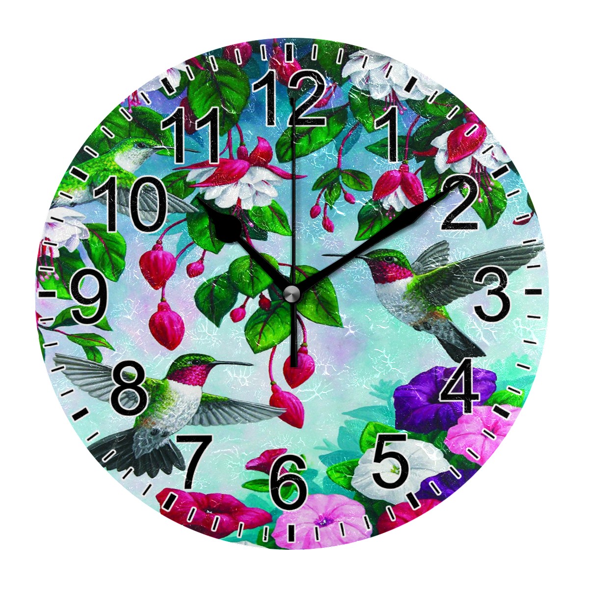 Wall Clock Home Decorative Hummingbird Hibiscus Colorful Birds Silent Non Ticking Acrylic 10 Inch Office School Round Clock Art