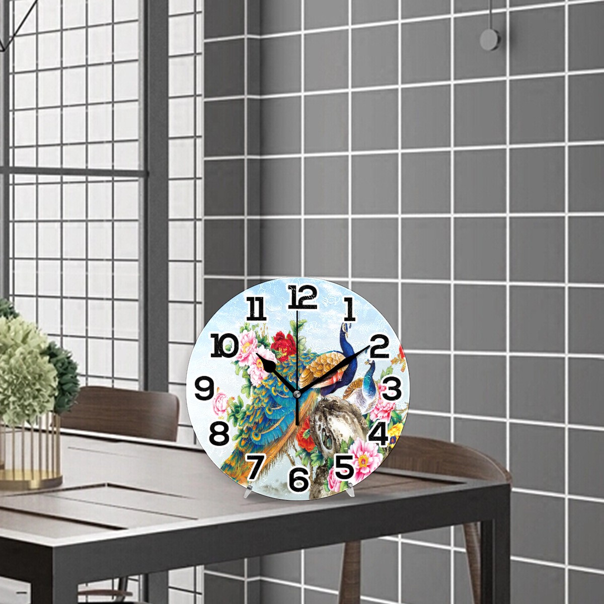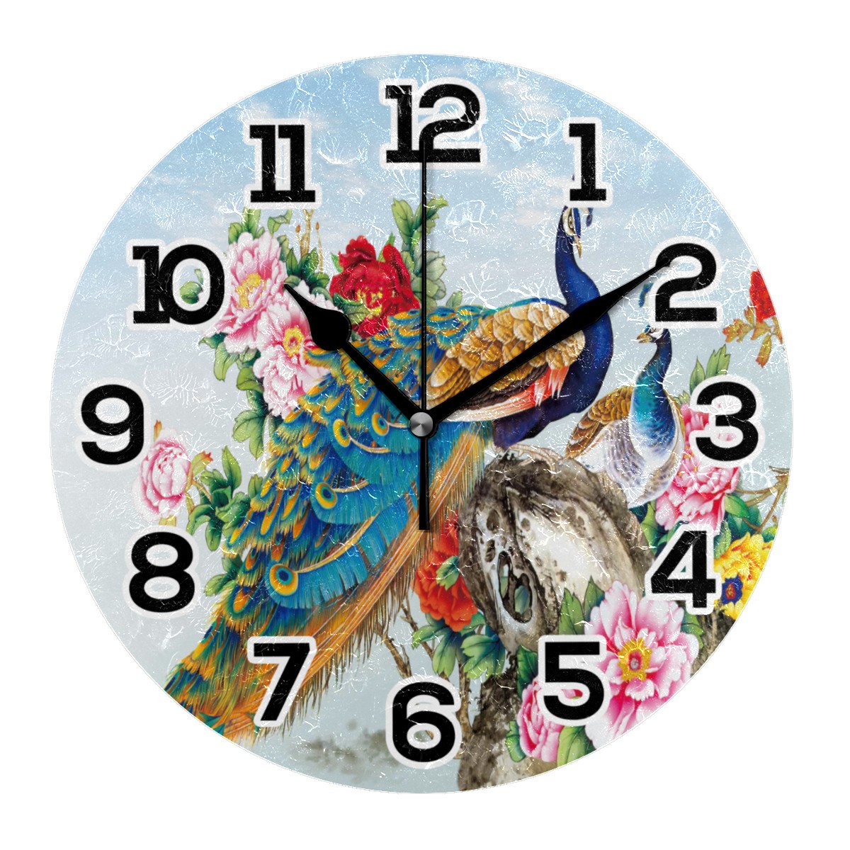 Peacock With Floral Print Clock Wall Decor Acrylic Decorative Round Battery Operated Wall Clocks for Home Bedroom Living Room Decor Silent Non Ticking