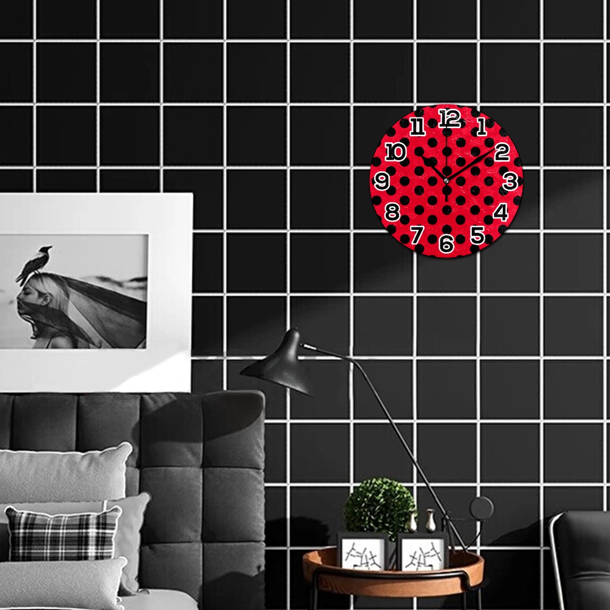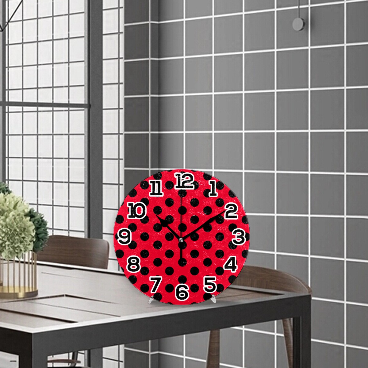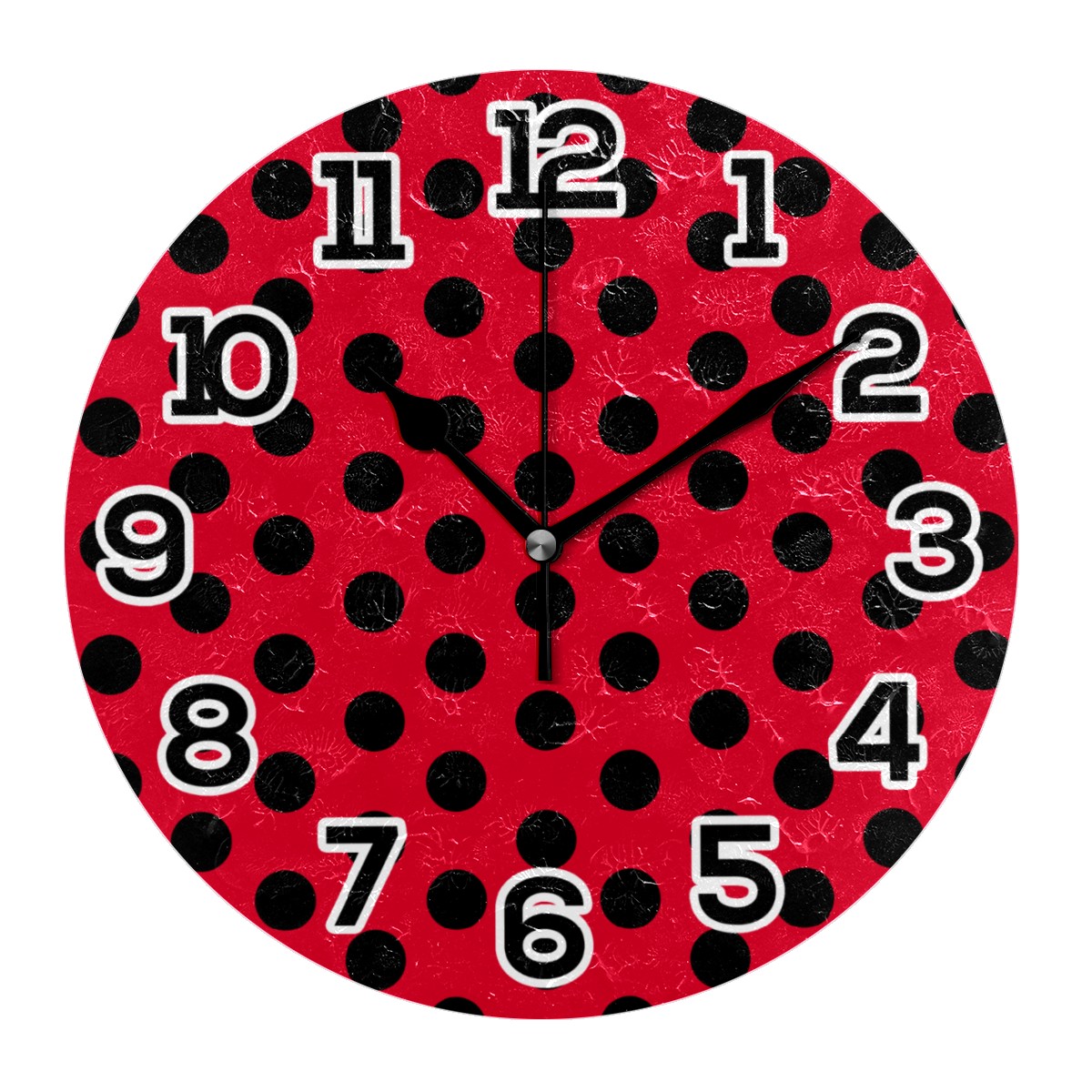 Modern Red Black Polka Dot Geometric Pattern Clock Wall Decor Acrylic Decorative Round Battery Operated Wall Clocks for Home Bedroom Living Room Decor Silent Non Ticking