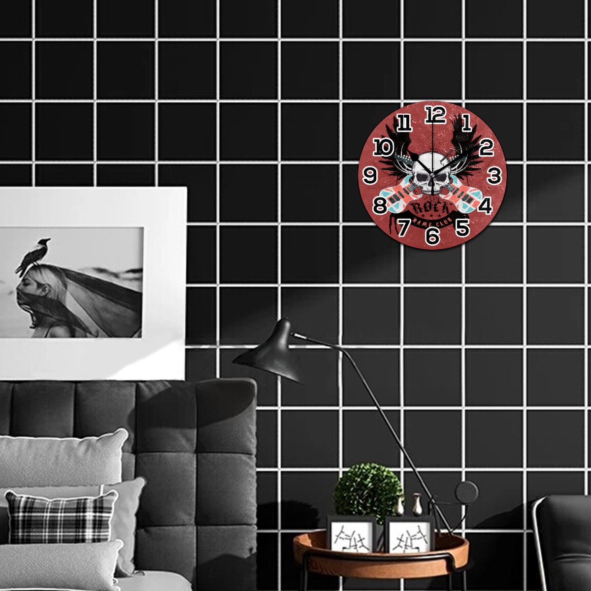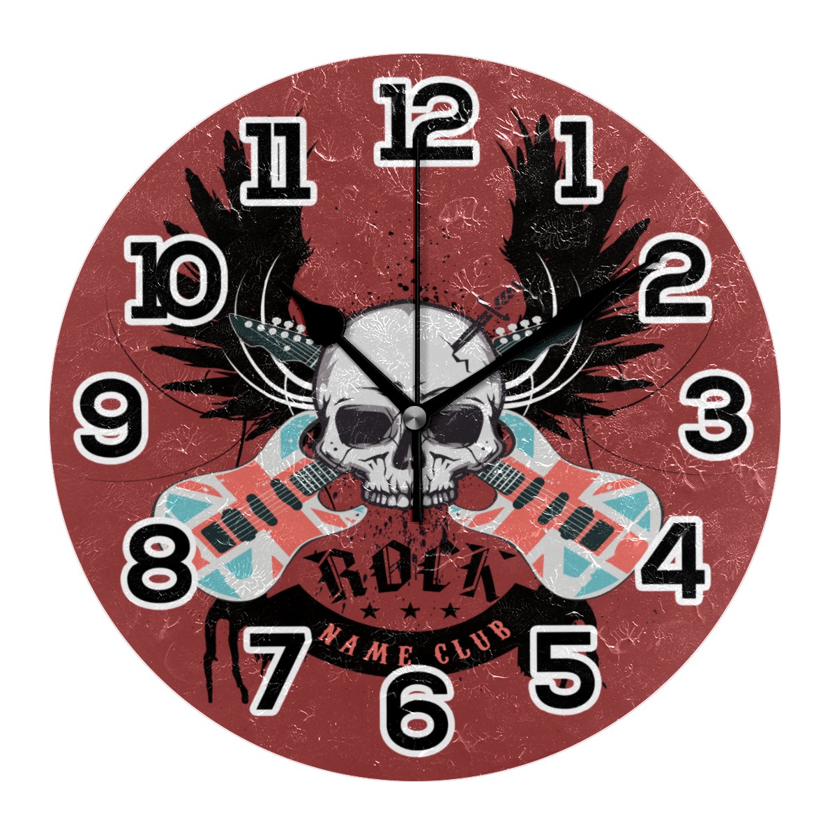 Musical Skull Rock Guitar Disig Clock Wall Decor Acrylic Decorative Round Battery Operated Wall Clocks for Home Bedroom Living Room Decor Silent Non Ticking