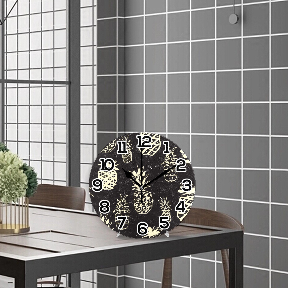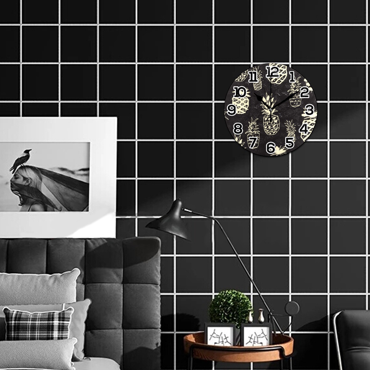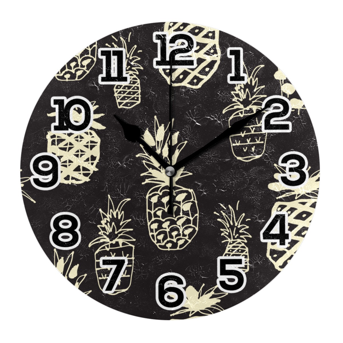Black White Pineapple Pattern Clock Wall Decor Acrylic Decorative Round Battery Operated Wall Clocks for Home Bedroom Living Room Decor Silent Non Ticking