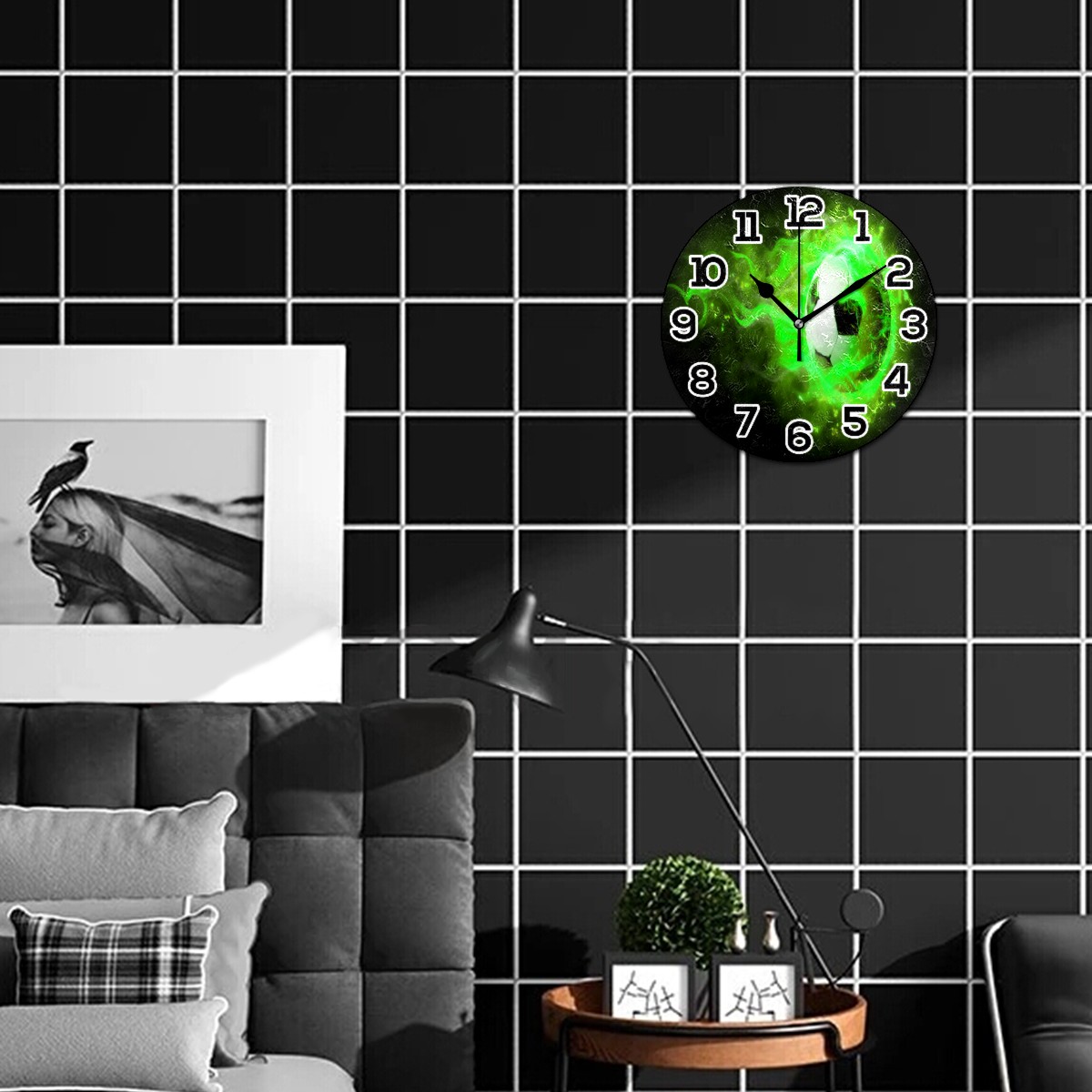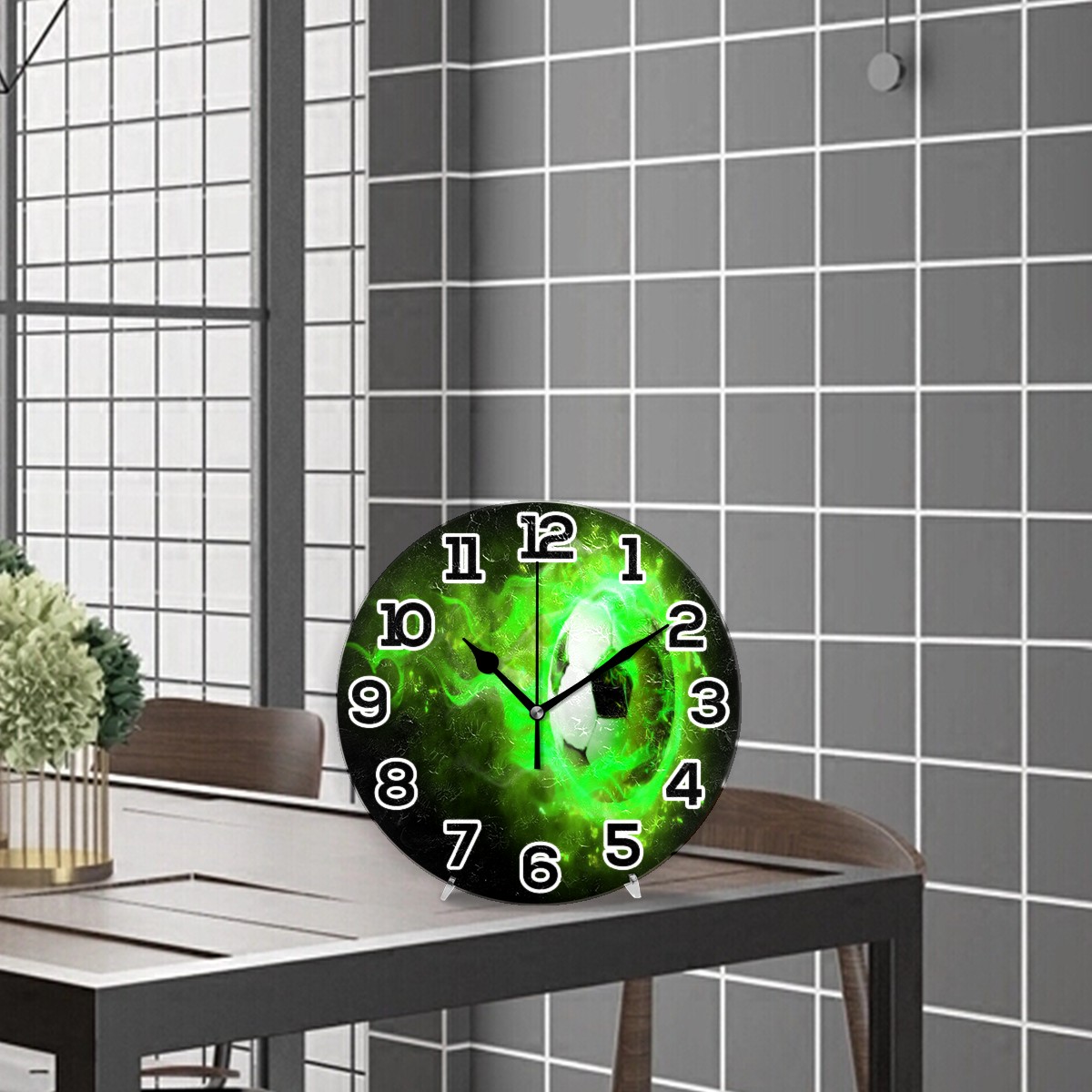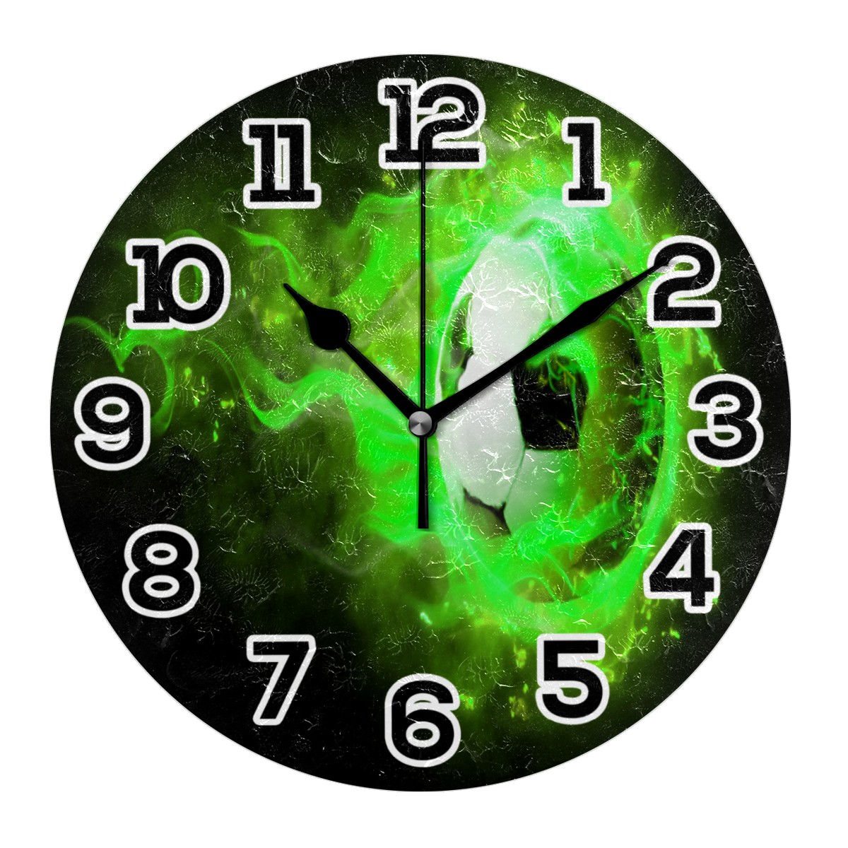 Green Flame Soccer Clock Wall Decor Acrylic Decorative Round Battery Operated Wall Clocks for Home Bedroom Living Room Decor Silent Non Ticking