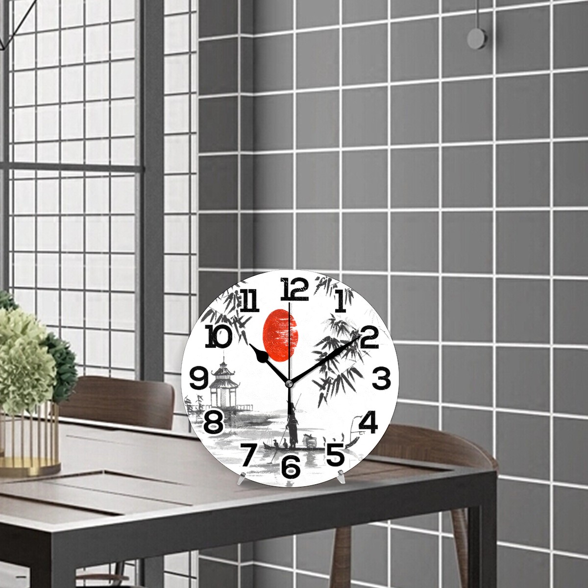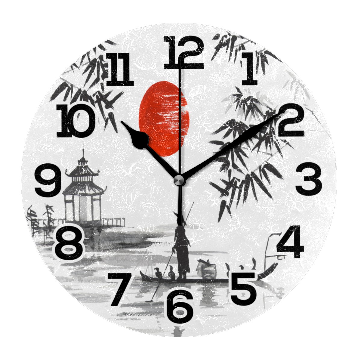 Japanese Traditional Boat Sun Painting Clock Wall Decor Acrylic Decorative Round Battery Operated Wall Clocks for Home Bedroom Living Room Decor Silent Non Ticking