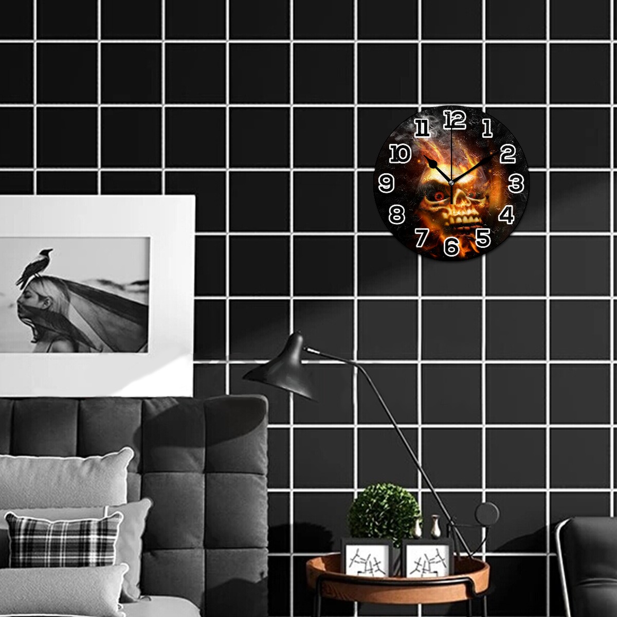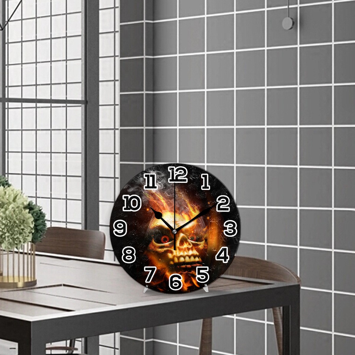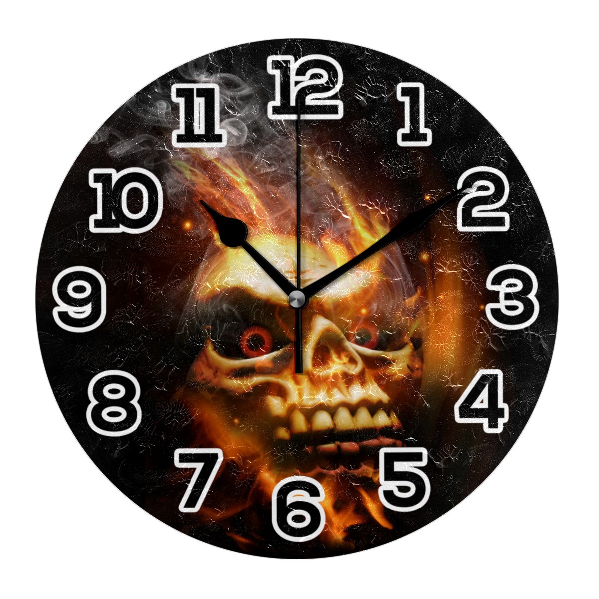 Fire Flame Skull Clock Wall Decor Acrylic Decorative Round Battery Operated Wall Clocks for Home Bedroom Living Room Decor Silent Non Ticking