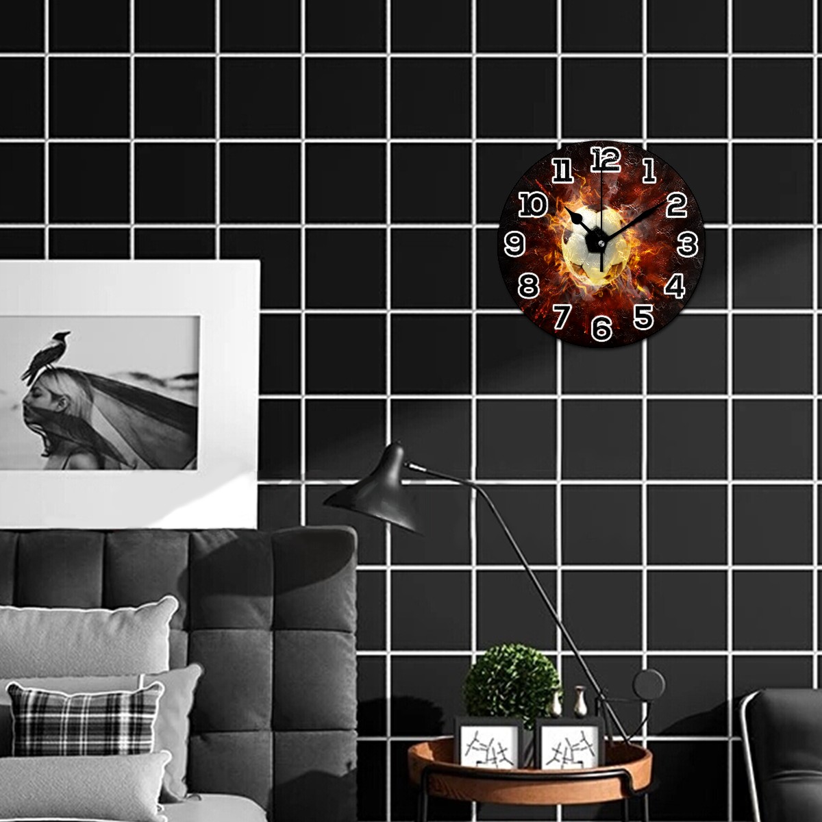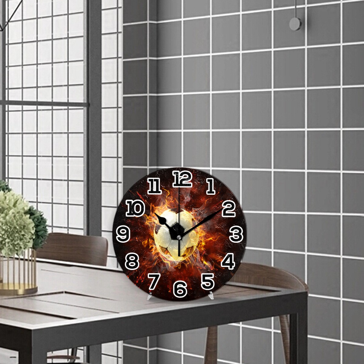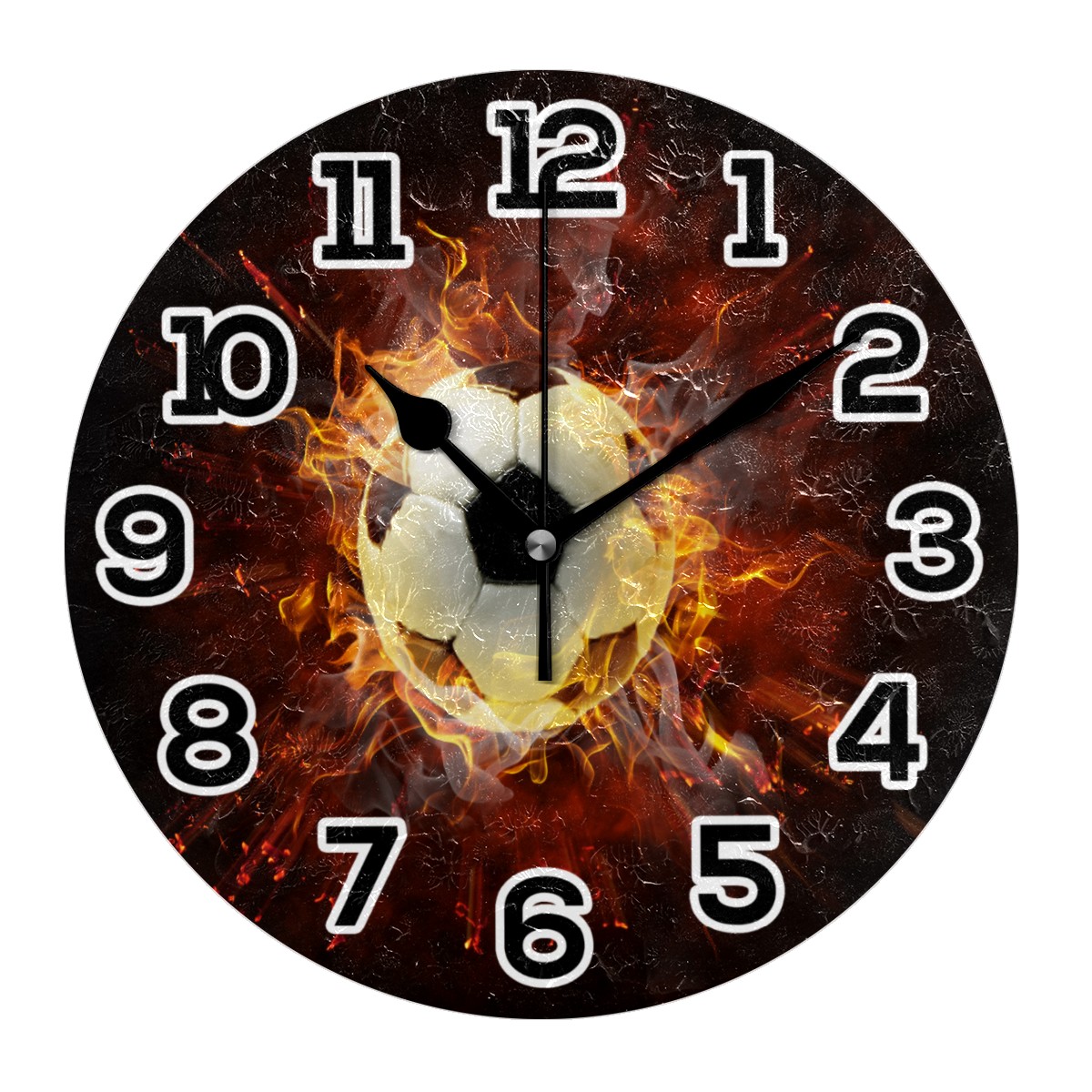 Fire Burning With Football Clock Wall Decor Acrylic Decorative Round Battery Operated Wall Clocks for Home Bedroom Living Room Decor Silent Non Ticking