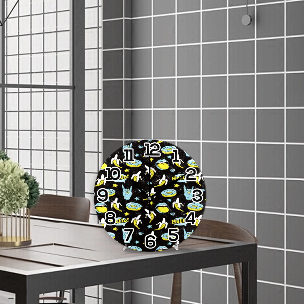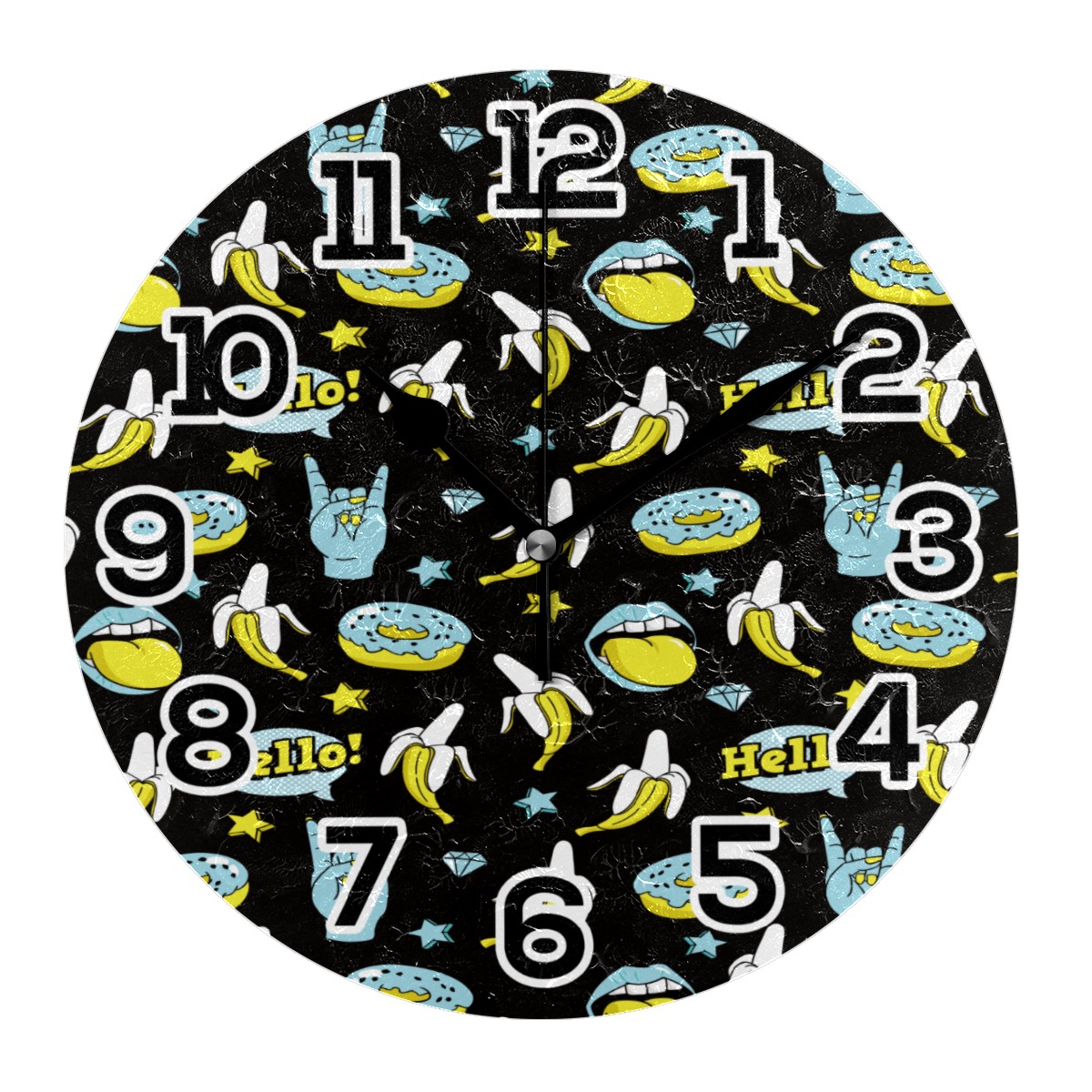 Doodle Funny Donuts Banana Rock Stars Pattern Clock Wall Decor Acrylic Decorative Round Battery Operated Wall Clocks for Home Bedroom Living Room Decor Silent Non Ticking